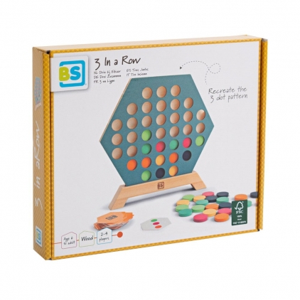 3 pe un rand este un joc de strategie din lemn, interesant si captivant, o reinterpretare simpatica a cunoscutului joc clasic de strategie , œ4 pe un rand, , care ii va distra atat pe copii, cat si pe adulti ore intregi. Scopul jocului este reconstituirea modelului pe tabla de joc hexagonala, urmand imaginile de pe carduri. Dupa ce amesteca cartile cu model cu fata in jos, fiecare jucator selecteaza o carte si o pune cu fata in sus pe masa. Pe rand, plasati strategic jetoanele de lemn colorate in gaurile tablei de joc, urmarind sa reconstituiti modelul de pe card. Cardurile vor fi asezate cu fata in sus pe masa, pentru ca jucatorii sa le vada si sa incerce sa impiedice adversarul sa reconstituie modelul inaintea lor. Primul jucator care reconstituie cu succes 3 carduri castiga partida. Jocul include si un saculet din bumbac pentru depozitarea in ordine a jetoanelor si cardurilor de joc. Jocul contine: o tabla de joc hexagonala din lemn cu suport (cu laturile de 12 cm), 36 de jetoane rotunde din lemn, 30 de carduri, un saculet de depozitare din bumbac. Jocul este fabiricat din placaj si lemn 100% FSC si vopsit cu vopsele non toxice, conform reglementarilor de siguranta a jucariilor EN71ASTM. Designul din lemn adauga o nota de estetica artizanala atemporala iar dimensiunea compacta il face usor de luat si jucat in calatorii. Jocul promoveaza interactiunea sociala si dezvolta gandirea, abilitatile tactice si strategice, cele de rezolvare a problemelor, atentia, coordonarea ochi-mana. Numar jucatori: 2-4 Varsta recomandata: 6 ani+