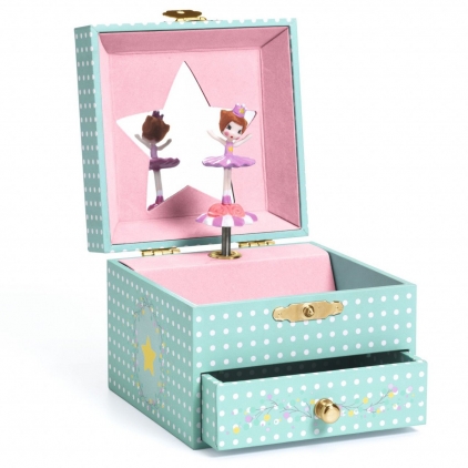 Balerina delicata este o cutie muzicala frumos ilustrata, cu un sertar pentru a depozita bijuterii si secrete. Rotiti cheita, deschideti cutia si... surpriza! O balerina fin sculptata se roteste si isi proiecteaza reflexia intr-o oglinda in forma de oglinda, in sunetul melodiei Invitatie la dans de Carl Maria von Weber. Interiorul cutiei muzicale este captusit cu catifea moale. Melodia dureaza apx 2 min 30 sec. Un obiect decorativ diafan pentru camera unui copil si un cadou ideal la nastere. Dimensiune cutie muzicala: 10.5 x 10.5 x 8.5 cm. Varsta recomandata: 3 ani+. Confectionata din carton, textil si metal. AVERTISMENT: Acest articol nu este jucarie. Nu lasati la indemana copiilor sub 3 ani. A se utiliza sub directa supraveghere a unei persoane adulte. Produca tor: Djeco
