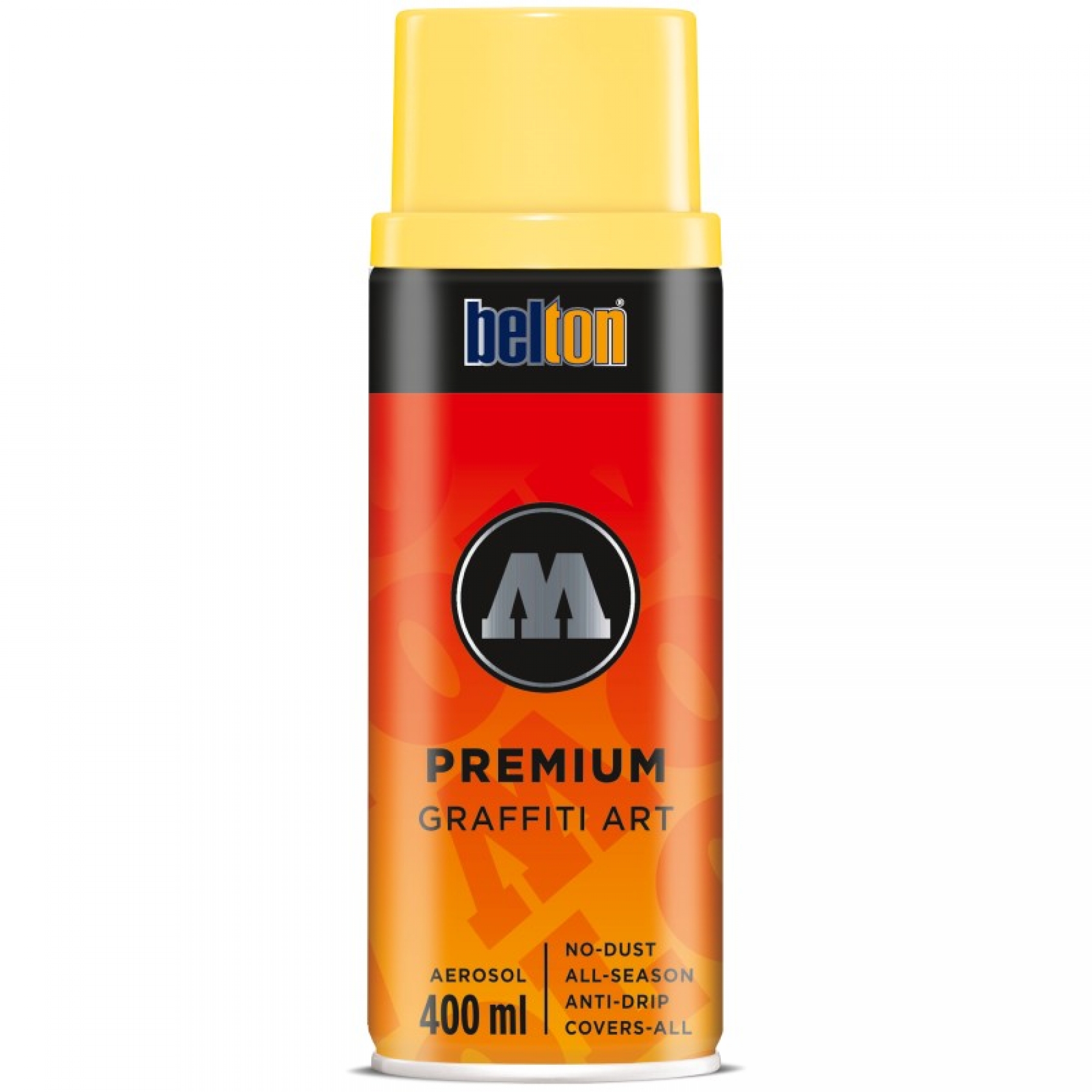 Belton Premium este primul spray optimizat pentru Street Art, dezvoltat de artiști, pentru artiști. Declarat de artiști urbani din toată lumea, cel mai fiabil spray, Belton Premium se remarcă prin culorile cu pigmenți 4x Auto-K™ ce garantează o acoperire perfectă și culori vibrante.Noile spray-uri Belton Premium sunt dotate cu tehnologia Soft Vari Valve și formule îmbunătățite ale vopselelor.- Formulă cu pigmentare puternică (pigment procesat prin multiple operațiuni mecanice) - Efect semi-gloss - Opacitate ridicată - Permanent - Cea mai înaltă rezistență la lumina ultravioletă și intemperii - Uscare rapidă și adeziune ridicată la suprafața pe care este pulverizat (compuși nitro-alchidali) - Pentru majoritatea suprafețelor - Pentru uz în interior și exterior - 252 nuanțe de culoare - Presiune constantă până la terminarea conținutului - Tehnologii MOLOTOW patentate: anti-drip™, no-dust™, covers-all™, all-season™ (de la -10°C până la +50°C) - Identificare ușoară a culorilor, mulțumită tehnologiei DoubleFunctionCap în culori reale - Valvă cu sistem unic Flowmaster - Capete de pulverizare interschimbabile - Funcționare optimă cu tehnica de aerograf - Compatibil cu spray-urile și markerele MOLOTOW din alte game - Fabricat în Germania - Cantitate: 400ml