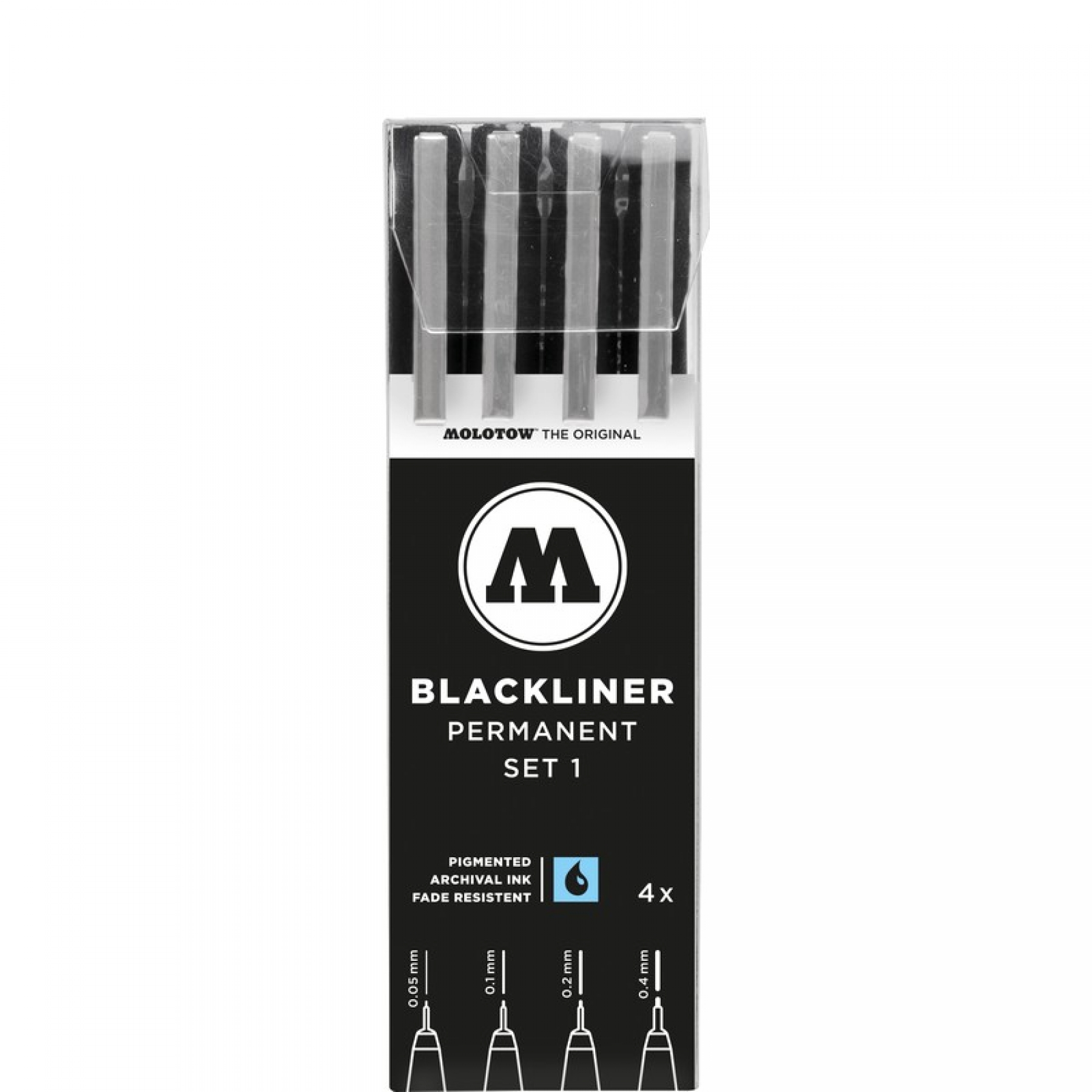 MOLOTOW Blackliner este primul produs realizat prin cooperarea dintre Schneider GmbH și MOLOTOW.Utilizabil pentru lucrări grafice, schițe, detalii, desen tehnic sau pur și simplu ca instrument de scris, Blackliner, fabricat în Germania, dispune de un tuș permanent, rezistent la apă și la substanțe chimice.Vârfurile robuste tip daltă sau rotunjite de 0.05 - 1.0 mm sunt protejate de un manșon metalic și garantează linii exacte, de finețe — perfecte pentru contururi.Datorită funcției „Cap off”, fineliner-ul este protejat de uscare timp de 4 săptămâni.Blackliner dispune de o suprafață mată, aderentă, de înaltă calitate.Setul 1 este alcătuit din 4 finelinere cu următoarele grosimi de scriere: 0.05 mm, 0.1 mm, 0.2 mm, 0.4 mm.- Pe bază de apă