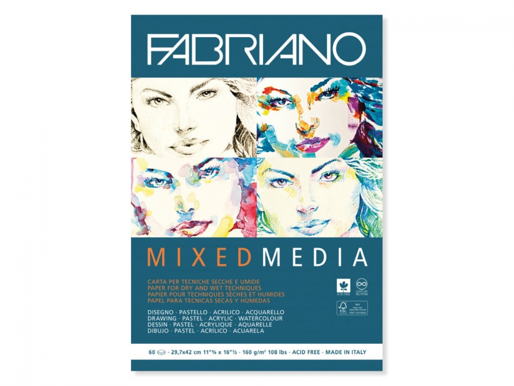 Blocurile Fabriano Mixed Media, sunt special gândite pentru a facilita tehnici mixte. Fiind foarte versatile, prin urmare, sunt ideale pentru tehnicile umede și uscate. Sunt perfecte pentru vopsele acrilice sau acuarela ori utilizate în tehnicile pastel sau desen cu creioane colorate.Hârtia de granulație medie, de 160 g/m2, este suportul ideal pentru elevi și studenți și artiștii semi-profesioniști.Fabriano Mixed Media este un produs versatil, multifuncțional, care combină caracteristicile hârtiei de acuarelă și acrilice cu cele ale hârtiei de desen.Produs 100% din E.C.F. pulpa (fără clor elementar), F.S.C. certificat (© 1996 Forest Stewardship Council A.C.) din păduri gestionate în mod responsabil, respectând standardele de mediu, sociale și economice. Dimensionarea internă și externă fac această hârtie rezistentă la ștergerile repetate și la îmbătrânire.