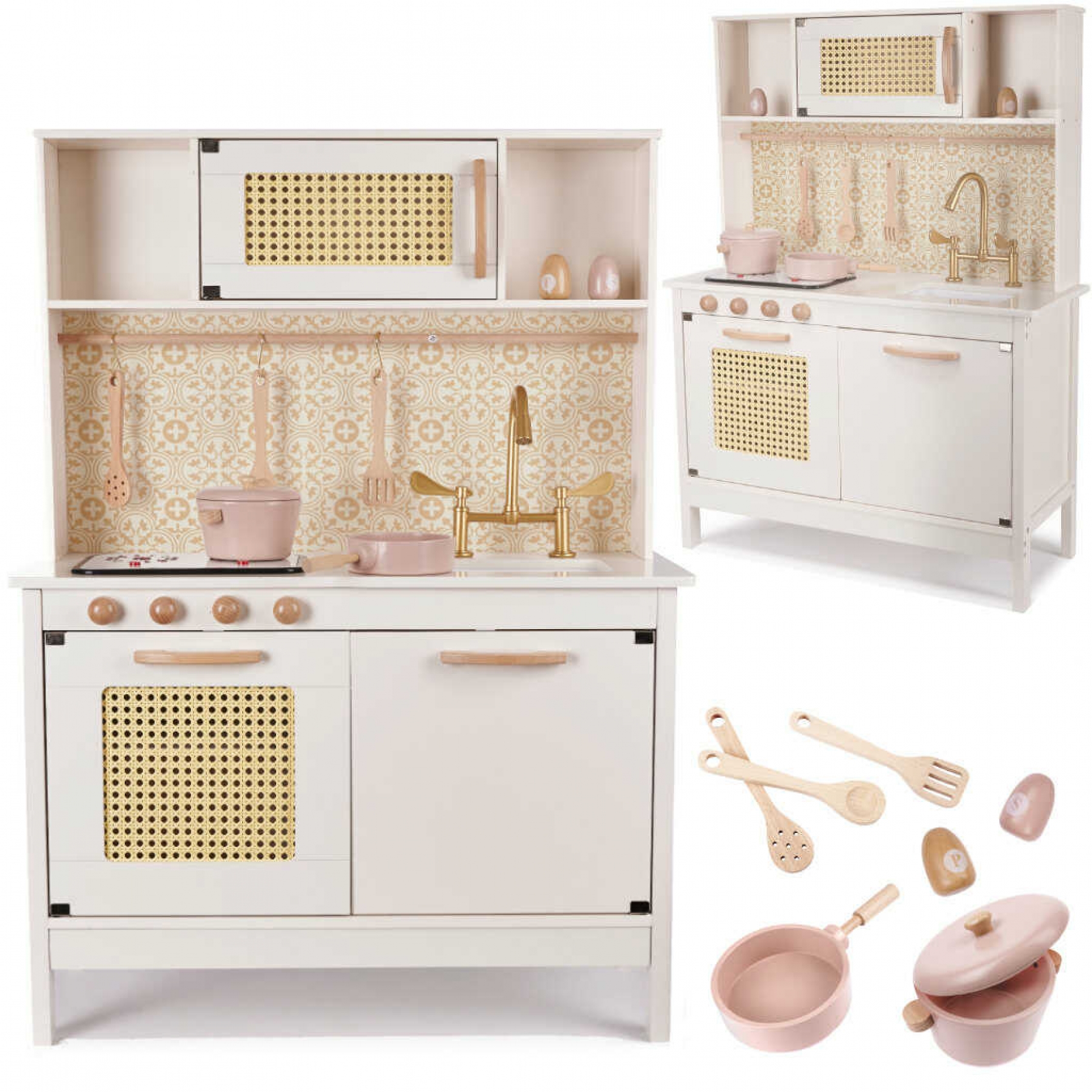 Bucatarie Pentru Copii, Din Lemn de Calitate Superioara, Include Plita cu Doua Arzatoare, Cuptor, Chiuveta, cu Spatiu de Depozitare, Cuptor cu Microunde, Accesorizata Complet, Vopsea pe Baza de Apa, 68 x 29 x 100 cm. Ofera-i copilului tau o experienta de joaca educativa si captivanta cu aceasta bucatarie pentru copii din lemn de inalta calitate, inspirata din stilul retro. Este echipata cu toate functiile esentiale pe care le-ai gasi intr-o bucatarie reala, inclusiv efecte sonore si de lumina, perfecte pentru micii bucatari. Caracteristici principale: Design realist si stil retro atemporal: Aceasta bucatarie pentru copii este special conceputa cu un design retro elegant, combinand elemente de alb, auriu si roz pudrat . Este perfecta pentru micii iubitori de gatit si pentru cei pasionati de estetica Boho sau Scandi . Va arata minunat in orice camera de joaca sau dormitor pentru copii. Functii interactive cu efecte de lumina si sunet: Arzatoarele au un panou detasabil care emite sunete si lumini atunci cand copilul apasa butoanele, imitand astfel o bucatarie adevarata. Copiii vor invata cum sa foloseasca in mod sigur aragazul si sa isi dezvolte abilitatile practice, fara riscuri. Accesorii incluse pentru o experienta completa: Setul de bucatarie include toate accesoriile necesare pentru o experienta realista: oala cu capac , tigaie , recipient pentru sare si piper , strecuratoare , spatula , si lingura . Copiii se vor bucura de ore intregi de joaca creativa, invatand sa pregateasca , žmancaruri, delicioase. Materiale sigure si durabile: Bucataria este fabricata din MDF de inalta calitate , lemn si plastic, vopsita cu vopsea non-toxica . Fiecare element a fost slefuit cu grija pentru a asigura siguranta copilului in timpul jocului. Jucariile din lemn sunt o alegere ecologica si durabila, fiind concepute sa reziste mai multor generatii de copii. Detalii functionale pentru o joaca realista: Bucataria este dotata cu chiuveta adanca cu robinet , butoane rotative , cuptor cu plasa , si balustrada cu carlige pentru ustensilele de bucatarie. Usile dulapurilor se deschid, iar copilul tau va invata cum sa organizeze si sa mentina curatenia intr-o bucatarie. Educatie prin joc: Prin jocul de rol, copiii invata notiuni de baza despre gatit, organizare si curatenie. Jocul cu bucataria ajuta la dezvoltarea abilitatilor motorii fine si la imbunatatirea coordonarii mana-ochi. De asemenea, copiii vor invata cum functioneaza electrocasnicele, fara riscuri reale. Beneficiile acestei bucatarii pentru copii: Imitatie realista: Copiii pot imita activitatile zilnice ale parintilor in siguranta, invatand despre gatit si organizarea bucatariei. Dezvoltare motorie: Utilizarea ustensilelor de bucatarie si manevrarea accesoriilor contribuie la dezvoltarea abilitatilor motorii fine. Materiale eco-friendly: Bucataria este realizata din materiale naturale, fiind sigura pentru copii si prietenoasa cu mediul inconjurator. Detalii tehnice: Material: MDF, lemn, plastic Dimensiuni bucatarie: 68 cm (latime) x 29 cm (adancime) x 100 cm (inaltime) Inaltime blat: 51 cm Accesorii incluse: Oala cu capac, tigaie, strecuratoare, spatula, lingura, recipient pentru sare si piper Alimentare: 2 baterii AAA (neincluse) Recomandata pentru varsta: 3+ ani De ce sa alegi aceasta bucatarie pentru copilul tau? Aceasta bucatarie retro din lemn pentru copii este mai mult decat o simpla jucarie. Este o sursa de educatie si creativitate, care ii incurajeaza pe cei mici sa exploreze activitatile casnice intr-un mod sigur si distractiv. Designul sau rafinat si functionalitatea completa o fac cadoul ideal pentru micii bucatari in devenire.