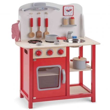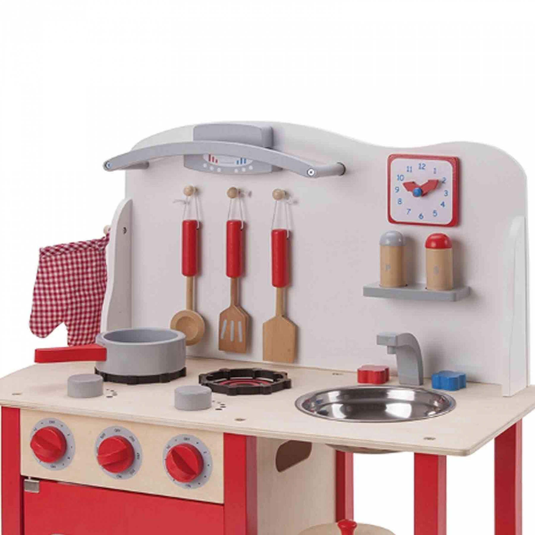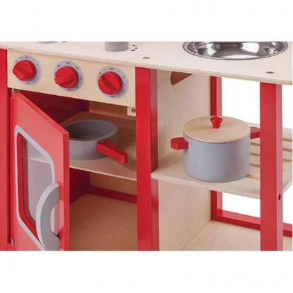 Acest set dezvolta imaginatia copiilor si aptitudinile inter si intrapersonale. Folosindu-si imaginatia, cei mici pot crea meniuri si pot gati pentru intreaga familie. Aceasta bucatarie este perfecta pentru o joaca impreuna cu toti prietenii si contine tot ce ii este necesar. Setul Contine: o chiuveta detasabila cu robinet; Plita cu doua arzatoare si doua butoane care emit sunete atunci cand aprinzi focul; Cuptor cu usa prin care se poate vedea; Rafturi pentru depozitare; Ceas cu ace mobile; O oala cu capac; O tigaie; 3 ustensile de gatit; Manusa de protectie pentru cuptor; 2 recipiente pentru sare si piper. Inaltimea blatului de lucru este de 46 cm. Caracteristici: Bucataria este fabricata din lemn. Dimensiuni: 60 x 30 x 78 cm Varsta recomandata: 3 ani + Functie: Cu sunete Avertismente! Nu lasati ambalajele jucariilor produselor la indemana copiilor. Indepartati orice ambalaj al jucariei produsului inainte de a da jucaria produsul copilului. Va rugam sa supravegheati copilul in timp ce se joaca foloseste acest produs. Pastrati instructiunile si etichetele pentru referinte viitoare. Pastrati jucaria produsul departe de foc, feriti jucaria produsul de temperaturi ridicate si umiditate. Imaginile au caracter informativ. Nuanta, tonul si intensitatea culorii pot varia in functie de monitor.