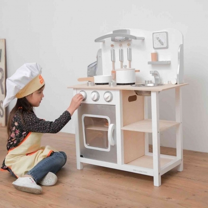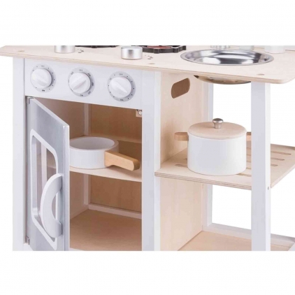 O bucatarie de vis pentru micii bucatari iubitori ai gastronomiei Folosindu-si imaginatia, cei mici pot crea meniuri si pot gati pentru intreaga familie. Aceasta bucatarie este perfecta pentru o joaca impreuna cu toti prietenii si contine tot ce ii este necesar unui bucatar. Bucataria Contine: O chiuveta detasabila cu robinet Plita cu doua arzatoare si doua butoane care emit sunete atunci cand aprinzi focul Cuptor cu usa prin care se poate vedea Rafturi pentru depozitare Ceas cu ace mobile O oala cu capac O tigaie 3 ustensile de gatit Manusa de protectie pentru cuptor 2 recipiente pentru sare si piper. Caracteristici: Inaltimea blatului de lucru: 46 cm Dimensiuni: 60 x 30 x 76 cm Acest set dezvolta imaginatia copiilor si aptitudinile inter si intrapersonale! Varsta recomandata : 3 ani+ Avertismente! Nu lasati ambalajele jucariilor produselor la indemana copiilor. Indepartati orice ambalaj al jucariei produsului inainte de a da jucaria produsul copilului. Va rugam sa supravegheati copilul in timp ce se joaca foloseste acest produs. Pastrati instructiunile si etichetele pentru referinte viitoare. Pastrati jucaria produsul departe de foc, feriti jucaria produsul de temperaturi ridicate si umiditate. Imaginile au caracter informativ. Nuanta, tonul si intensitatea culorii pot varia in functie de monitor.