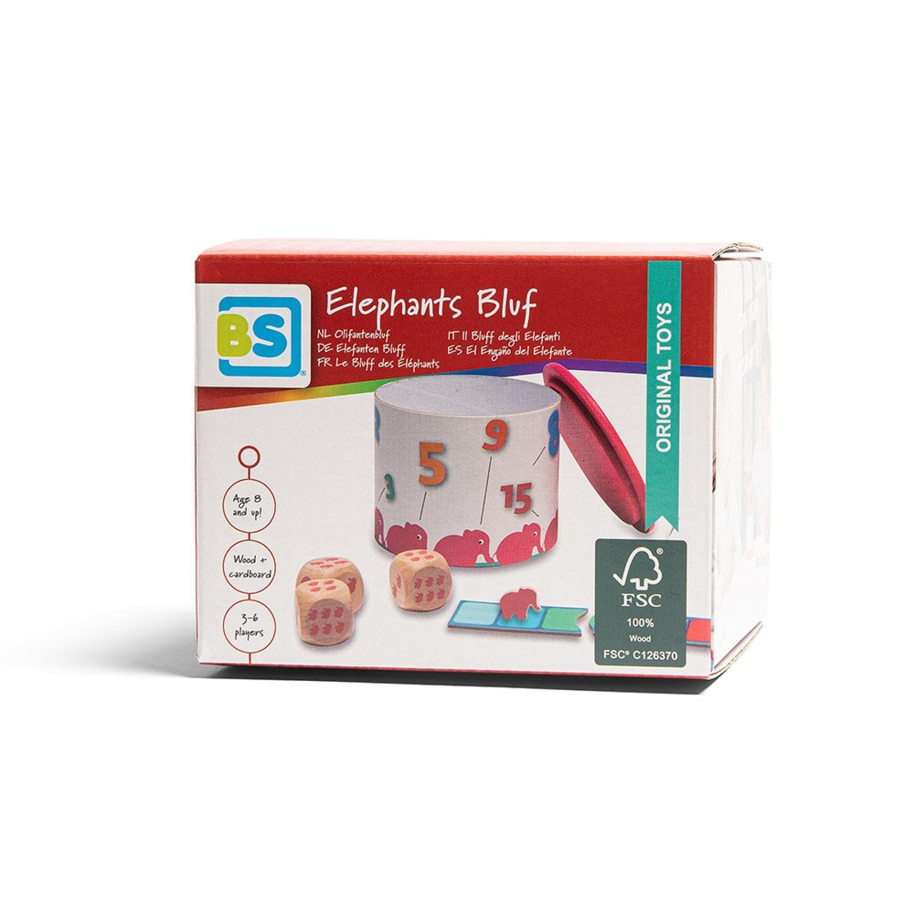 Arunca cele trei zaruri in cutie si numara cati elefanti sunt. Inchide capacul si da cutia mai departe urmatorului jucator, in timp ce ii spui cati elefanti roz sunt inauntru. Poti sa ii spui adevarul sau nu. Ai dreptul de a induce in eroare celalalt jucator. Poti spune ca sunt mai multi sau mai putini elefanti. La randul lui, jucatorul poate sa te creada sau nu. Trebuie sa-i spui celuilalt jucator cel putin cu un elefant in plus. Daca jucatorul A spune 11 elefanti, jucatorul B va transmite jucatorului C 12 elefanti sau mai multi. Daca numarul de elefanti nu se fla in cutie, trebuie sa-l induci in eroare pe celalalt jucator, sa te creada. Asigura-te ca arunci zarurile corect sau foloseste-ti abilitatile de cacealma pentru ca urmatorul jucator sa te creada! Poti sa blufezi si sa-i incurci pe ceilalti jucatori? In acest joc amuzant marca BS Toys, nu exista castigator, doar un jucator care pierde jocul. Jocul contine: 1 cutie din carton gros cu capac (10.5 x 8 cm), 3 zaruri mari din lemn (3 x 3 cm), 6 table de joc din carton, formate din 2 parti (15 x 4 cm), 6 elefanti din carton. Numar jucatori: 3 - 6 Dimensiuni cutie: 12 x 12 x 9 cm Varsta recomandata: 8 ani+