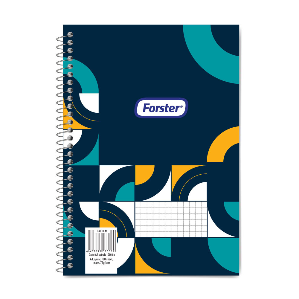 Caiet format A4, cu spirala metalica, 100 file, liniatura matematica. Hartie de 75 g/mp. Coperta dorsala este din carton gros, rigid.