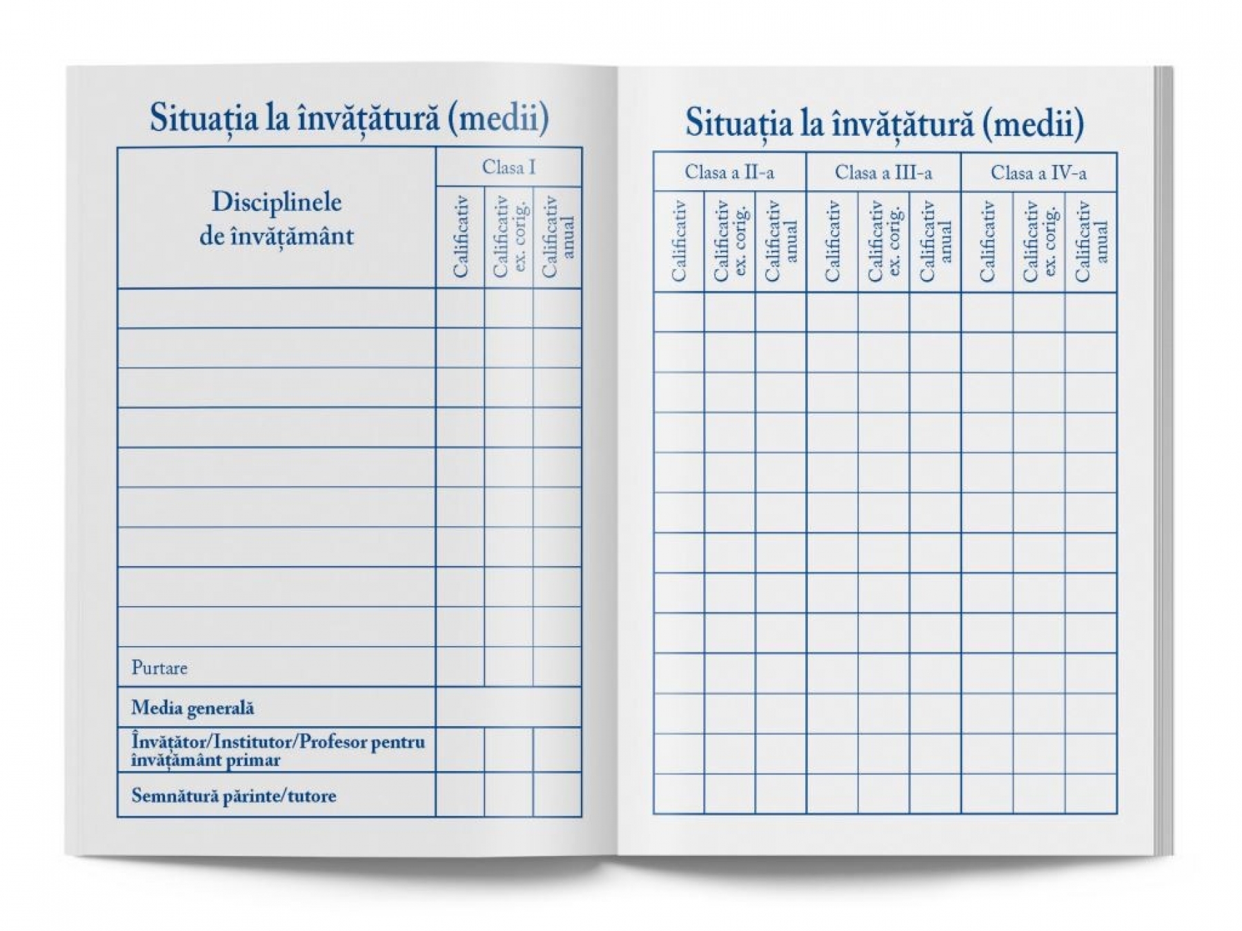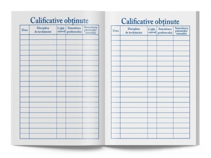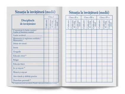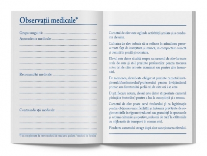 Interior: 32 pagini, tipar cu albastru, hârtie offset de 80 g
