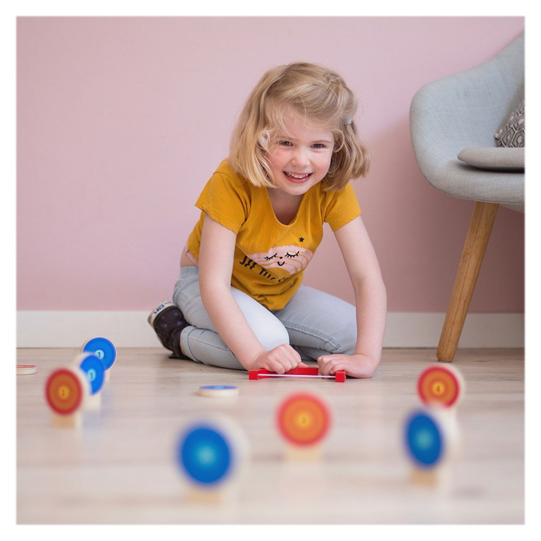 Jocul poate fi jucat de catre doi jucatori sau doua echipe. Jocul contine: 15 tinte cu puncte pe ele, 2 arcuri is 2 pucuri. Scopul jocului Color Targets este de a colecta cat mai multe puncte posibile. Vei obtine puncte doborand tintele si facandu-le sa cada cu culoarea echipei tale in sus. Alegeti suprafata pe care veti juca, aceasta putand fi o podea neteda sau o masa. Fiecare echipa alege culoarea cu care va juca si arcul corespunzator culorii. Plaseaza tintele pe rand in pozitie verticala, oriunde pe terenul de joc. Poti decide unde si cum(cu ce culoare in fata) le plasezi. Pentru prima tragere, alege orice tinta situata la marginile terenului de joc. Indreapta pucul catre tinta aleasa si incerca sa o lovesti in asa fel incat sa cada cu culoarea ta in sus. Dupa ce ai tras, lasa pucul in pozitia in care a ramas. Acum este randul celeilalte echipe care, la randul ei, va trebui sa ocheasca tintele de la marginea suprafetei de joc. La fel ca la jocul de golf, jucatorul va trebui sa traga cu pucul din locul in care acesta a ramas la lovitura precedenta. Tintele care au fost rasturnate, vor ramane in acea pozitie pe suprafata de joc, astfel putand constitui un obstacol in calea doborarii altor tinte. Cand toate tintele au fost doborate, jocul ia sfarsit. Acum, numara toate punctele de pe tintele care au cazut cu culoarea echipei tale in sus. Echipa cu cele mai multe puncte, castiga! Daca nu ai chef sa aduni punctele, poti numara doar tintele in sine. Jocul este realizat din placaj de lemn. Jocul le va dezvolta copiilor abilitatile de aruncare la tinta, coordonarea ochi-mana, indemanarea, rationamentul vizual, perceptia spatiala, concentrarea si precizia. Dimensiune tinta: 6 x 7 cm Dimensiune puc: 6 cm diametru, dimensiune arc: 9.5 x 16 cm Dimensiune ambalaj: 22 x 4 x 22 cm Varsta recomandata: 6 ani+