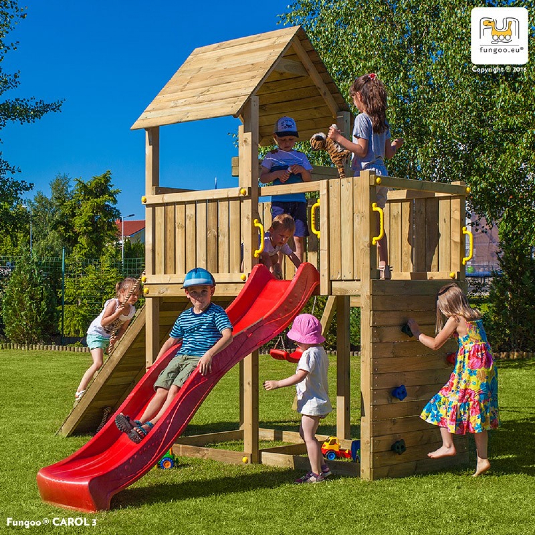 Include: , tobogan 2.2 m , perete de catarat cu pietre ,,profesionale,, , elemente din metal pentru solidificare , leagan , zona de catarat cu funie cu noduri , cutie pentru nisip , ancore pentru sol , manere de prindere Pachetul contine : , set de instrumente de asamblare , instructiuni de instalare Lemnul : Atent selectionat, tratat uv si antidaunatori,vopsit. Garantie 10 ani Complexul de joaca este recomandat pentru uz rezidential, si se poate folosi de 1 - 5 copii in acelasi timp.