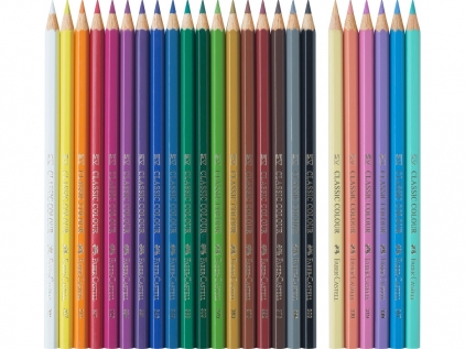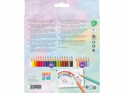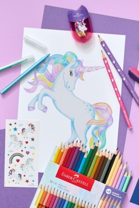 Cutie carton ce conține 18 creioane colorate hexagonale nuanțe clasice, 6 creioane în culori pastel Faber-Castell și stickere cu unicorni.