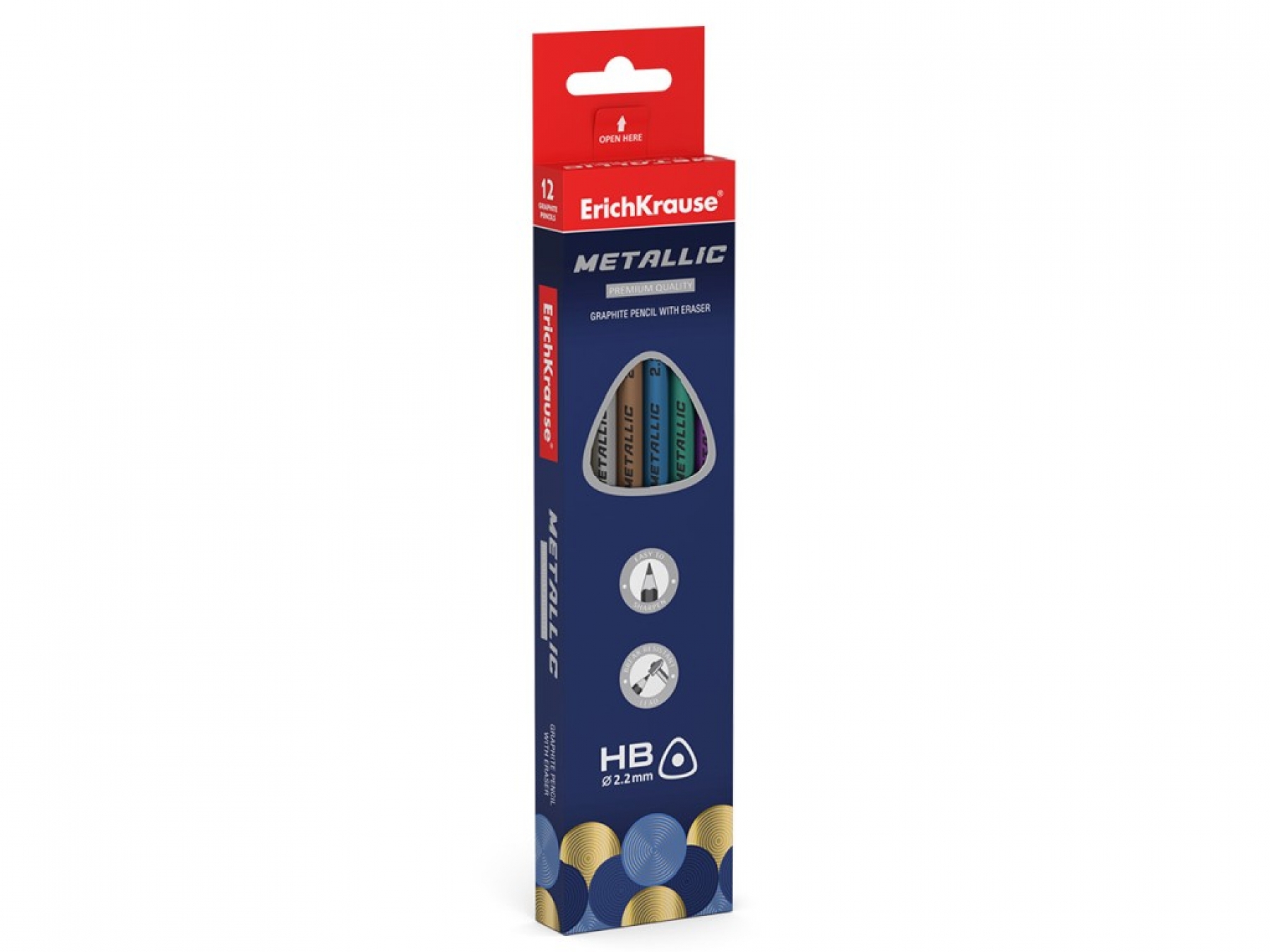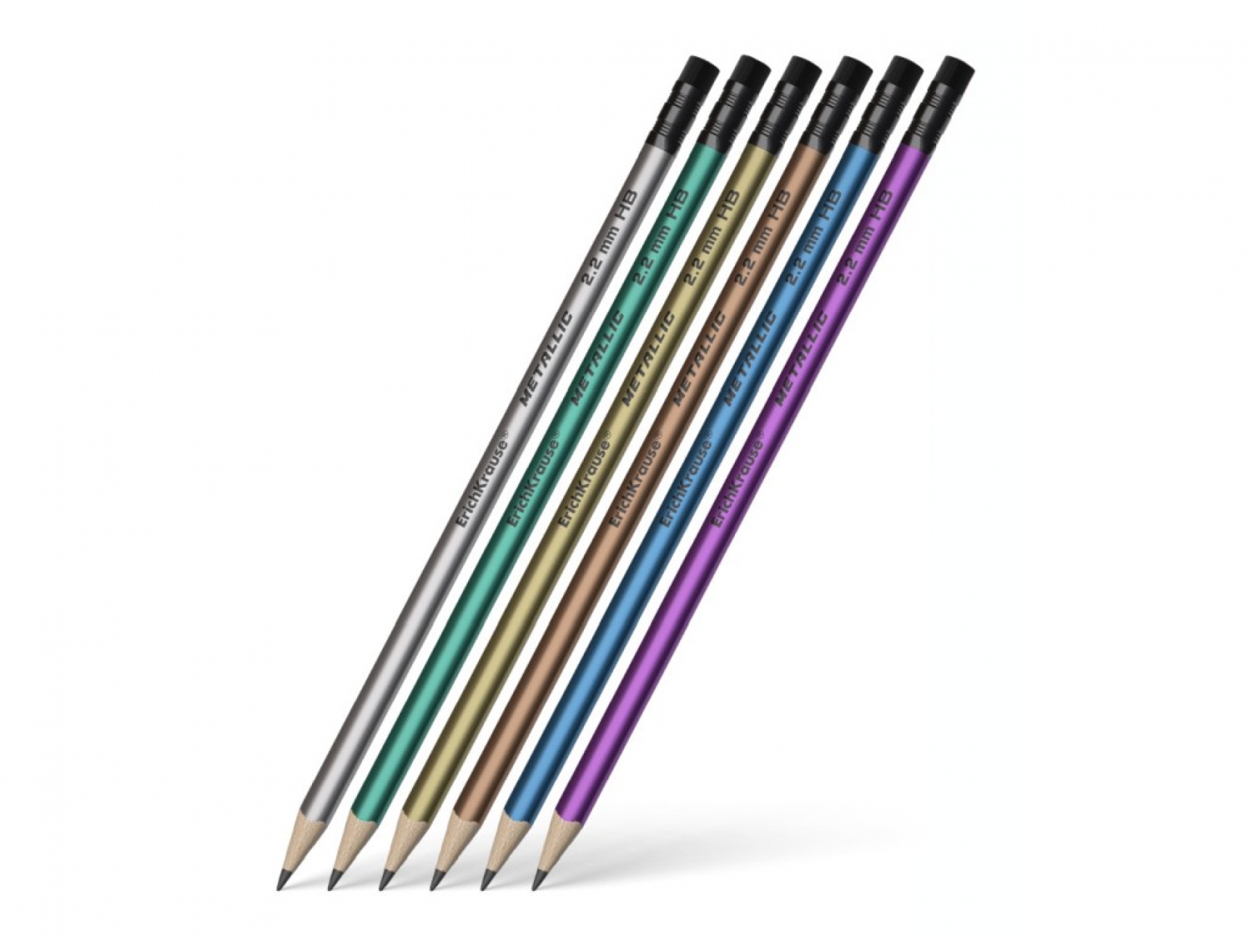 Disponibil în șase culori metalizate, cu gumă de șters neagră.