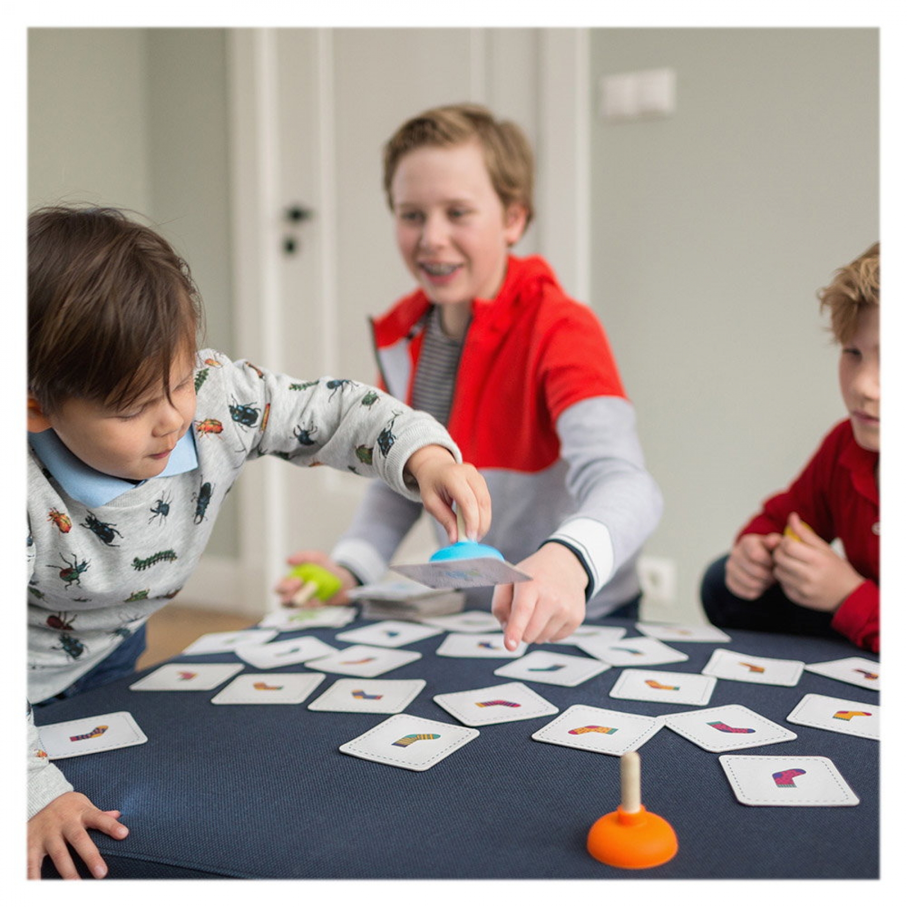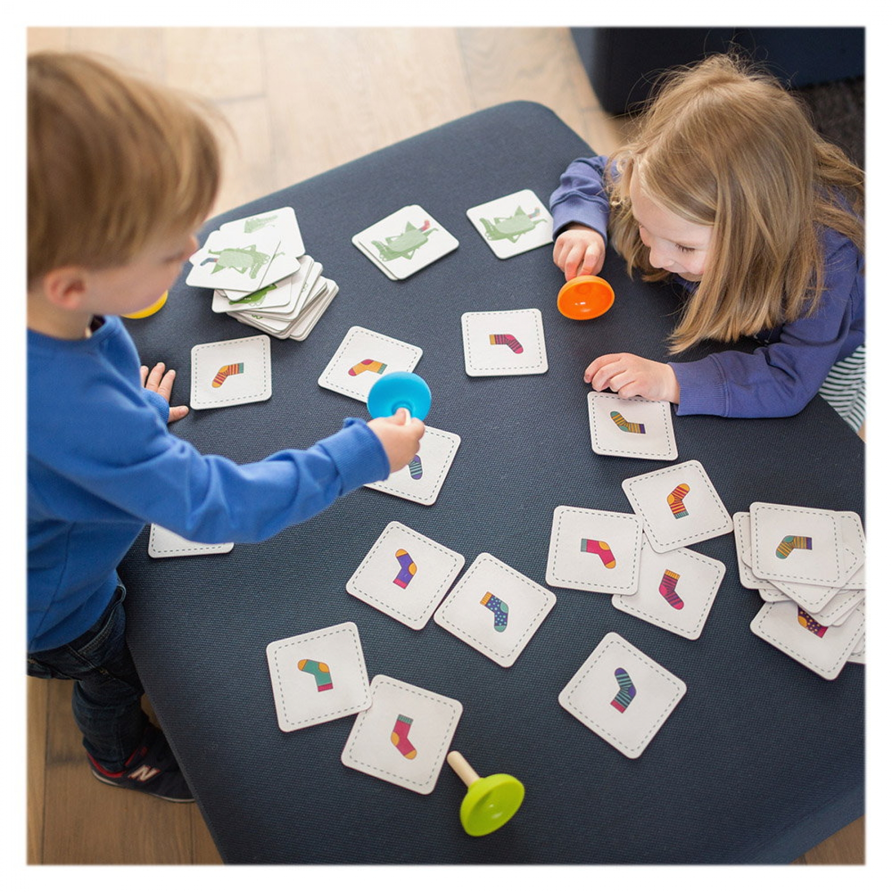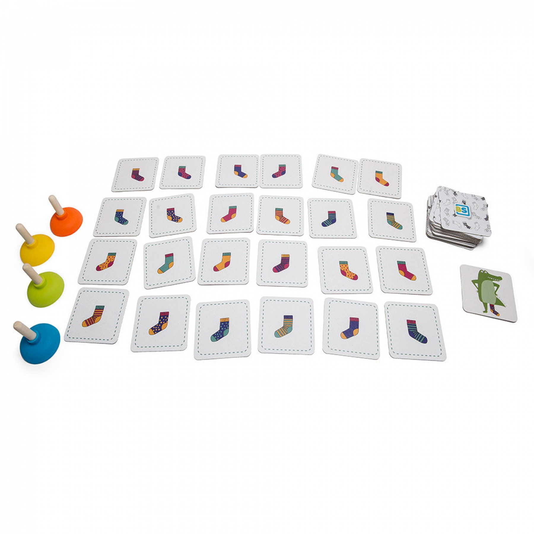 Oh, oh... crocodilul este putin confuz! Isi cauta sosetele, dar nu gaseste perechea potrivita. Intoarce un cartonas si fii primul care gaseste si prinde soseta lipsa cu ventuza ta! Dar fii atent, crocodilul are nevoie de ciorapul stang sau drept? Crocs 39; Socks este un joc de masa distractiv si activ, potrivit atat pentru copii, cat si parinti, ce poate fi jucat de 1 pana la 4 jucatori. Jocul consta din 24 de carduri din carton gros cu sosete colorate, 24 de carduri din carton gros cu crocodilul cu o singura soseta si 4 ventuze. Cum se joaca: - Aseaza cartonasele cu sosete cu fata in sus pe masa. Pune cartonasele cu crocodilul cu fata in jos intr-un teanc. - Fiecare jucator primeste o ventuza. Unul dintre jucatori va intoarce un cartonas si apoi toata lumea va incerca sa gaseasca si sa prinda ciorapul lipsa cu ventuza cat mai repede posibil. Dar atentie! Este soseta dreapta sau stanga cea pe care trebuie sa o gasesti? Daca este prea dificil sa gasesti soseta stanga sau dreapta, se poate incerca gasirea ciorapului asortat, indiferent ca este dreaptul sau stangul. Jocul Crocs 39; Socks dezvolta: rapiditatea si viteza de reactie, acuitatea vizuala, atentia si concentrarea. Dimensiuni: 22 x 22 x 6 cm Varsta recomandata: 4 ani+