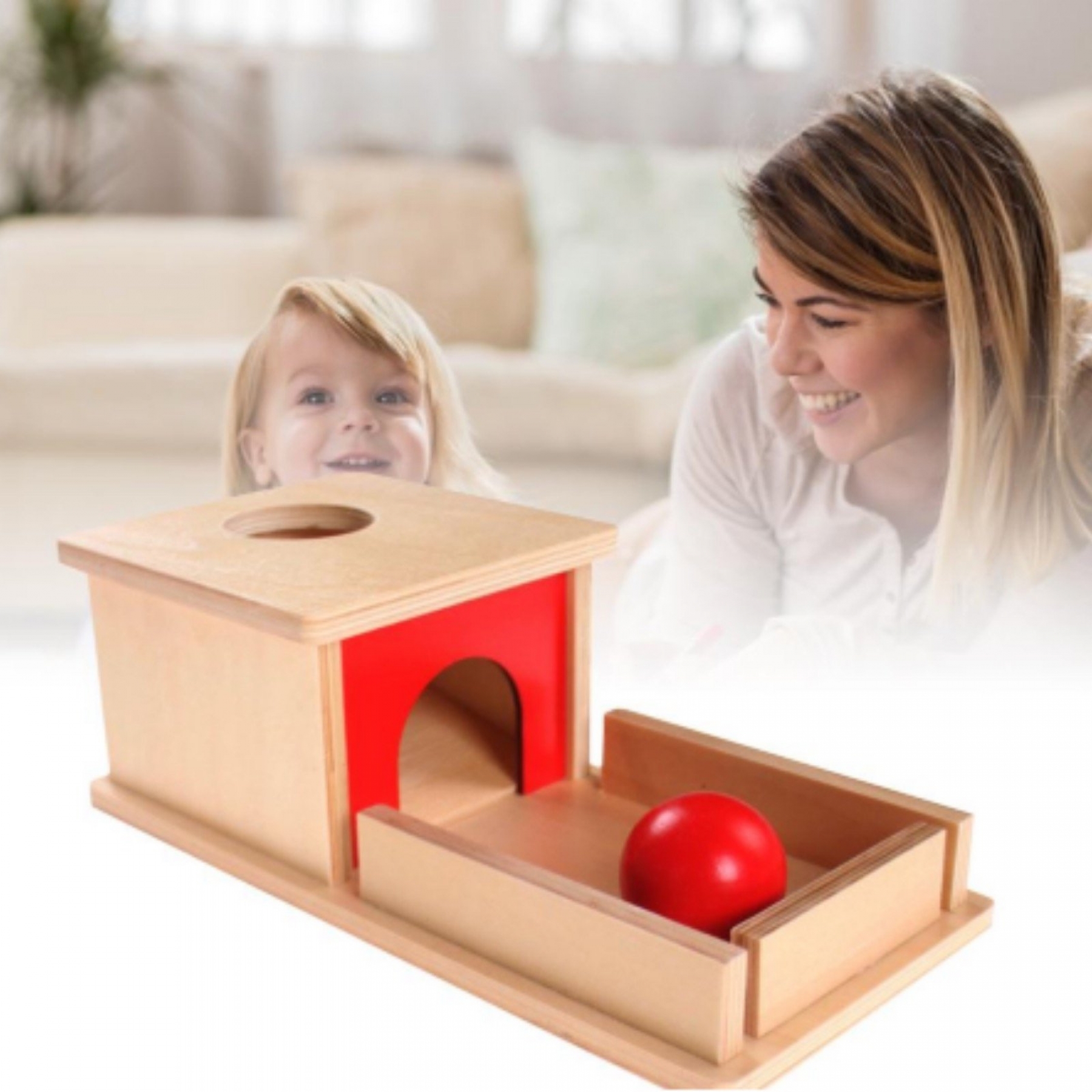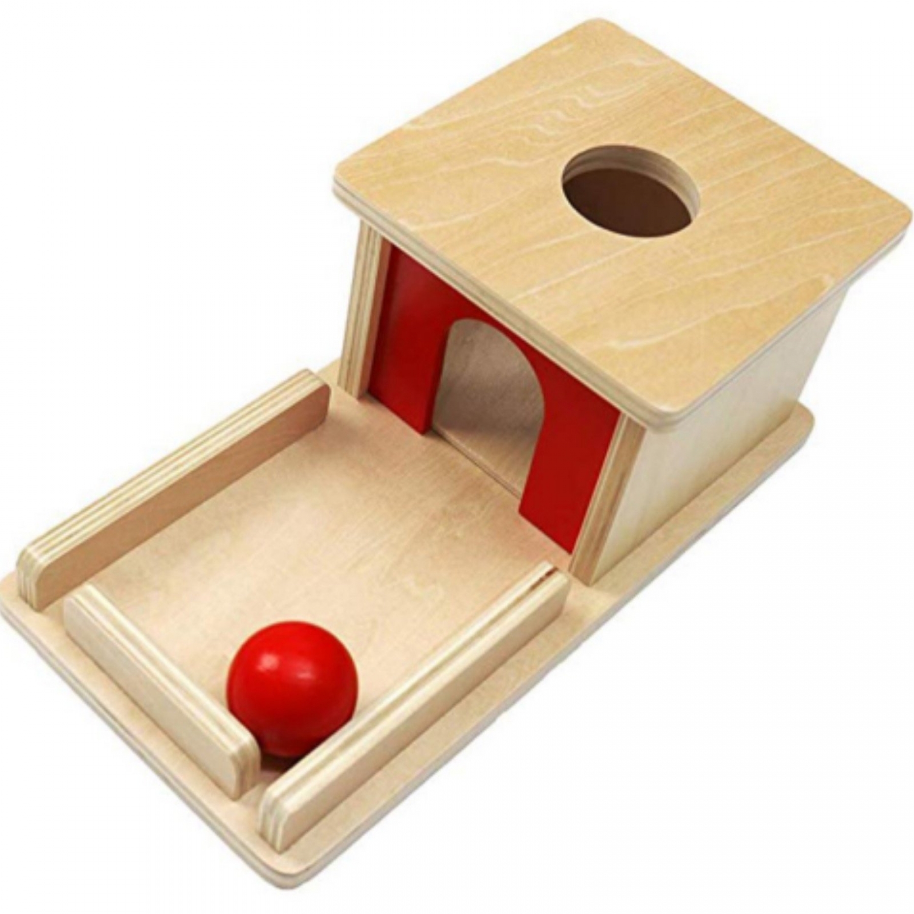 Cutia permanentei cu bila - Metodologia Montessori. Conform psihologiei primului an de viata, momentul in care copilul descopera permanenta obiectelor (intelege faptul ca obiectele exista si cand acestea dispar din campul lui vizual) este foarte important. O astfel de cutie, in care bila dispare si reapare, este potrivita pentru nivelul de dezvoltare cognitiva a copilului. Aceasta cutie a permanentei permite in mod indirect copilului sa experimenteze permanenta obiectului. El practica miscari precise ale mainii in timp ce trimite informatii catre creier si dezvolta controlul mainii, incheieturii mainii si a degetului - cunoscut si ca miscari rafinate ale mainilor . Cutie a permanentei cu bila, jucarie educativa montessori din lemn. Recomandata pentru a practica coordonarea ochi-mana si pentru a se familiariza cu permanenta obiectului. Zgomotul tipic al mingii cazute pe lemn il provoaca pe bebelus si auditiv. Este un material care provoaca si actul repetitiei, un element important in dezvoltarea celor mici. Cand introducem cutia permanentei? Se introduce dupa varsta de 6 luni ( ideal spre 7-8 luni), atunci cand copilul e capabil sa stea in fund nesustinut. Scopul direct al materialului este acela de a-l ajuta pe copil sa-si dezvolte simtul permanentei obiectului. De asemenea, il ajuta in mod indirect sa-si dezvolte concentrarea si abilitatile motorii fine. Copilul va privi fascinat cum dispare bila prin gaura din cutie si reapare in cu totul alt loc decat cel prin care a intrat. Dimensiune placa cutie din lemn : 28 cm x 14 cm x 11 cm (inaltime). Dimensiune bila din lemn : 3 cm. , Nu le spune cum sa faca acest lucru. Arata-le cum sa o faca si nu spune un cuvant. Daca le spui, iti vor urmari buzele. Daca le aratati, ei vor dori sa faca ei insisi ., , Maria Montessori . Avertismente! Jucaria produsul poate contine piese mici care se pot inghiti sau inhala existand pericolul de sufocare sau nu este potrivita copiilor mai mici de 6 luni. Nu lasati ambalajele jucariilor produselor la indemana copiilor. Indepartati orice ambalaj al jucariei produsului inainte de a da jucaria produsul copilului. Va rugam sa supravegheati copilul in timp ce se joaca foloseste acest produs. Pastrati instructiunile si etichetele pentru referinte viitoare. Pastrati jucaria produsul departe de foc, feriti jucaria produsul de temperaturi ridicate si umiditate . Imaginile au caracter informativ. Nuanta, tonul si intensitatea culorii pot varia in functie de monitor.
