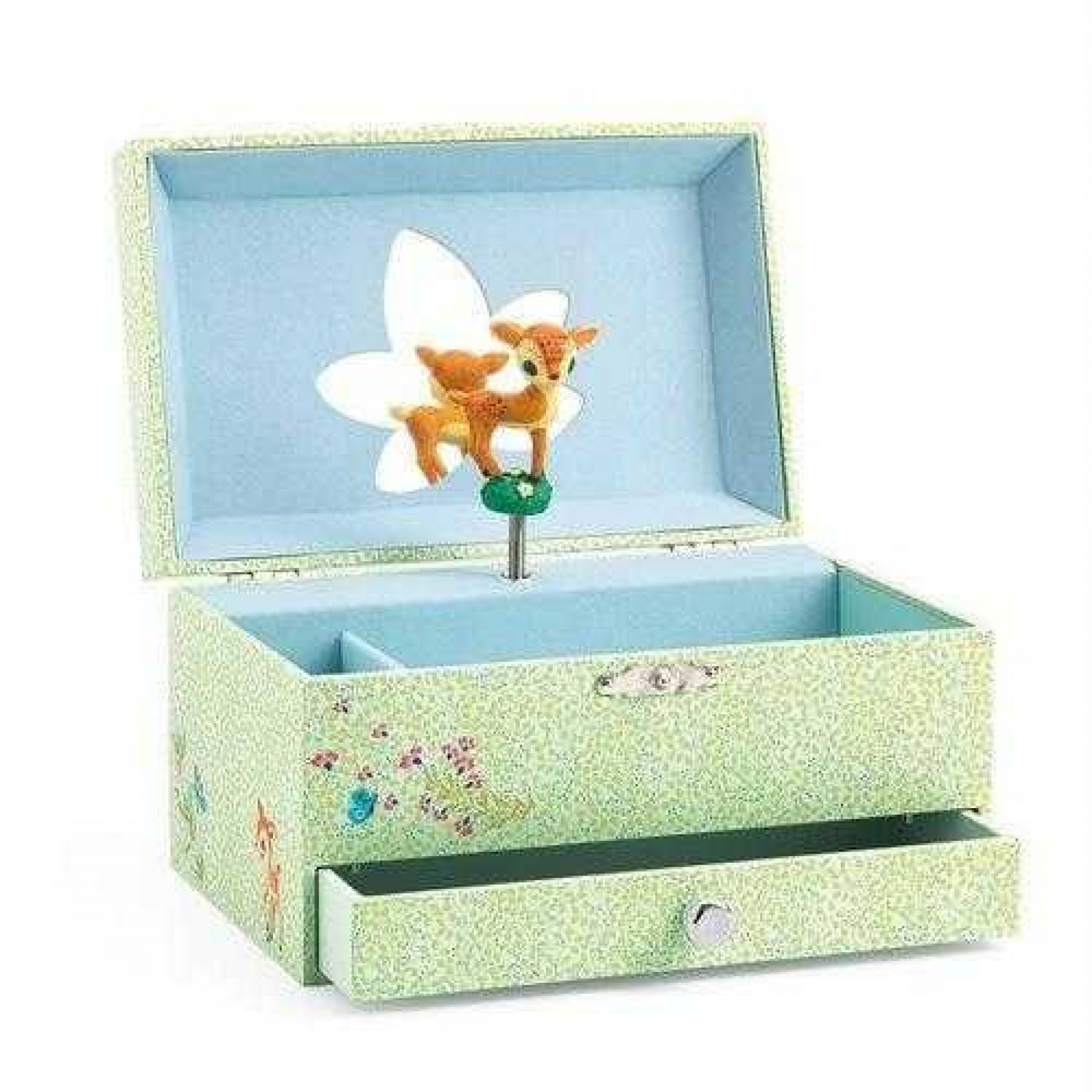 Cutie muzicala caprioara Cutie muzicala cu sertar pentru a pastra bijuterii si obiecte secrete. Intoarce cheita, deschide cutia si vei fi surprins! O caprioara sculptata delicat se roteste, reflectata intr-o oglinda frunza. Compartiment pentru depozitarea inelelor. Melodie: Povestiri din padurea vieneza. Compozitor: Johann Strauss. Melodia dureaza apx 2 min 30 sec. Continut: o cutie muzicala de bijuterii cu capac si sertar, captusita la interior cu catifea. Dimensiune cutie muzicala: 17,8 x 11,3 x 9,9 cm. Varsta recomandata: +4 ani. Confectionata din carton, lemn, textil si metal. AVERTISMENT: Acest articol nu este jucarie. Nu lasati la indemana copiilor sub 3 ani. A se utiliza sub directa supraveghere a unei persoane adulte. Design: Caroline Faup Produca tor: Djeco , Franta.