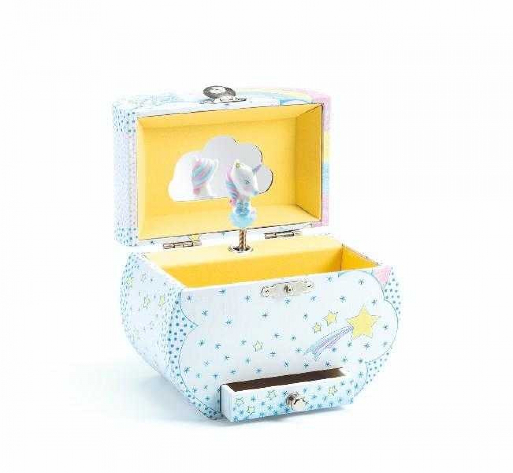 Cutie muzicala Visul unicornului Visul unicornului este o cutie muzicala in forma de nor, captusita cu catifea, cu un sertar pentru a pastra bijuterii si lucruri secrete. Intoarce cheita, deschide cutia si lasa-te surprins! Un unicorn delicat se retoste, reflectat intr-o oglinda in forma de nor. Melodia , žDunarea Albastra, de Johann Strauss, dureaza aproximativ 2 minute si 30 de secunde. Continut: o cutie muzicala de bijuterii din lemn acoperita cu hartie, captuseala de catifea, cu sertar. Dimensiune cutie muzicala: 14,7 x 14,2 x 8,2 cm. Varsta recomandata: +4 ani. Confectionata din lemn, carton, textil si metal. Conform reglementarilor EN71ASTM. AVERTISMENT: Acest articol nu este jucarie. A nu se lasa la indemana copiilor sub 3 ani. Produca tor: Djeco , Franta.