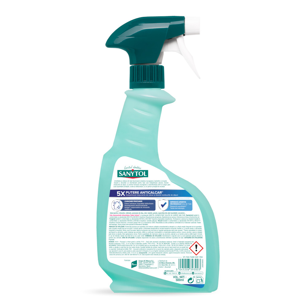 Dezinfectant pentru baie care indeparteaza calcarul, dizolva reziduurile de sapun si previne formarea mucegaiului. Lasa suprafetele protejate, curate si stralucitoare, cu un parfum proaspat de eucalipt.