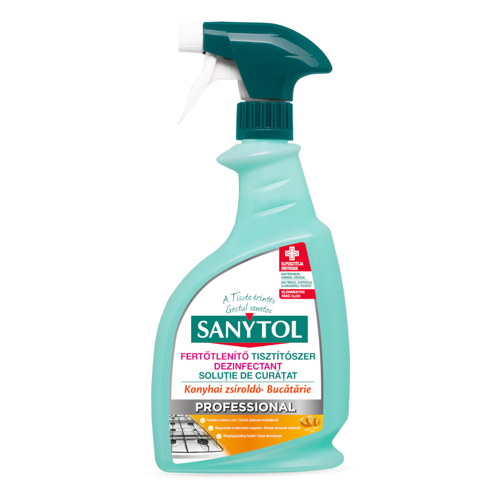 Dezinfectant pentru bucatarie, fara inalbitor. Distruge 99,9% bacterii, virusuri, ciuperci. Ideal pentru: soba, plita, chiuveta, blat de lucru, frigider, cuptor cu microunde etc.