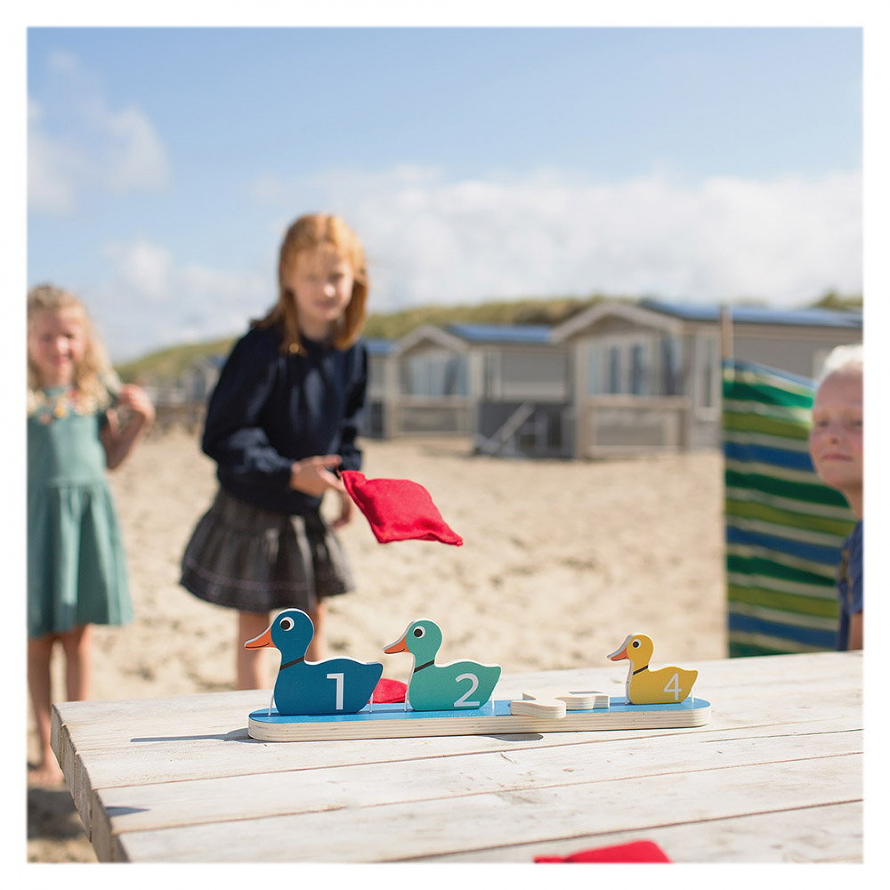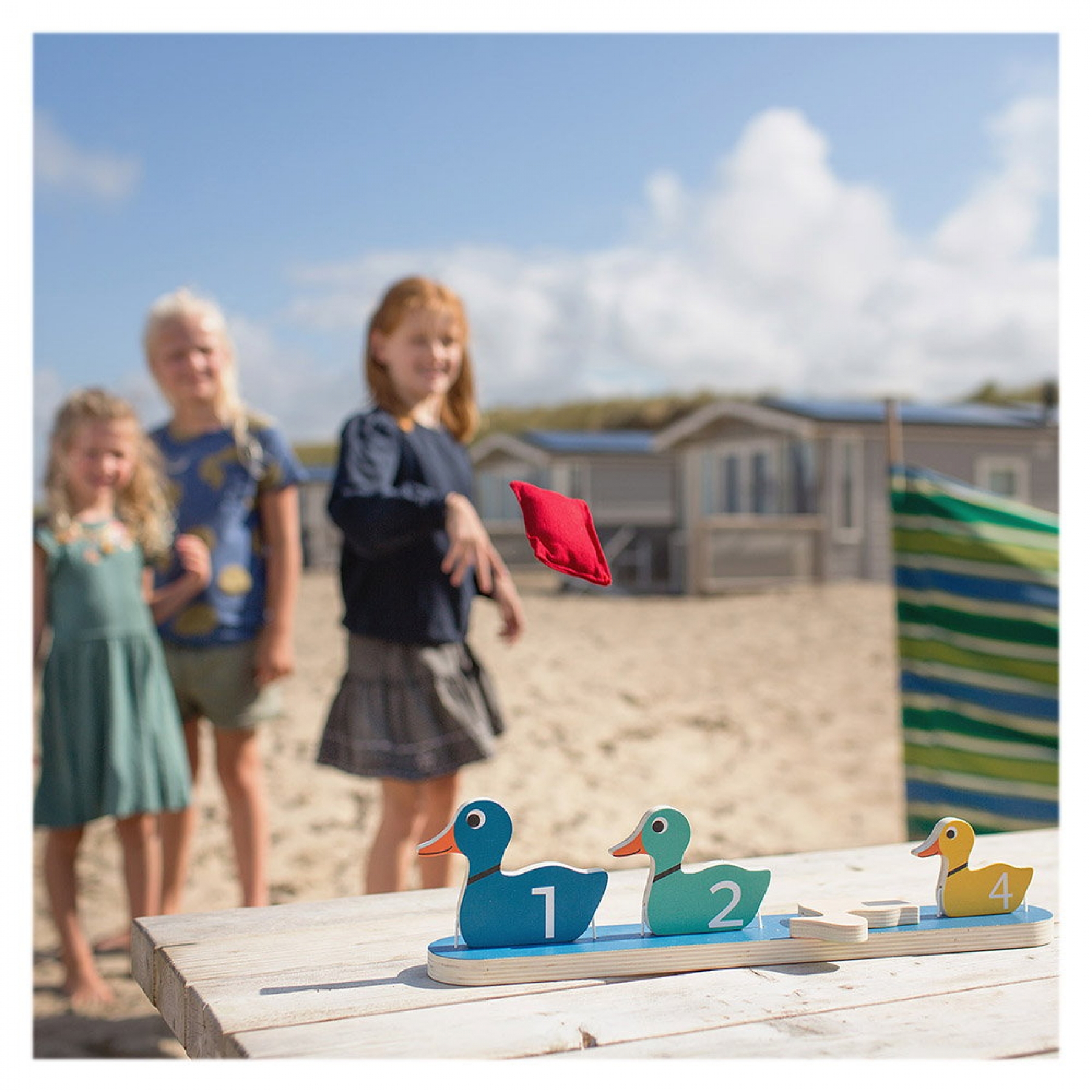 Un joc distractiv de aruncare la tinta, cu un design clasic si vesel, ce aminteste de jocurile amuzante de la balciuri. Cele patru rate s-au aliniat pe un rand. Tinteste si incearca sa le dobori cu saculetii cu nisip! Jocul include: o baza cu 4 rate din lemn prinse cu elastic (40 x 6 x 10 cm), 3 saculeti umpluti cu nisip (7 x 6 x 2 cm). Jocul este fabricat din lemn de calitate certificat FSC. Jocul incurajeaza jocul activ si dezvolta indemanarea, coordonarea ochi-mana, concentrarea, precizia, perseverenta si perceptia spatiala. Dimensiune produs: 40 x 6 x 10 cm Varsta recomandata: 3 - 7 ani Avertisment: Atentie! Contraindicat copiilor mai mici de 3 ani. Jucaria produsul poate contine piese mici care se pot inghiti sau inhala existand pericolul de accidente sau nu este potrivita copiilor mai mici de 3 ani.