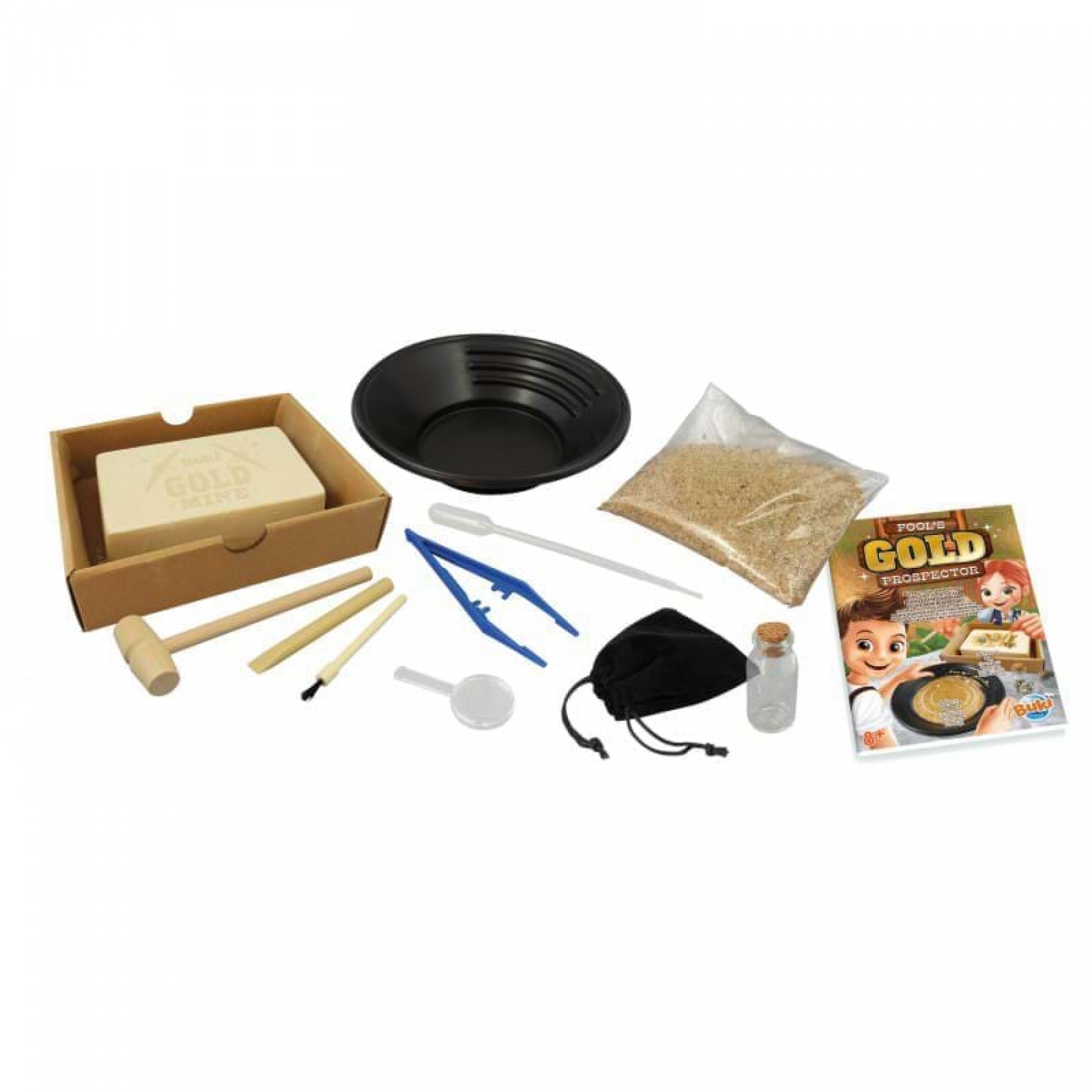 Cu ajutorul acestui set va familiarizati cu tehnica cautarii aurului: folosirea saitrocului pentru a separa aurul de nisip si extragerea peptitelor de aur (fals). Setul include: vas special (saitroc), ciocan, dalta, pipeta, penseta, alte accesorii Dimensiunile cutiei: 25.3 x x 05.5 x 19 cm Varsta recomandata: 8 ani+ Avertisment: Numai pentru copiii cu varsta de 8 ani si peste. AVERTIZARE ! Nu este potrivit pentru copiii sub 36 de luni din cauza pieselor mici care pot fi ingerate. Pericol de sufocare. AVERTIZARE ! A se utiliza sub supravegherea directa a unui adult. Prezenta punctelor si marginilor ascutite functionale. PASTRATI PACHETUL PENTRU REFERINTE VIITOARE. Culorile si continutul pot varia usor.