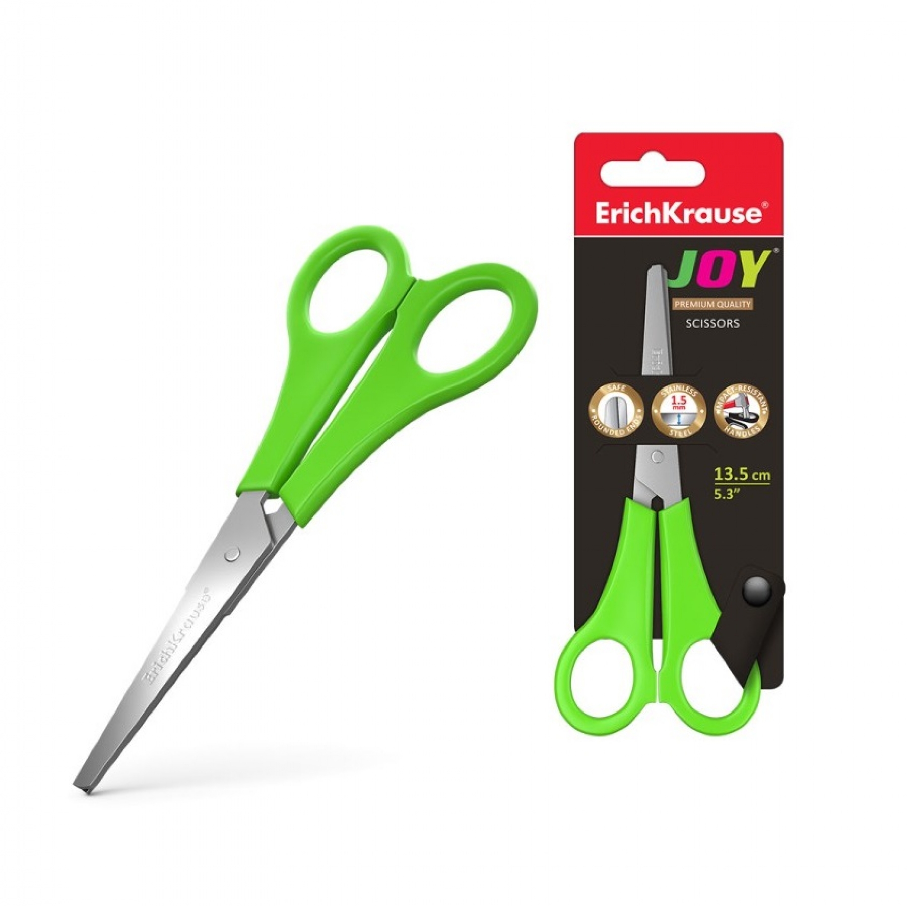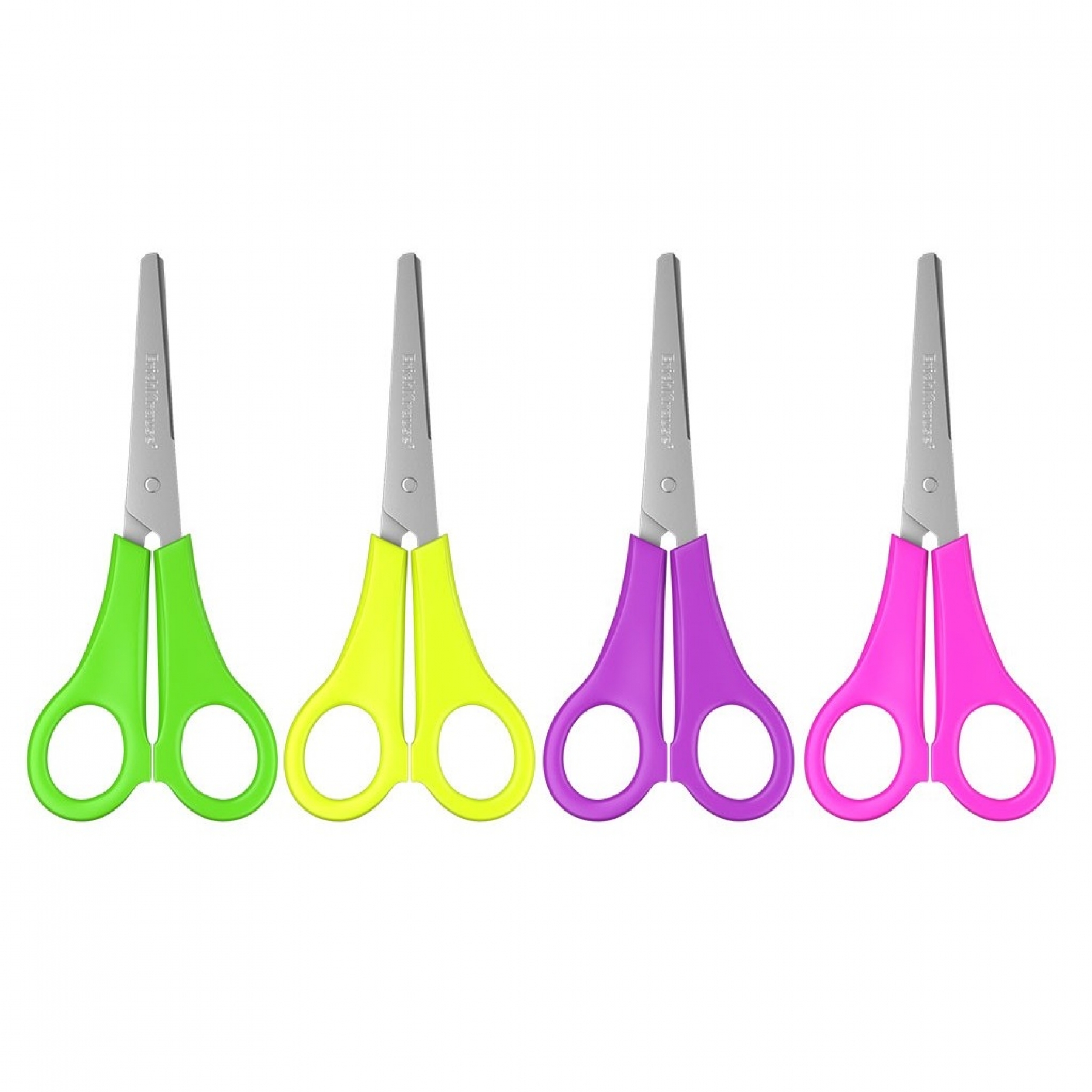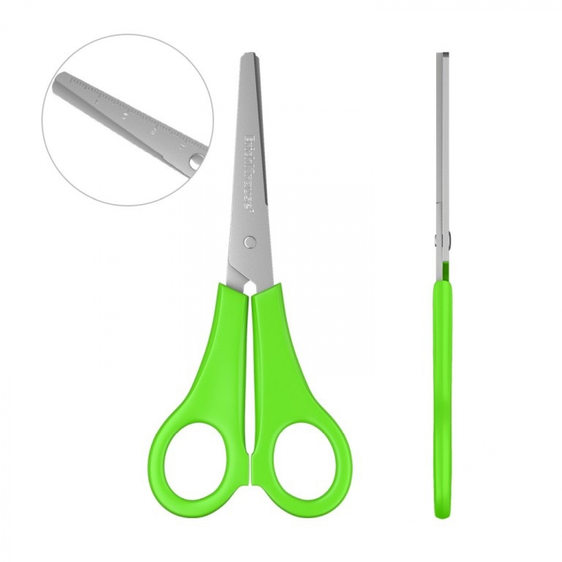 Foarfeca fabricata din otel inoxidabil, cu varfuri rotunjite si manere din plastic. Lamela este prevazuta cu rigla pentru o taiere mai precisa. Lungime: 13,2 cm.