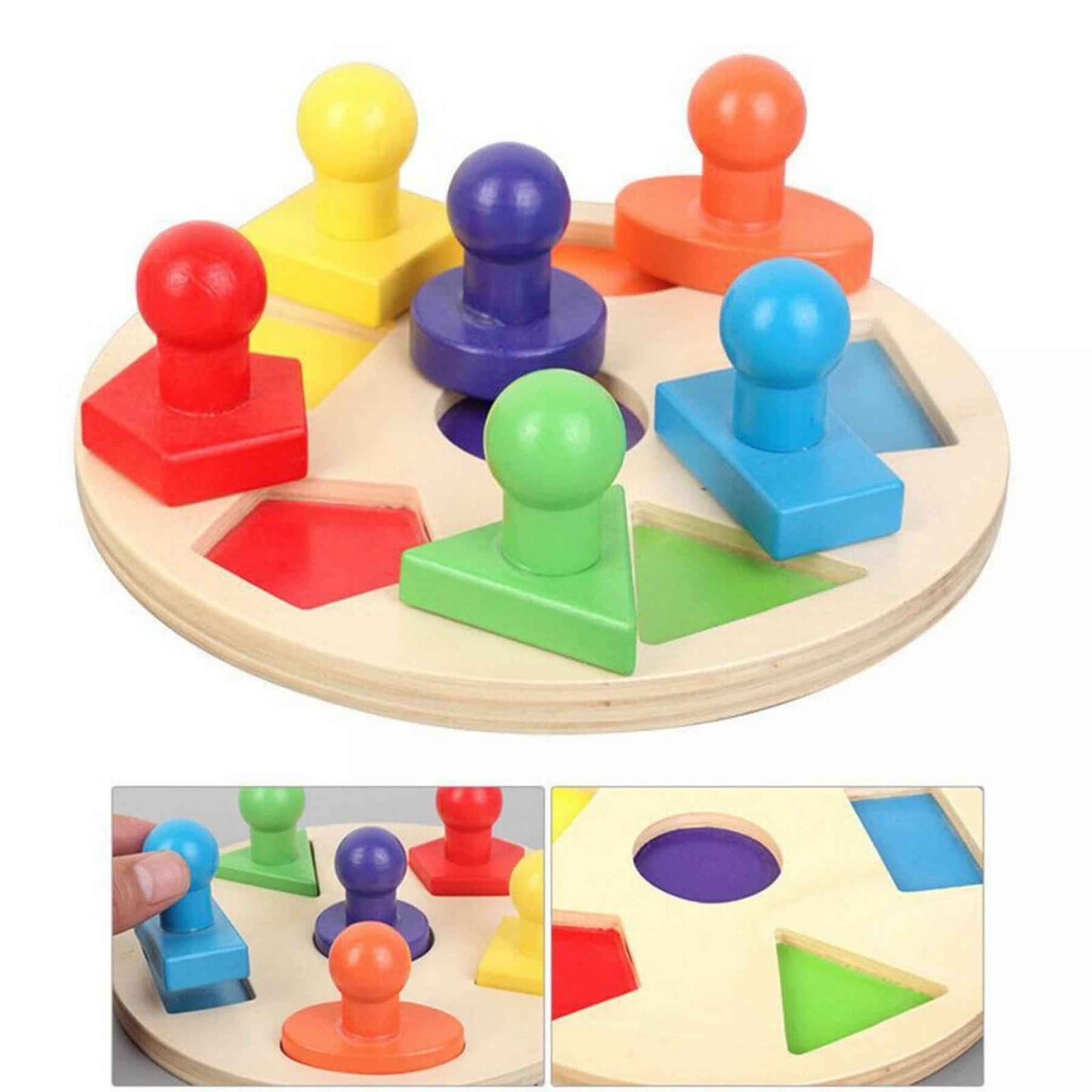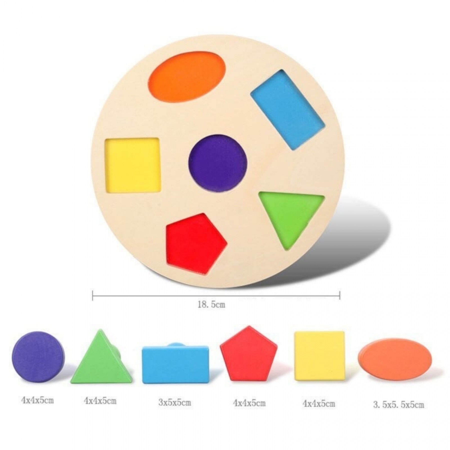 Joc puzzle incastru din lemn cu maner de prindere si Figuri Geometrice. Puzzle incastru din lemn cu maner si 6 forme geometrice pentru a invata prinderea cu 3 degetele. Este o jucarie tip Montessori, des utilizata in crese si gradinite. Acest joc de tip puzzle incastru contine urmatoarele forme geometrice: cerc, patrat, dreptunghi, triunghi, oval si pentagon, frumos colorate. O activitate perfecta pentru copii sa inceapa sa recunoasca formele si sa asocieze culorile. Puzzle-ul ajuta la dezvoltarea abilitatii motrice, manerul din lemn aferent fiecarei piese ajuta la exersarea prinderii cu 3 degete. Aceasta miscare ajuta foarte mult la dezvoltarea motricitatii, atat de necesara la diversificarea bebelusului. Piesele sunt mari si au design rotunjit, fara risc de a se accidenta. Material : Lemn. Varsta recomandata : 3 ani+. Se poate utiliza si de catre copii incepand cu varsta de 2 ani sub atenta supraveghere a unui adult Dimensiuni : 18 cm diametru.