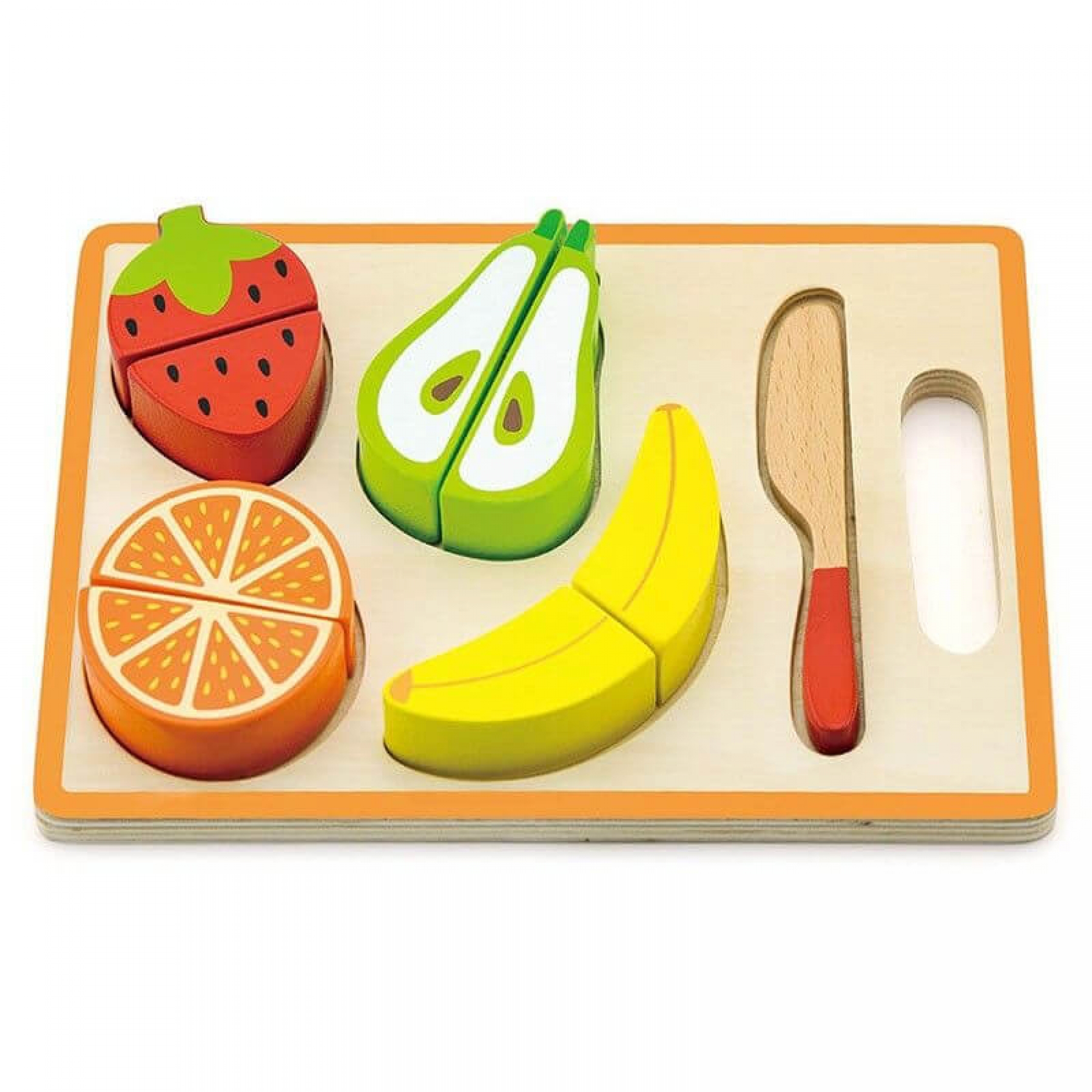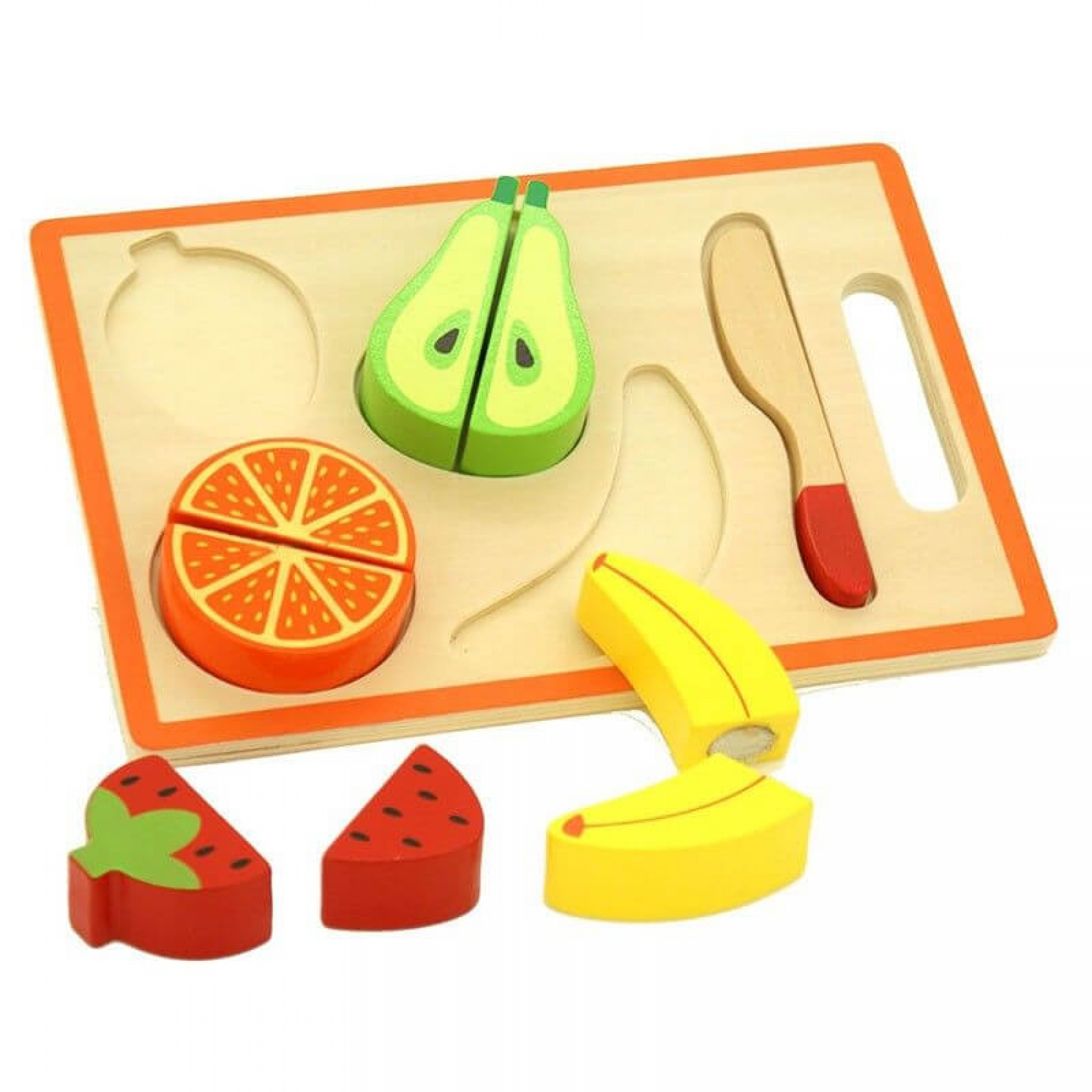 Copiii se vor bucura taind fructele in bucati si apoi le vor lipi la loc cu ajutorul scaiului. Dupa lipirea fructelor, acestia pot folosi jocul ca pe un puzzle incastru, potrivind fructele in locurile corespunzatoare de pe tavita de lemn. Setul contine cutit, tocator si fructe colorate: portocala, banana, capsune, pere. Fructele se lipesc cu arici. Toate piesele sunt realizate din lemn iar vopselele folosite sunt organice si nu sunt daunatoare sanatatii copiilor. Cu ajutorul acestui set copiii vor invata sa taie, sa potriveasca forme, pot invata prin manipulare directa notiunile matematice de intreg si jumatate, isi vor dezvolta dexteritatea si abilitatile de coordonare. De asemenea, setul incurajaza imaginatia, prin jocurile de rol.