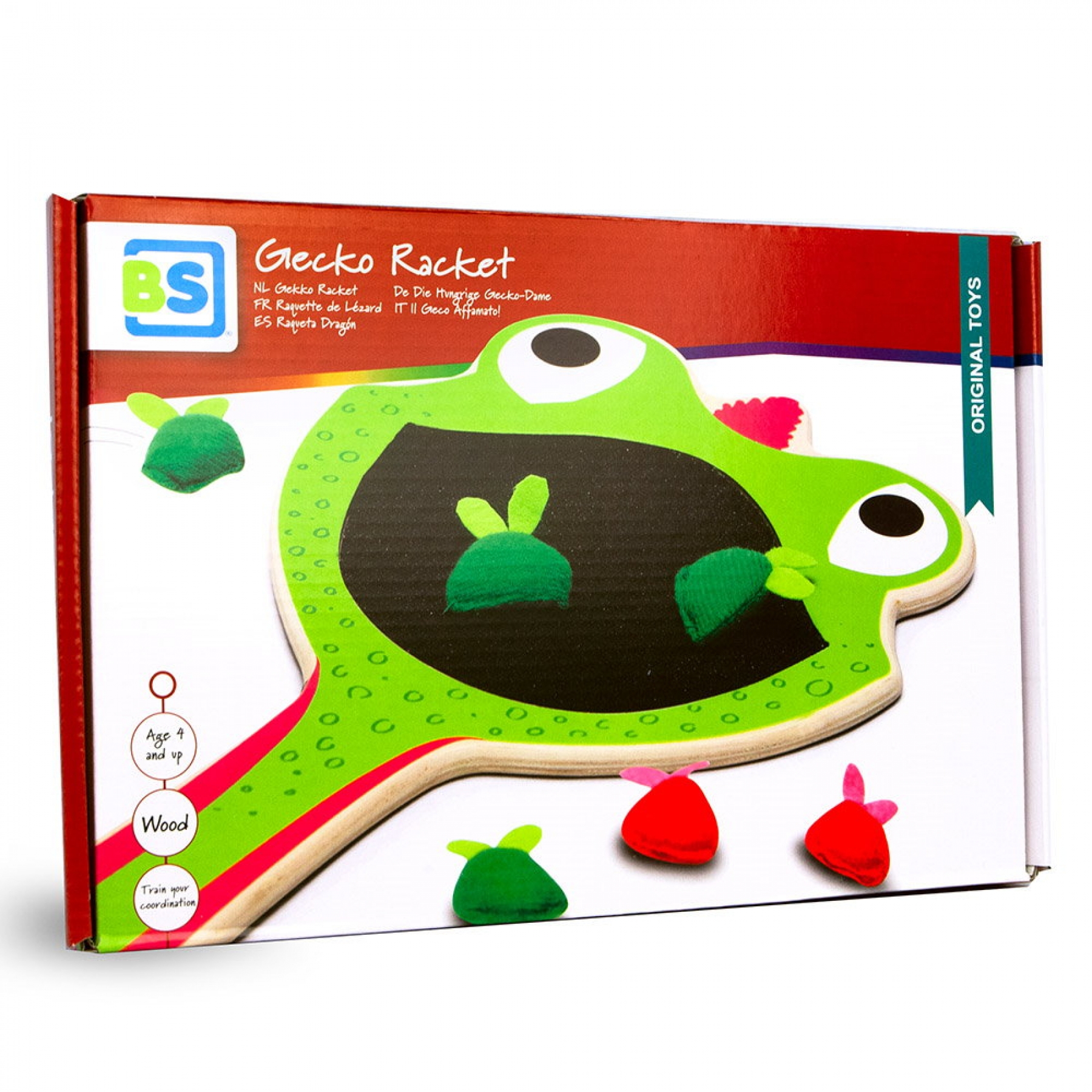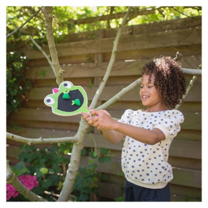 Gecko Racket de la BS Toys este un joc de indemanare super distractiv ce se poate juca de catre 2 jucatori! Scopul jocului este sa o hranesti pe soparla gecko Gloria cu muste verzi si sa ai grija sa le respingi pe cele rosii pe care le considera dezgustatoare. Jocul contine: 1 racheta din lemn, in forma reptilei Gecko, cu o suprafata velcro in dreptul gurii pe o parte si lemn pe cealalta si 8 muste din fetru (6 verzi si 2 rosii). Un jucator tine racheta, iar celalalt, la cativa pasi, tine cele 8 muste. Jucatorul cu mustele ia o musca si o arunca catre Gloria. Jucatorul care manuieste racheta trebuie sa prinda musca cu partea velcor a rachetei, daca aceasta este verde, sau sa intoarca racheta si sa loveasca musca, daca este rosie. Jucatorul cu mustele continua sa arunce mustele spre Gloria pana cand nu mai sunt muste. Poti alege sa arunci mustele una cate una incet, rapid sau mai multe in acelasi timp! Gloriei ii este intotdeauna foame, asa ca puteti sa jucati din nou si sa manuiti pe rand racheta si mustele! Castigatorul este jucatorul care are mai multe muste verzi prinse pe racheta, dar atentie, fiecare musca rosie prinsa inseamna un punct in minus! Jocul dezvolta atentia, concentrarea, coordonarea ochi-mana, indemanarea, viteza de reactie si dexteritatea. Dimensiune racheta: 19 x 1 x 29 cm Dimensiune cutie: 31 x 20 x 3 cm Varsta recomandata: 4 ani+ Atentie!Contraindicat copiilor mai mici de 3 ani. Jucaria poate contine piese mici care se pot inghiti sau inhala existand pericolul de sufocare sau nu este potrivita copiilor mai mici de 3 ani.