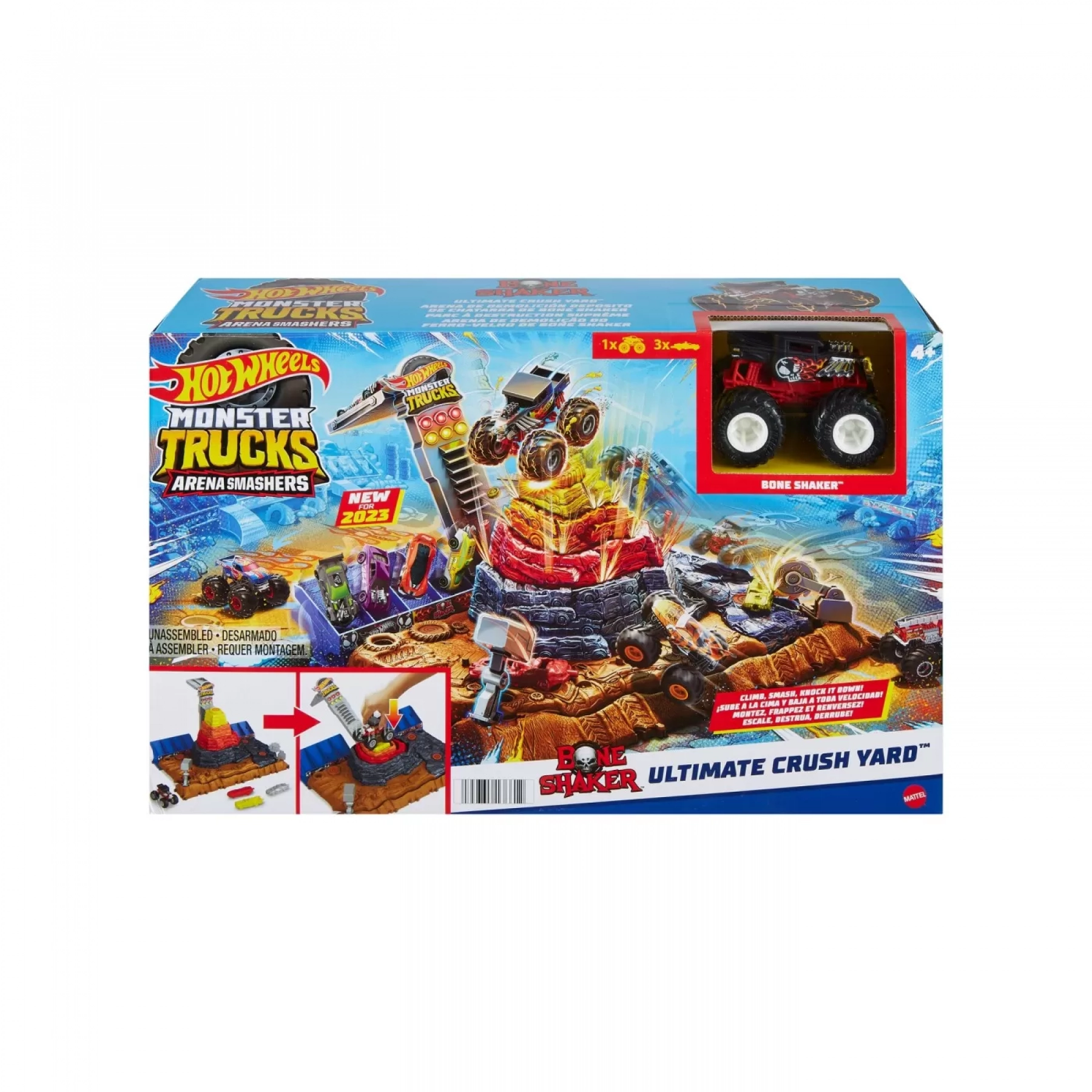 Copiii pot experimenta zdrobiri si prabusiri epice in stil Monster Truck in setul de joaca Hot Wheels Monster Trucks Arena Smasherstrade Bone Shakertrade Ultimate Crush Yardtrade. Cinci puncte de spargere indica locul in care are loc actiunea, iar baza se misca si se agita, adaugand feedback senzorial pentru a imbunatati jocul. Setul include un Hot Wheelsreg Monster Trucks Bone Shakertrade la scara 164 si 3 masini zdrobibile pentru distrugere suplimentara. Se poate conecta la alte seturi, astfel incat copiii sa poata construi o lume Hot Wheels Monster Trucks Arena Smasherstrade. Fiecare set se vinde separat, in functie de disponibilitate. Culorile si decoratiunile pot varia.
