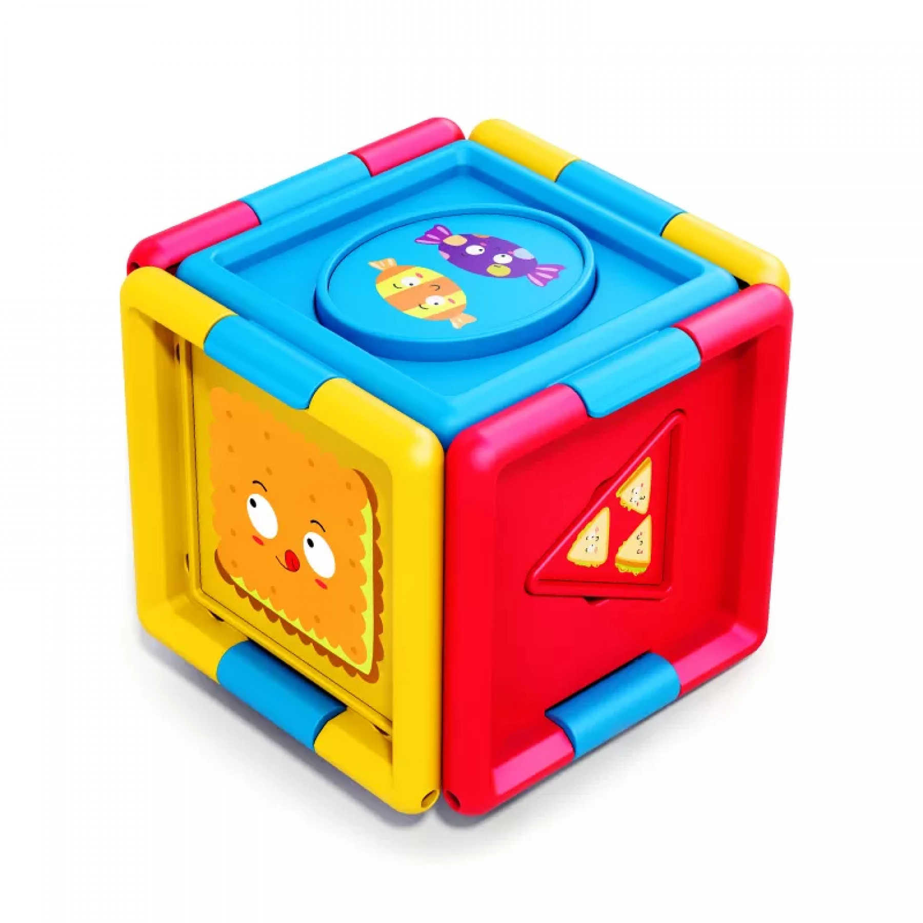Aflati despre forme geometrice, culori, alimente, dimensiuni, numere. Cele 3 forme trebuie aranjate logic si in ordinea corecta pentru a forma un cub. Jucaria ajuta la imbunatatirea gandirii spatiale si la introducerea copilului in conceptele de ordine si dimensiune.