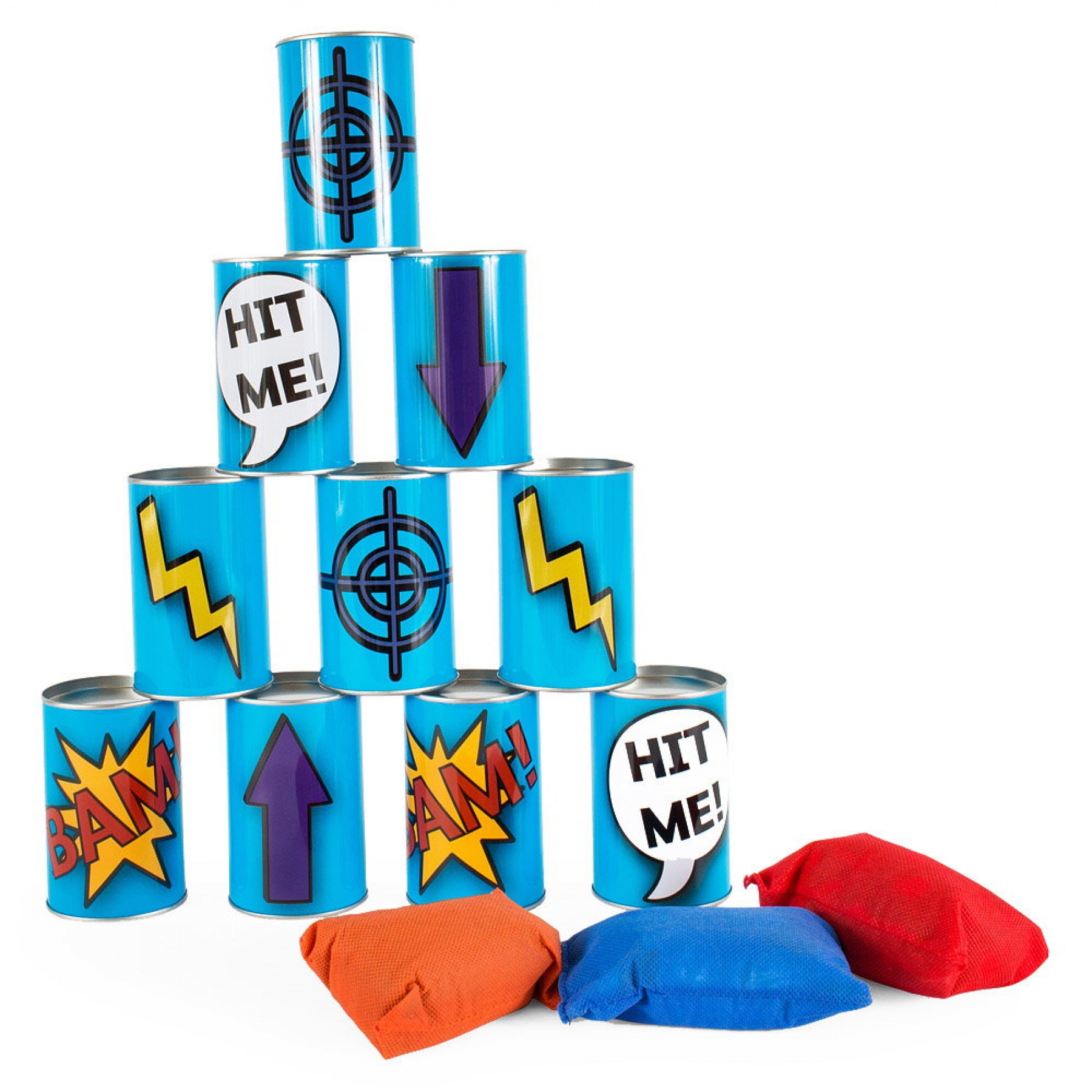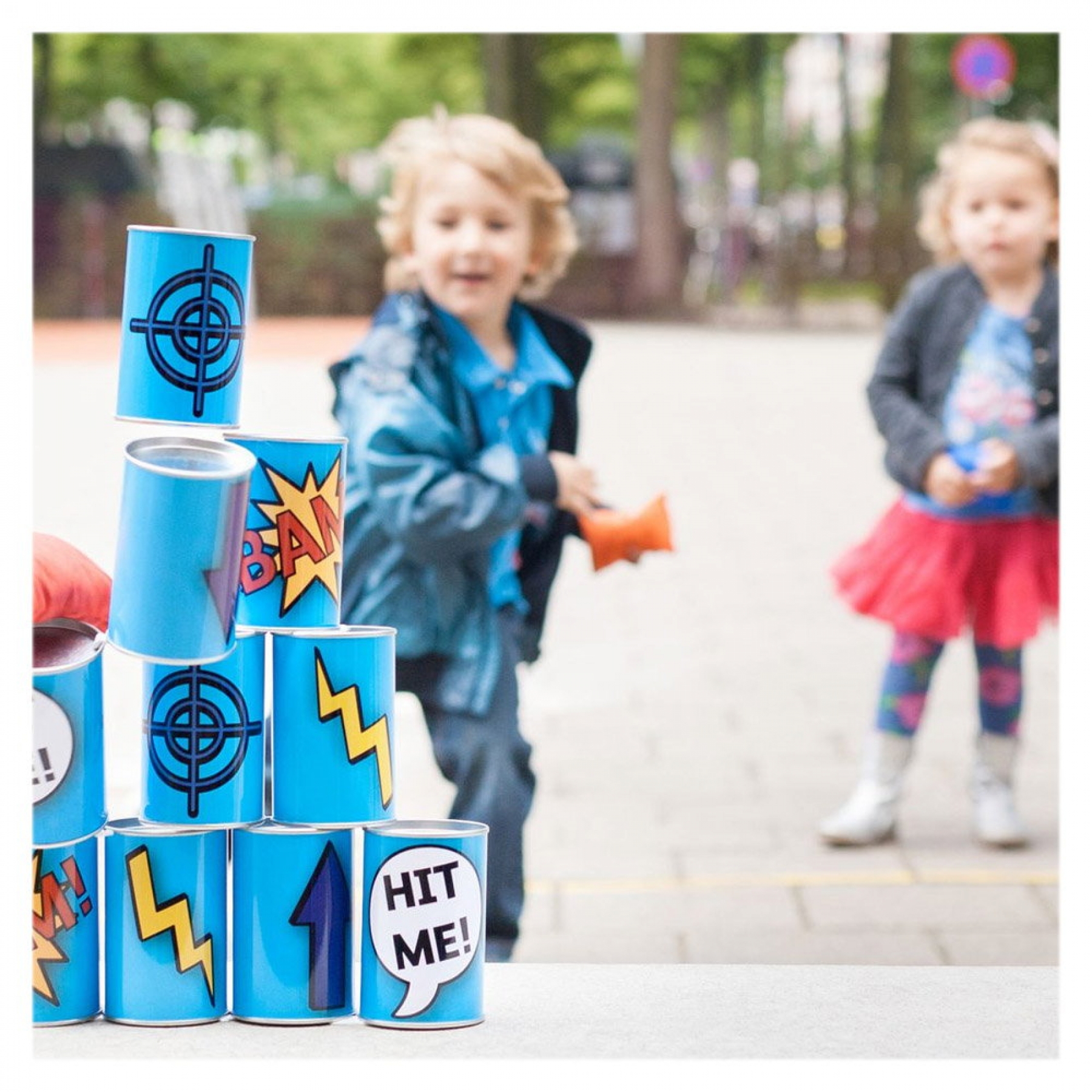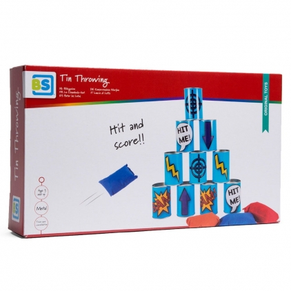 Tinteste cutiile de conserve! de la Buitenspeel este un joc clasic, pe cat de simplu, pe atat de distractiv, care va antrena in joc pe toata lumea, indiferent de varsta. Copii, parinti, bunici, toti vor indragi agest joc de petrecere distractiv! Regulile jocului sunt simple: cutiile se aranjeaza sub forma de piramida, se ia distanta (aceasta se va stabili in functie de varsta si abilitatile jucatorilor) si se incep aruncarile. Jucatorii vor incerca sa darame cat mai multe cutii. Pentru ca jocul sa fie mai complicat, se poate stabili puncte diferite pentru fiecare cutie in parte. Castiga cel care darama cele mai multe cutii puncte. Se poate juca individual sau pe echipe. Jocul include 10 cutii metalice (cu inaltime de 10 cm si diametrul de 6 cm) si 3 saculeti cu granule. Acest joc dezvolta indemanarea, coordonarea ochi-mana, concentrarea, rabdarea, precizia, abilitatile de socializare, stimulandu-i pe copii sa se joace impreuna cu prietenii sau membrii familiei, incurajaza miscarea in aer liber, atat de necesara dezvoltarii armonioase a copiilor. Dimeniune ambalaj: 39 x 22 cm Varsta recomandata: 3-8 ani