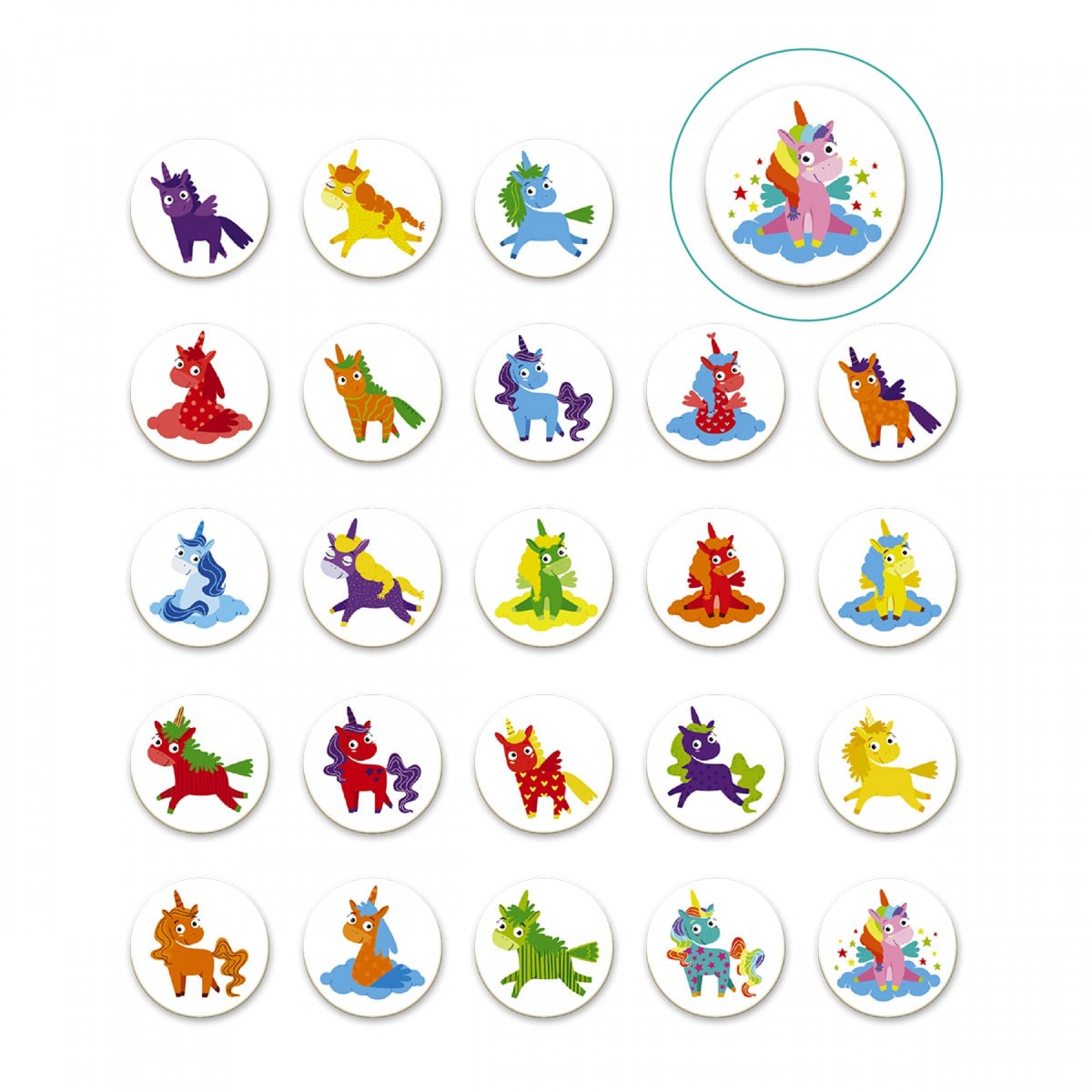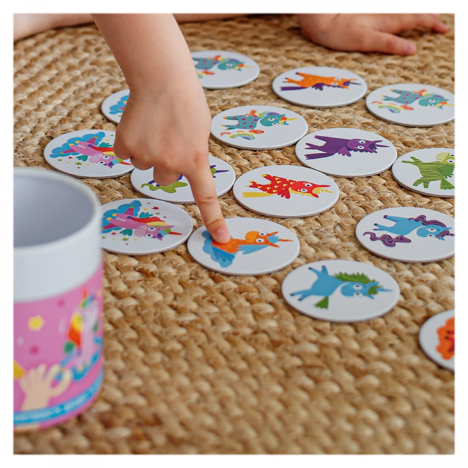 Gaseste rapid unicornul care se potriveste cu culoarea zarurilor! Distreaza-te cu familia sau prietenii si testeaza-ti atentia, spiritul de observatie si viteza de reactie in acest joc amuzant si antrenant de la Dodo Toys! Regulile jocului: inainte de joc, este necesar sa asezi toate jetoanele cu fata in sus, astfel incat toata lumea sa le poata privi bine. Jucatorii arunca pe rand zarurile pe care cad doua culori. Scopul tuturor jucatorilor este sa gaseasca cat mai repede o imagine care sa se potriveasca cu culorile zarurilor aruncate. Daca zarurile arata culori care nu mai sunt in joc, fiecare jucator incearca rapid sa apuce cartile de joker. Jocul se incheie cand nu mai exista nicio imagine pe masa. Castigatorul este cel care colecteaza cele mai multe jetoane. Dupa joc, toate cartonasele si zarurile sunt depozitate in cutia colorata cu capac din carton gros. Jocul contine: 27 de jetoane rotunde cu imagini imprimate (diametru: 7 cm), doua zaruri cu puncte colorate in loc de numere, o cutie de depozitare cu capac din carton gros. Jocul de observare si rapiditate, Unicorni este un joc distractiv care dezvolta abilitatile de observare, atentia, perceptia si viteza de reactie a copiilor. Dodo Toys ofera o colectie minunata de puzzle-uri si jocuri pentru copiii de la 18 luni in sus. Cu modele frumoase si distractive, aceste puzzle-uri cuprind de la puzzle-uri simple de 2 piese pentru cei mici, pana la puzzle-uri mai provocatoare de 1000 de piese, pentru copiii mai mari. Gama de jocuri si puzzle-uri vibrante si colorate Dodo ofera beneficii educationale si de dezvoltare, fiind cadourile perfecte pentru a ajuta copiii sa invete in timp ce se distreaza. Dimensiunea cutie: 10 x 10 x 12 cm Varsta recomandata: 3 - 7 ani Atentie!Contraindicat copiilor mai mici de 3 ani.Jucaria produsul poate contine piese mici care se pot inghiti sau inhala existand pericolul de accidente sau nu este potrivita copiilor mai mici de 3 ani.