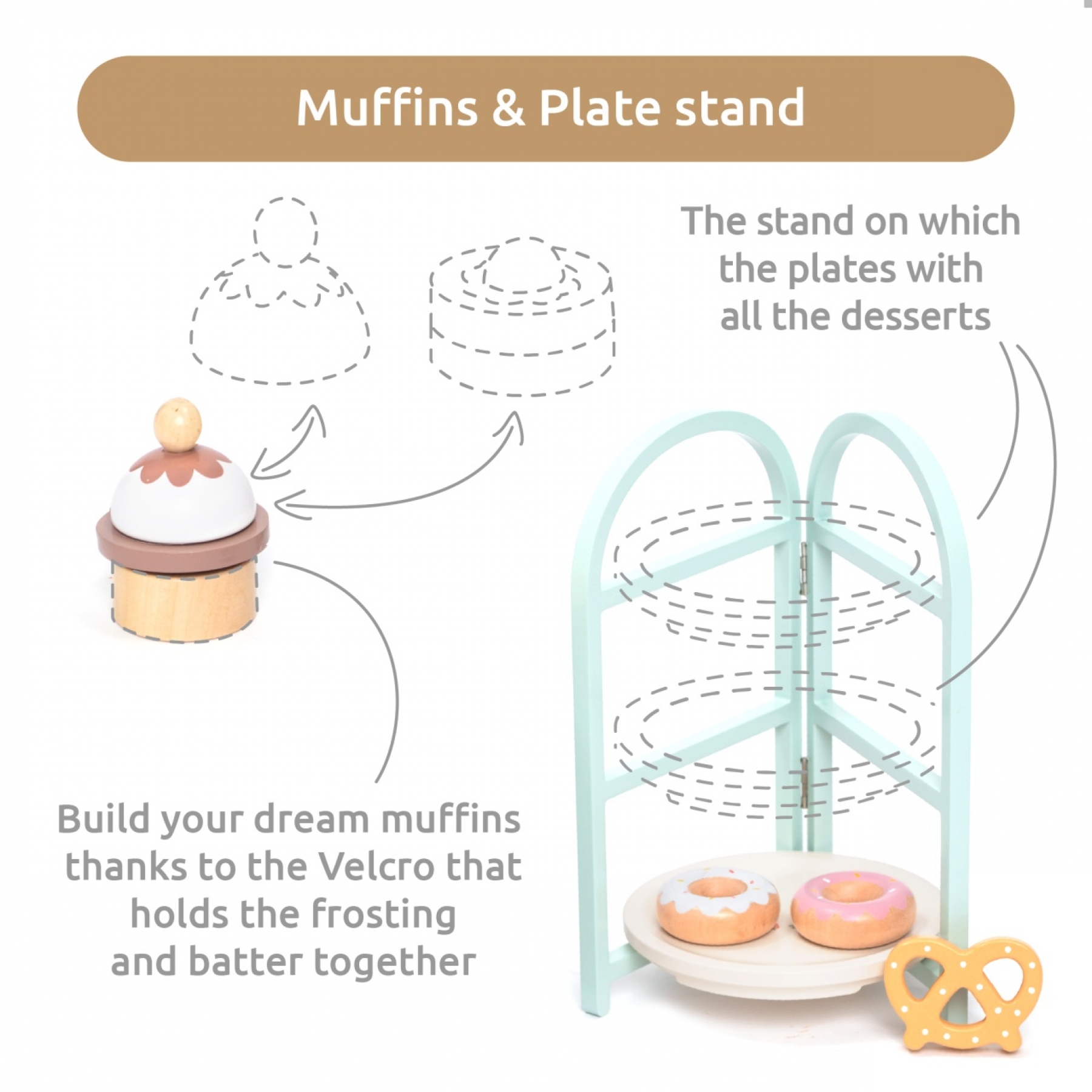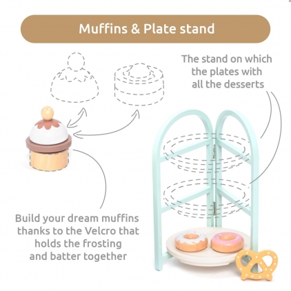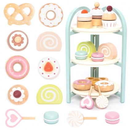 Joc de rol Raftul cu deserturi Set de joaca care contine un suport etajat garnisit cu prajituri pentru toate gusturile. Copiii prescolari isi pot dezvolta prin joc abilitati cognitive si motorii importante (coordonarea ochi-mana). Ei pot crea propriile variante de prajituri datorita prinderii cu velcro. Cadou ideal pentru zile de nastere, Craciun, Paste sau Ziua Copilului. Continut: 21 de piese din lemn. Piese cu margini netede si durabilitate ridicata. Varsta recomandata: +3 ani. Confectionat din lemn cu vopsele ecologice pe baza de apa. Conform EN71ASTM cu certificare CE. AVERTISMENT: Contraindicat copiilor sub 3 ani! Se recomanda supravegherea copilului de catre un adult in timpul jocului. Produs in China pentru UMU Toys, Cehia.