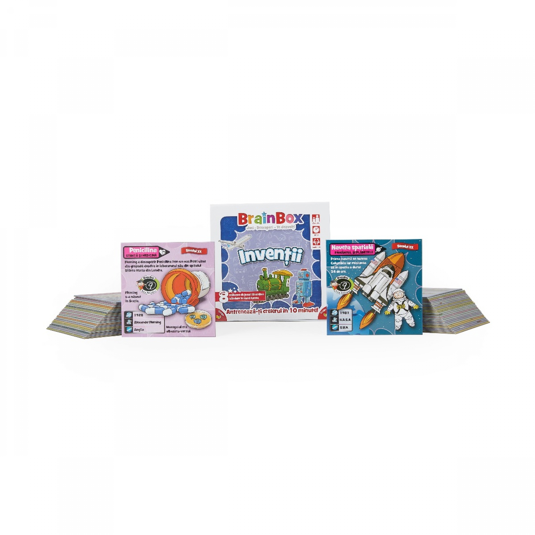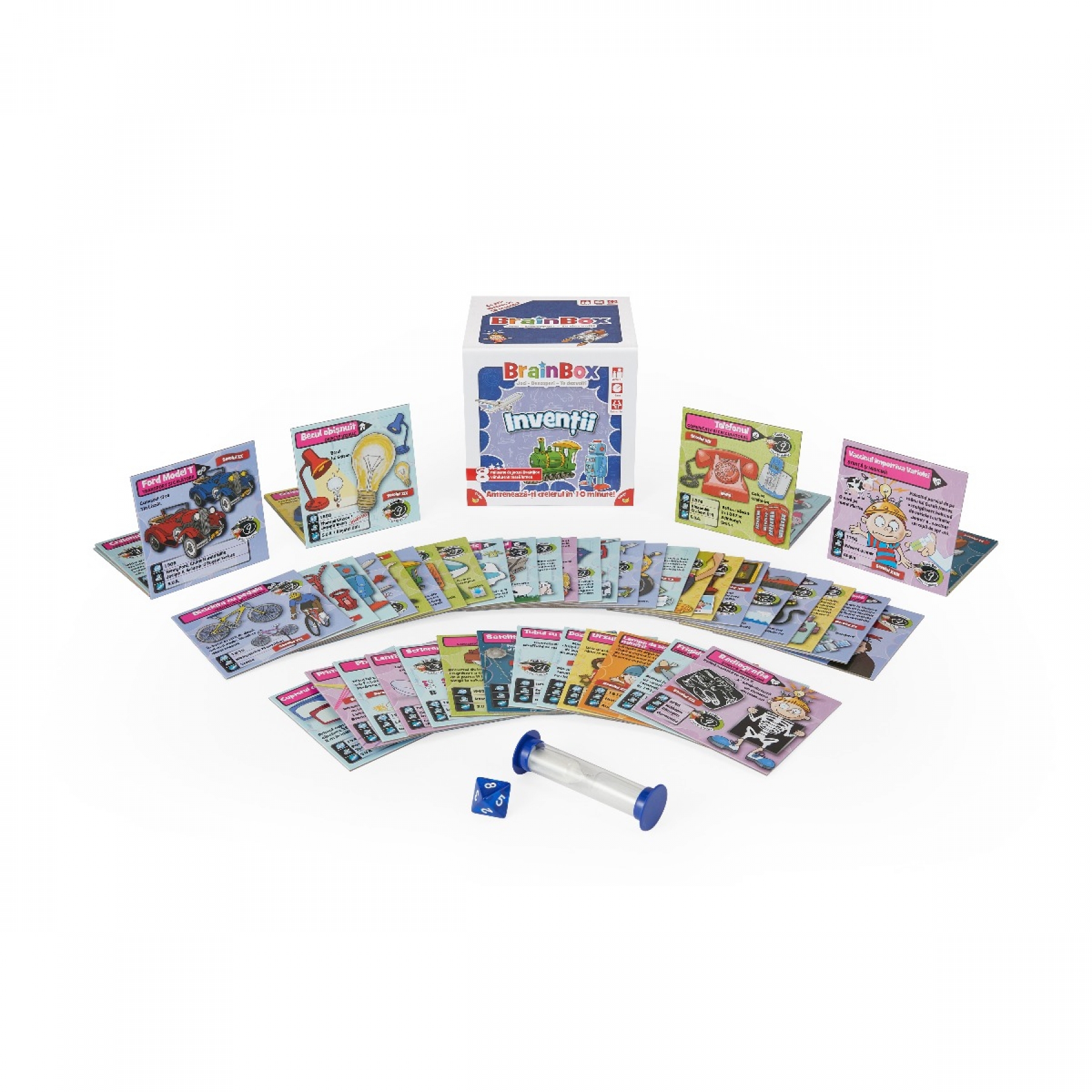 BrainBox Inventii - Joc de carti distractiv si educativ pentru copii peste 8 ani BrainBox este joc de carti distractiv de memorie si observare, testA nd atentia la detalii. Ce iti poti aminti in doar 10 secunde? Aceasta editie a jocului de inventii prezinta inventatorii si creatiile lor care ne-au schimbat lumea. BrainBox Inventii contine 55 de carti de joc, fiecare descriind in detaliu cine, unde, cA nd si de ce privind un moment inventiv din istoria omenirii. Ilustratiile desenate manual dau viata detaliilor unor inventii precum: avioanele, clonarea, artificiile, GPS-ul, internetul, jocurile video si multe altele. Jocul va ajuta copiii sa invete despre originea inventiilor, dezvoltA nd totodata competentele cognitive de observare si de rememorare, care stau la baza invatarii pe tot parcursul vietii. PREZINTA MARI INVENTATORI SI INVENTII DIN TOATE TIMPURILE: Testeaza-ti memoria si spiritul de observatie, raspunzA nd la intrebari despre internet, baloane cu aer cald, raze X si multe altele 440 DE INTREBARI DESPRE INVENTII: Te poti bucura de joc in doar 5 sau 10 minute, dar datorita sutelor de intrebari, poti petrece ore de distractie, iar niciun joc nu va semana cu celelalte JOC INDIVIDUAL SAU IN FAMILIE: Joaca singur sau cu familia si cu prietenii. Provocarea este simpla: cA t de mult iti poti aminti de pe cartea aleasa in doar 10 secunde DISTRACTIV, EDUCATIV: BrainBox este creat pentru a fi distractiv, oferind si un antrenament pentru memorie, gratie intrebarilor bazate pe memorie, observare. Jocul este aprobat de Muzeul de stiinte JOCUL CONTINE: 55 de carti de joc cu 440 de intrebari individuale, 1 carte cu reguli de joc, 1 zar cu 8 fete 1 cronometru pentru zece secunde