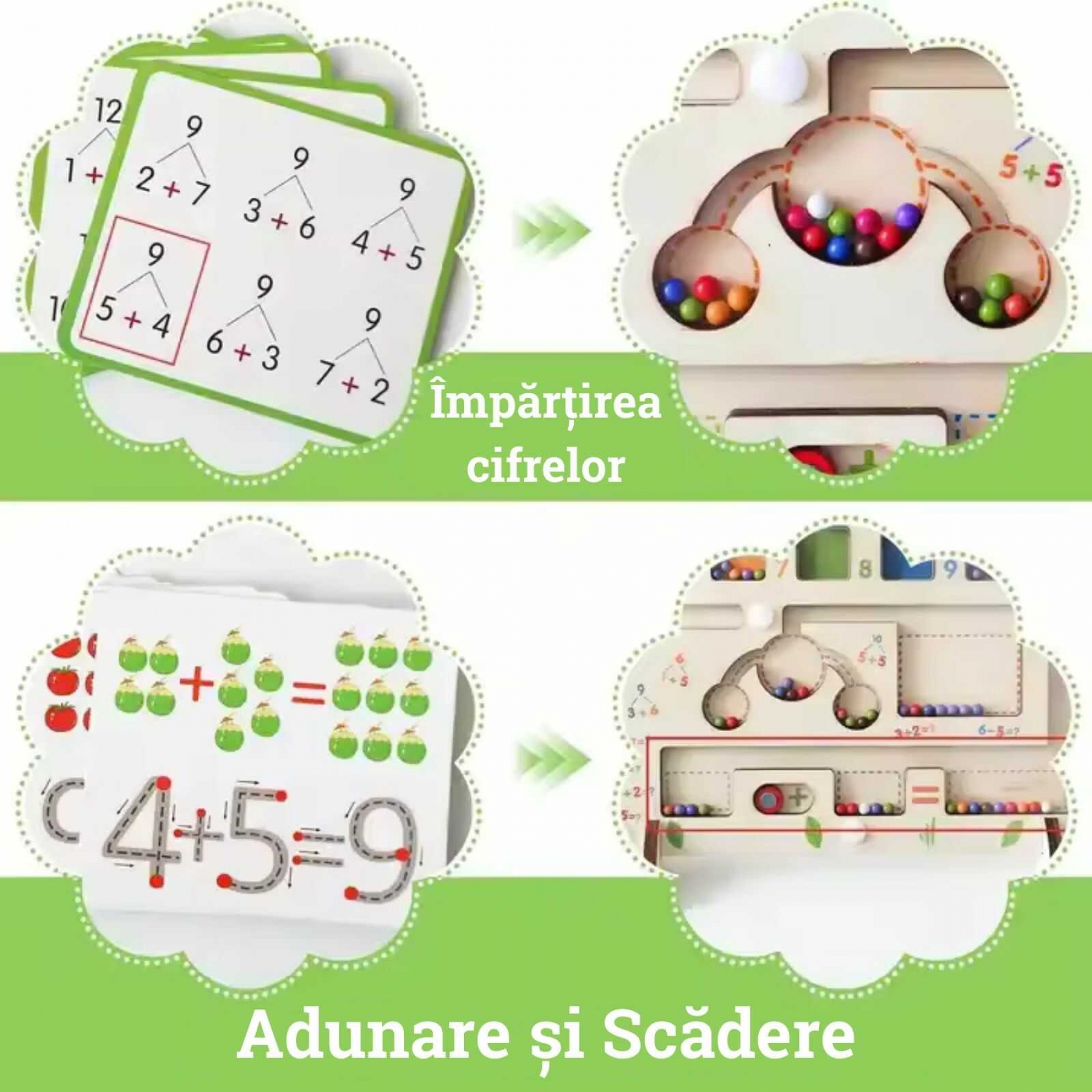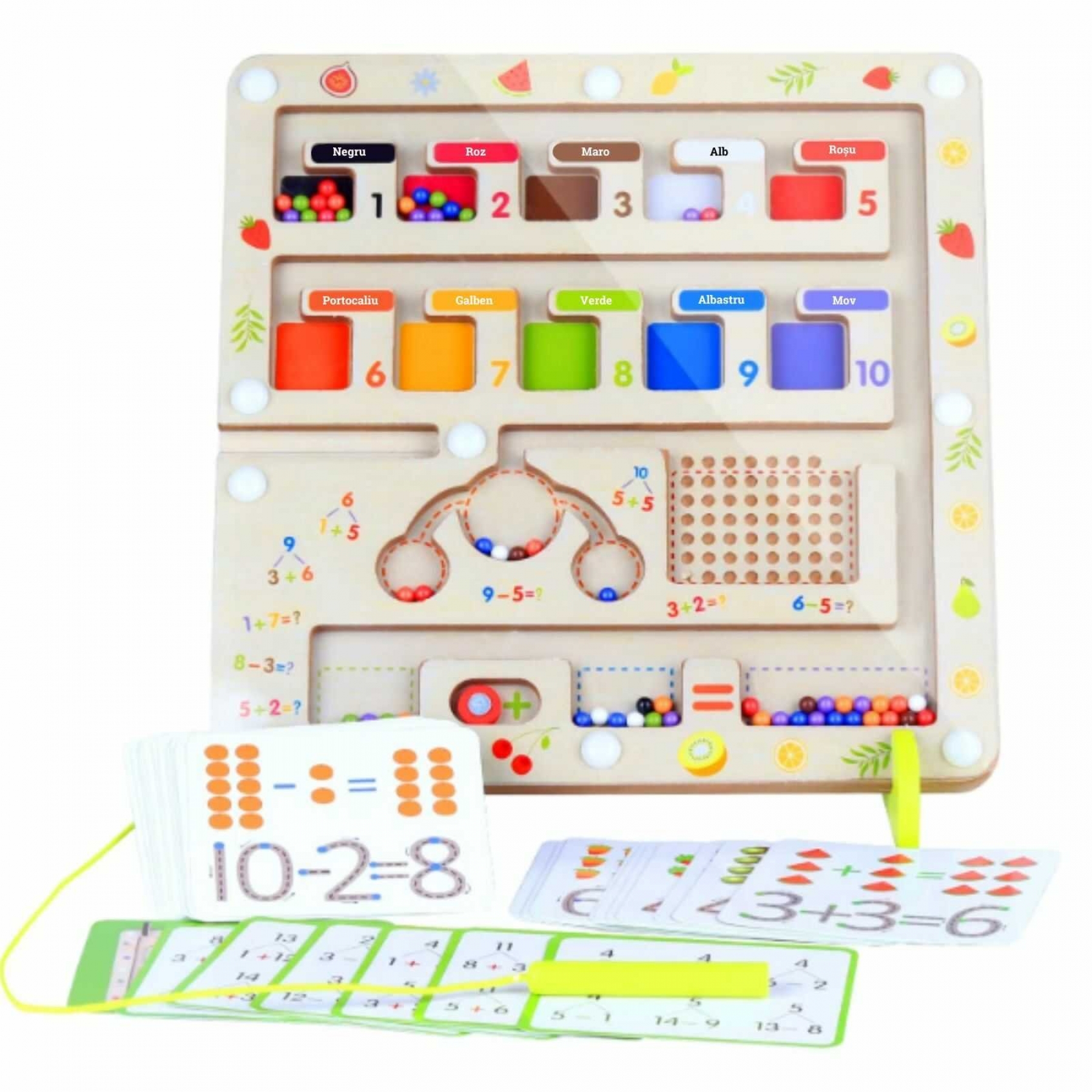 Joc Educativ multifunctional in limba romana: Labirint Magnetic din Lemn cu functii de Sortare, Clasificare si Matematica Joc educativ captivant si multifunctional, perfect pentru dezvoltarea abilitatilor cognitive la copiii mici ce ofera o experienta interactiva si distractiva, incurajand sortarea, clasificarea si rezolvarea problemelor matematice in limba romana. Caracteristici principale: Multifunctionalitate Integrata: Acest joc educativ ofera mai multe functii integrate, inclusiv sortare culori, numerotare, operatiuni matematice simple si multe altele, contribuind la dezvoltarea abilitatilor cognitive si a gandirii logice. Carduri cu Provocari: Include 30 de carduri lucioase cu provocari fata-verso, oferind 60 de exercitii variate ce pot fi rezolvate pe labirint, incurajand copiii sa gandeasca creativ si strategic. Realizat din lemn durabil si cu o suprafata de plastic rezistenta, acest labirint este sigur si durabil pentru utilizare indelungata. Beneficii: Dezvoltarea Abilitatilor Cognitive: Stimuleaza recunoasterea culorilor, numerelor si operatiilor matematice simple, contribuind la dezvoltarea abilitatilor cognitive la copiii mici. Invatare Interactiva: Ofera o modalitate interactiva si distractiva de a invata si de a rezolva probleme, incurajand imaginatia si creativitatea. Motricitate Fina: Exersarea abilitatilor motorii fine prin manipularea si aranjarea bilutelor colorate cu ajutorul creionului magnetic atasat, dezvoltand astfel coordonarea mana-ochi. Gandire Logica: Stimuleaza gandirea strategica si logica prin rezolvarea provocarilor de pe carduri si navigarea prin labirint. Contine: - Labirint din lemn cu suprafata de plastic rezistenta, cu dimensiunea de 22 x 22 x 1.5 cm - 10 chenare cu diferite culori si denumiri scrise in limba romana - 55 de bilute colorate pentru sortare si clasificare - Creion magnetic pentru plimbarea bilutelor - 2 picioare din lemn pe care se poate aseza tabla de joc - 30 de carduri imprimate fata verso cu diferite provocari (adunari, scaderi) Acest joc educativ multifunctional este ideal pentru copiii mici, oferindu-le o experienta captivanta si educativa, sprijinindu-i in dezvoltarea lor cognitiva si in invatarea interactiva si distractiva a culorilor, numerelor si operatiilor matematice simple. Varsta recomandata: 3 ani+