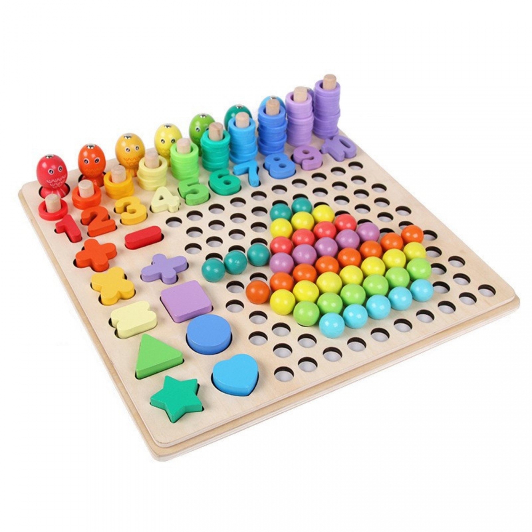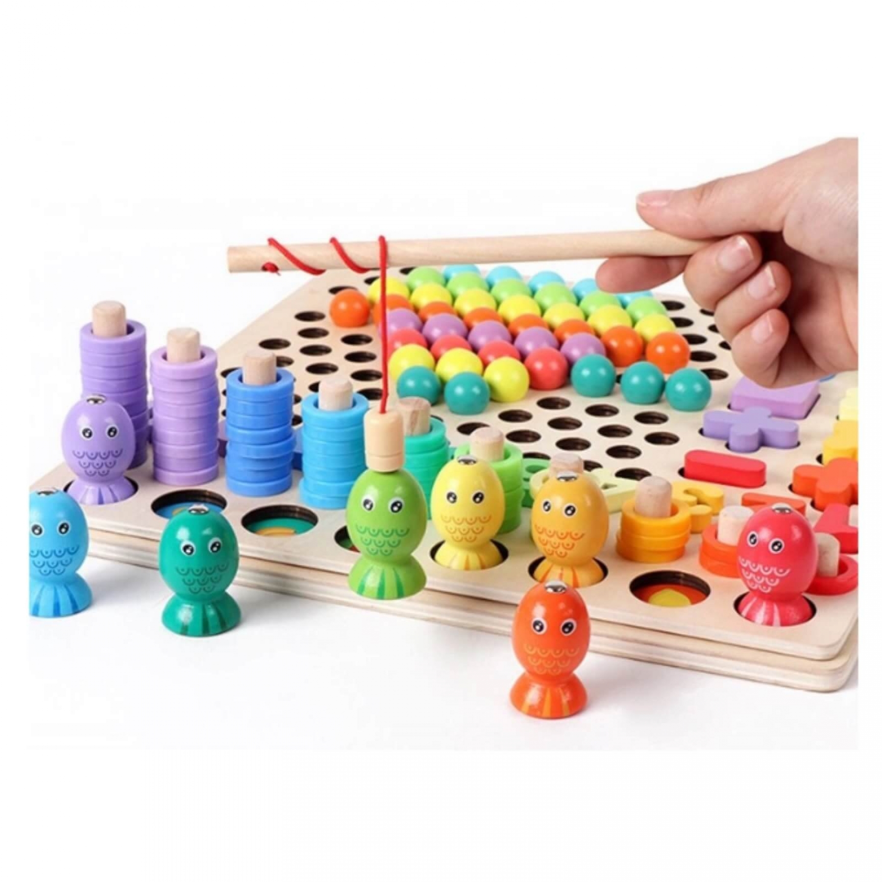 Joc de tip Montessori, ce dezvolta indemanarea, asocierea si rabdarea copiilor cu bile colorate, boluri din silicon, pestisori si undite pentru pescuit, joc logarithmic de stivuire piese. Dezvolta motrocitatea si dexteritatea mainilor cu un superb joc de potrivire si sortare culori! In loc sa foloseasca degetele pentru prinderea si asezarea pieselor, copiii vor trebui sa foloseasca un cleste sau chopsticks (2 betisoare din lemn folosie ca tacam pentru mancarea chinezeasca) - copiii pot exersa mai multe tipuri de prindere. Mod de utilizare : - copilul poate aseza bilele pe placa ajutandu-se de cele 3 sabloane incluse, imprimate fata verso (trebuie sa respecte ceea ce este desenat pe ele) sau in mod liber, dupa cum doreste; - dupa ce s-a obisnuit cu modalitatea de joc, se creste gradul de dificultate, utilizand clestele, betisoarele din lemn sau lingurita pentru a aseza bilele pe placa din lemn cu gaurele; - bilutele din lemn se vor sorta in cele 7 boluri din silicon, fiecare bol trebuie sa contina 11 bile de aceeasi culoare, in total 77 bilute 7 culori 7 boluri. Aceasta etapa ajuta la dezvoltarea abilitatilor de a sorta si a asocia culorile; - pentru a exersa prinderea si mai ales rabdarea, se recomanda jocul de pescuit compus din 10 pestisori si 2 undite din lemn; - puzzle 3d din lemn cu cifre si semne operatii matematica - puzzle incastru din lemn cu cifre de la 1 la 10 si semne specifice operatiilor matematice de baza; - puzzle 3d din lemn cu forme geometrice - puzzle incastru din lemn cu forme geometrice (triunghi, patrat, dreptunghi, etc); - joc de stivuire piese pe coloane - 10 coloane cu cercuri colorate pe care copilul va stivui numarul corespunzator de cercuri si culoarea aferenta; - 8 pestisori colorati prevazuti cu un punct metalic in partea superioara si o undita din lemn cu ajutorul careia pestisorii pot fi pescuiti. Jocul e mai dificil decat pare si va dezvolta atentia, indemanarea dar si vederea in spatiu a copiilor. Recomandat si in cadrul terapiilor de tip recuperare a motricitatii de baza a mainilor si bratelor sau pentru persoanele cu deficiente de miscare. Perfect pentru clinici sau cabinete de kinetoterapie, dar si pentru camine pentru seniori varstnici. Jocul de indemanare si asociere culori este format din : - 1 buc baza lemn formata din 2 table care se imbina; - 7 cupe boluri din silicon pentru a pune bilutele colorate in ele. Fiecare bol din silicon este asociat unei culori; - 77 bile colorate, cate 11 bile per culoare, culori asociate cu cele 7 boluri; - 1 buc chopsticks - doua betisoare din lemn; - 1 buc cleste din lemn; - 1 buc lingura din lemn; - 3 buc planse cu diferite modele care se introduc pe rand in baza din lemn; - 8 buc pestisori colorati din lemn prevazuti cu un punct metalic in partea superioara pentru a putea fi pescuiti; - 1 buc undite din lemn; - 10 cifre din lemn; - forme geometrice din lemn; - joc logaritmic de stivuire piese pe coloane. Dimensiune tabla de joc: 30 cm x 30 cm; Dimensiune undita: 15 cm; Dimensiune cleste: 15 cm; Dimensiune betisoare lemn chopsticks: 18 cm; Dimensiune lingura: 13 cm. Set care face parte din seria de produse , žPedagogia Frobel, , sistem care are ca baza utilizarea in dezvoltarea timpurie a copilului exclusiv produse din lemn de calitate inalta, culori calde si proprietati tactile naturale. Pentru: Baieti, Fete. Varsta: + 3 ani Abilitati dezvoltate: Dexteritatea, Inteligenta, Gandirea, Atentia, Memoria. Material: Lemn Poveste Personaj: Abilitati practice, Culoare: Multicolor Functii: Dezvoltarea capacitatii de asociere - potrivire, forme geometrice. Lungime: 30 cm. Latime: 30 cm.