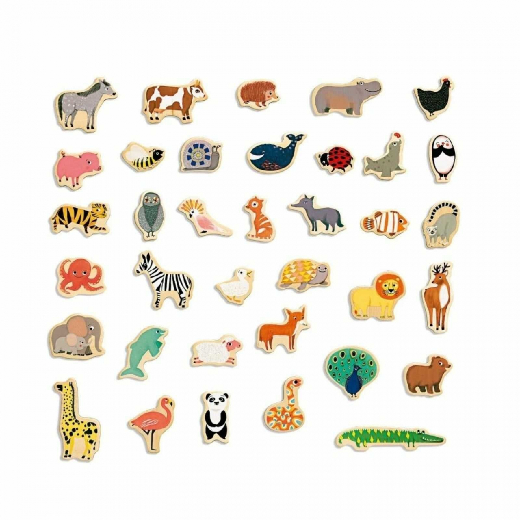 Joc magnetic cu 36 animale salbatice si domestice. Joc creativ cu piese magnetice. Contine 36 de piese din lemn cu magnet pe spate. Cu acest joc magnetic copiii cu varsta de 2 ani si peste 2 ani, se vor familiariza cu animalele salbatice dar si cu cele domestice. Jocul ajuta prichindelul sa se bucure de animalute vesele si sa le indrageasca pe cele reale si este util mai ales pentru a indeparta frica celor mici de animalele vii la primul contact cu acestea din urma. Confectionat din lemn si vopsele non toxice conform reglementarilor EN71ASTM. Avertisment: Acest joc contine magneti! Magnetii se lipesc unul de altul sau de un obiect metalic. Cereti imediat asistenta medicului in caz de inghitire.Contraindicat copiilor sub 2 ani. A se folosi sub directa supraveghere a unei persoane adulte. Producator: Djeco, Franta. Varsta recomandata : + 2 ani.