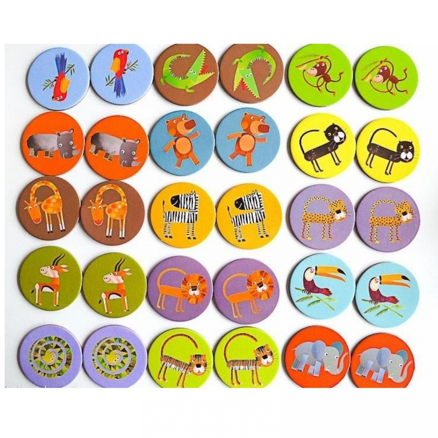 Stimuleazǎ spiritul de observatie, atentia si memoria. Contine 30 piese. Instructiuni de joc pentru copiii de 2 ani: la inceputul jocului piesele se amestecǎ si se asazǎ cu imaginea in sus pe linii ordonate (ex. 6 randuri si 8 coloane ). Copilul trebuie sǎ recunoascǎ piesele identice (pereche) si sǎ le dea deoparte panǎ eliminǎ toate piesele. Instructiuni de joc pentru copii de peste 4 ani: Se joacǎ in grupuri de 2 panǎ la 4 persoane. La inceputul jocului piesele se amestecǎ si se intorc cu imaginea in jos, asezate pe linii ordonate (ex. 6 randuri si 8 coloane). Fiecare jucǎtor, alege douǎ piese; dacǎ sunt identice le scoate din joc, iar dacǎ nu le pune la loc in aceeasi pozitie si tine minte imaginile lor. Se aratǎ tuturor jucǎtorilor imaginile, acestia trebuind sǎ le retinǎ. Se continuǎ in acest mod panǎ la eliminarea completǎ a pieselor din joc. Castiga cel care reuseste sǎ adune cele mai multe perechi. Varsta recomandata: 2 ani+. Producator: Djeco, Franta Confectionat din materiale si vopsele non toxice conform reglementarilor EN71 ASTM. Avertismente! Jucaria produsul poate contine piese mici care se pot inghiti sau inhala existand pericolul de sufocare sau nu este potrivita copiilor mai mici de 2 ani. Nu lasati ambalajele jucariilor produselor la indemana copiilor. Indepartati orice ambalaj al jucariei produsului inainte de a da jucaria produsul copilului. Va rugam sa supravegheati copilul in timp ce se joaca foloseste acest produs. Pastrati instructiunile si etichetele pentru referinte viitoare. Pastrati jucaria produsul departe de foc, feriti jucaria produsul de temperaturi ridicate si umiditate. Produsul este nou si comercializat in ambalajul original al producatorului. Imaginile au caracter informativ. Nuanta, tonul si intensitatea culorii pot varia in functie de monitor.
