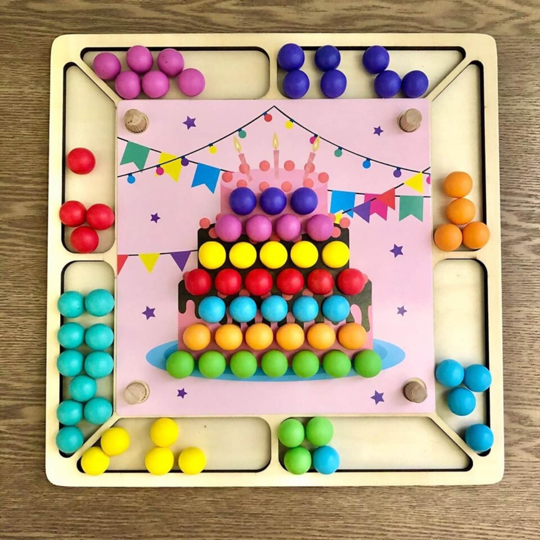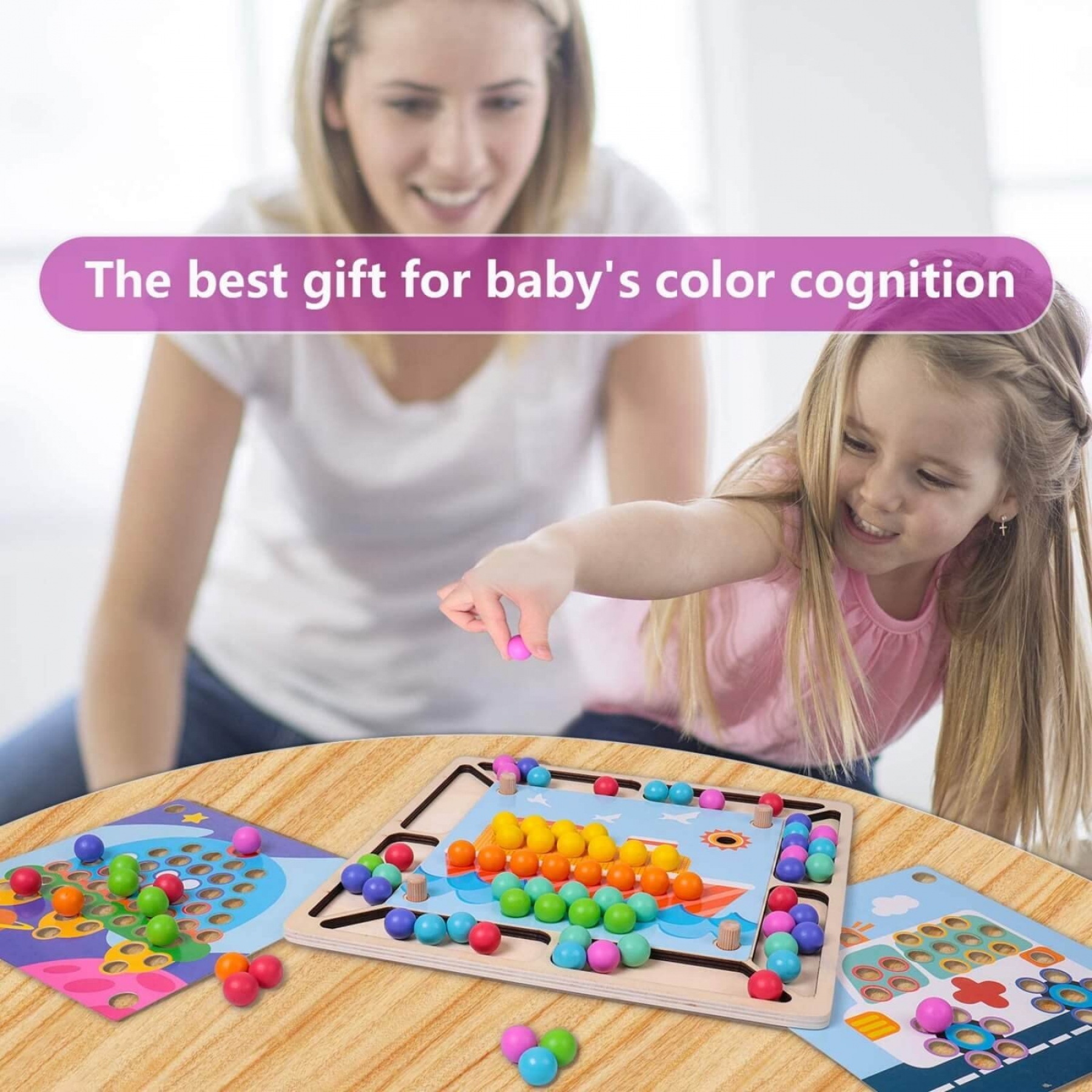 Joc de tip Montessori, ce dezvolta indemanarea, asocierea si rabdarea copiilor cu bile colorate si planse cu desene. Dezvolta motrocitatea si dexteritatea mainilor cu un superb joc de potrivire, asociere si sortare culori! In loc sa foloseasca degetele pentru prinderea si asezarea bilutelor colorate, copiii vor trebui sa foloseasca un cleste sau chopsticks (2 betisoare din lemn folosite ca tacam pentru mancarea chinezeasca) - copiii pot exersa mai multe tipuri de prindere. Mod de utilizare : - copilul poate aseza bilele pe placa ajutandu-se de cele 10 sabloane incluse (trebuie sa respecte ceea ce este desenat pe ele) sau in mod liber, dupa cum doreste; - dupa ce s-a obisnuit cu modalitatea de joc, se creste gradul de dificultate, utilizand clestele sau betisoarele din lemn pentru a aseza bilele pe placa din lemn cu gaurele. Jocul e mai dificil decat pare si va dezvolta atentia, indemanarea dar si vederea in spatiu a copiilor. Recomandat si in cadrul terapiilor de tip recuperare a motricitatii de baza a mainilor si bratelor sau pentru persoanele cu deficiente de miscare. Perfect pentru clinici sau cabinete de kinetoterapie, dar si pentru camine pentru seniori varstnici. Jocul de indemanare si asociere culori este format din : - 1 buc baza lemn formata dintr-o placa perforata unde se vor aseza bilele colorate iar pe laterale este prevazuta cu spatii speciale pentru a sorta bilele pe culori; - 80 bile colorate, cate 10 bile per culoare; - 1 buc chopsticks - doua betisoare din lemn; - 1 buc cleste din lemn. Dimensiune tabla de joc : 30 cm x 30 cm. Set care face parte din seria de produse , žPedagogia Frobel, , sistem care are ca baza utilizarea in dezvoltarea timpurie a copilului exclusiv produse din lemn de calitate inalta, culori calde si proprietati tactile naturale.