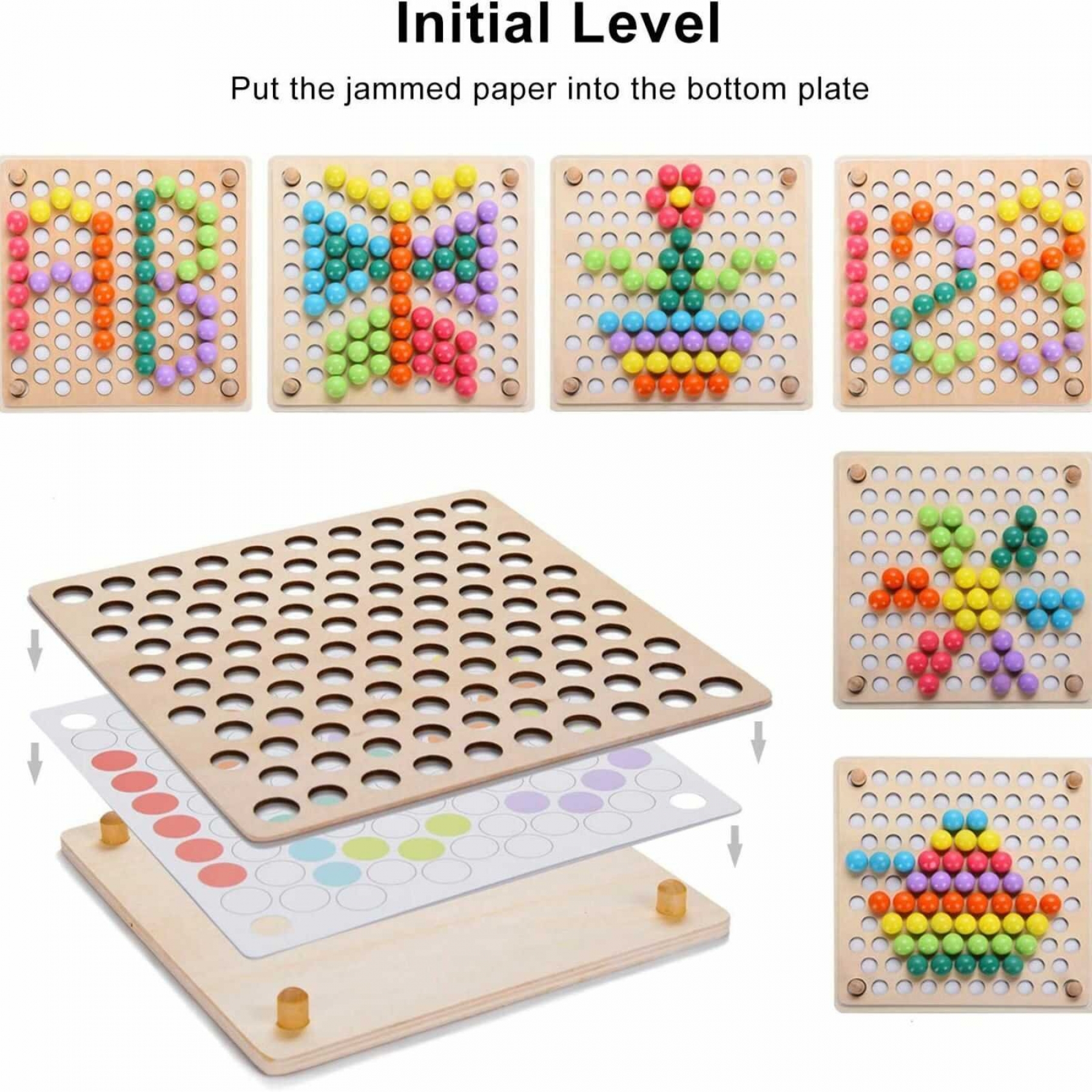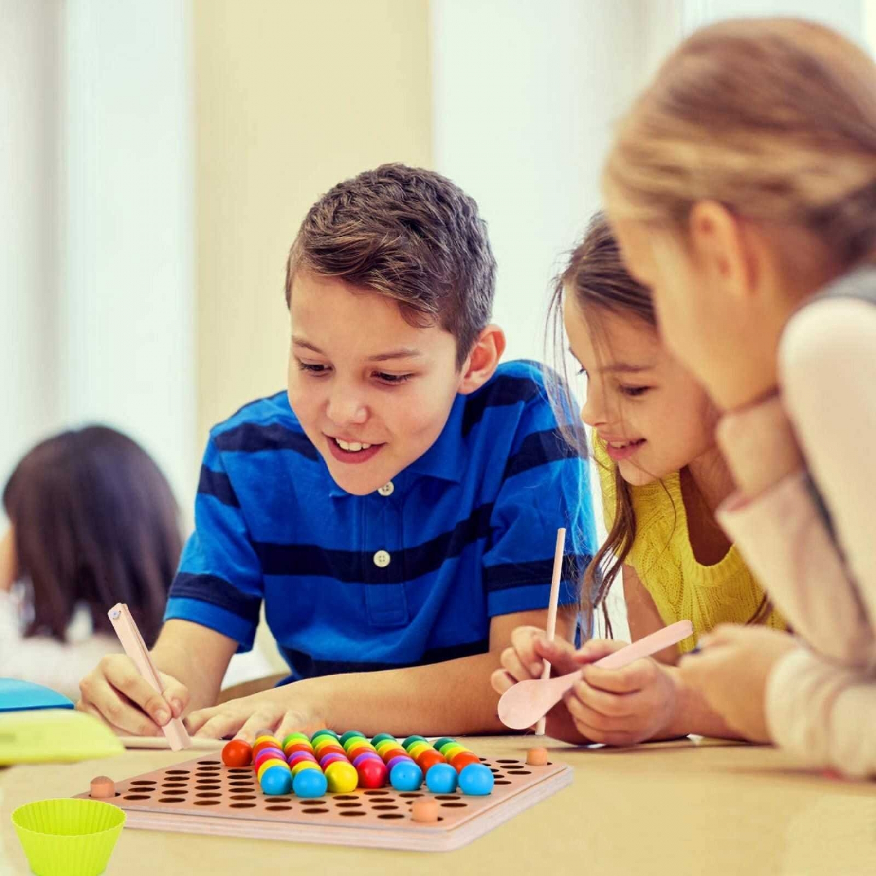 Joc de tip Montessori, ce dezvolta indemanarea, asocierea si rabdarea copiilor cu bile colorate si boluri din silicon. Dezvolta motrocitatea si dexteritatea mainilor cu un superb joc de potrivire, asociere si sortare culori! In loc sa foloseasca degetele pentru prinderea si asezarea pieselor, copiii vor trebui sa foloseasca un cleste sau chopsticks (2 betisoare din lemn folosie ca tacam pentru mancarea chinezeasca) - copiii pot exersa mai multe tipuri de prindere. Mod de utilizare : - copilul poate aseza bilele pe placa ajutandu-se de cele 5 sabloane incluse (trebuie sa respecte ceea ce este desenat pe ele) sau in mod liber, dupa cum doreste; - dupa ce s-a obisnuit cu modalitatea de joc, se creste gradul de dificultate, utilizand clestele , betisoarele din lemn sau lingurita pentru a aseza bilele pe placa din lemn cu gaurele; - bilutele din lemn se vor sorta in cele 7 boluri din silicon , fiecare bol trebuie sa contina 11 bile de aceeasi culoare , in total 77 bilute 7 culori 7 boluri . Aceasta etapa ajuta la dezvoltarea abilitatilor de a sorta si a asocia culorile; Jocul e mai dificil decat pare si va dezvolta atentia, indemanarea dar si vederea in spatiu a copiilor. Recomandat si in cadrul terapiilor de tip recuperare a motricitatii de baza a mainilor si bratelor sau pentru persoanele cu deficiente de miscare. Perfect pentru clinici sau cabinete de kinetoterapie, dar si pentru camine pentru seniori varstnici. Jocul de indemanare si asociere culori este format din : - 1 buc baza lemn formata din 2 table care se imbina; - 7 cupe boluri din silicon pentru a pune bilutele colorate in ele. Fiecare bol din silicon este asociat unei culori; - 77 bile colorate, cate 11 bile per culoare, culori asociate cu cele 7 boluri; - 1 buc chopsticks - doua betisoare din lemn; - 1 buc cleste din lemn; - 1 buc lingura din lemn; Dimensiune tabla de joc : 23 cm x 23 cm; Set care face parte din seria de produse , žPedagogia Frobel, , sistem care are ca baza utilizarea in dezvoltarea timpurie a copilului exclusiv produse din lemn de calitate inalta, culori calde si proprietati tactile naturale. Avertismente! Jucaria produsul poate contine piese mici care se pot inghiti sau inhala existand pericolul de sufocare sau nu este potrivita copiilor mai mici de 3 ani. Nu lasati ambalajele jucariilor produselor la indemana copiilor. Indepartati orice ambalaj al jucariei produsului inainte de a da jucaria produsul copilului. Va rugam sa supravegheati copilul in timp ce se joaca foloseste acest produs. Pastrati instructiunile si etichetele pentru referinte viitoare. Pastrati jucaria produsul departe de foc, feriti jucaria produsul de temperaturi ridicate si umiditate . Imaginile au caracter informativ. Nuanta, tonul si intensitatea culorii pot varia in functie de monitor.