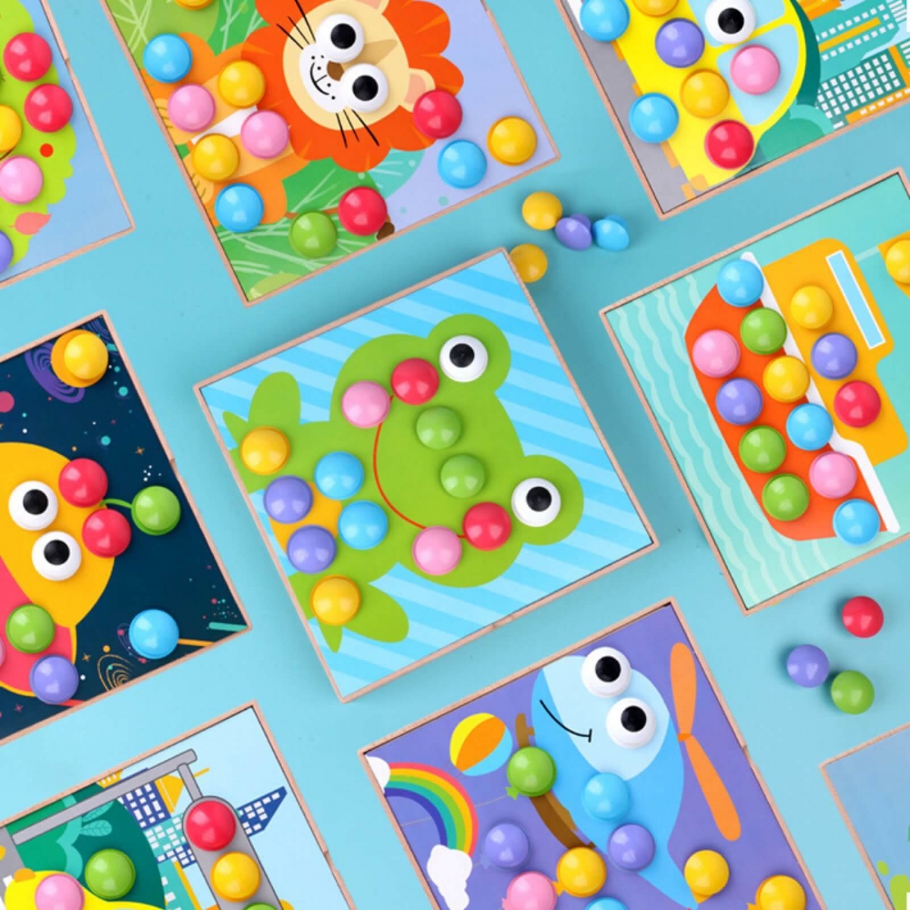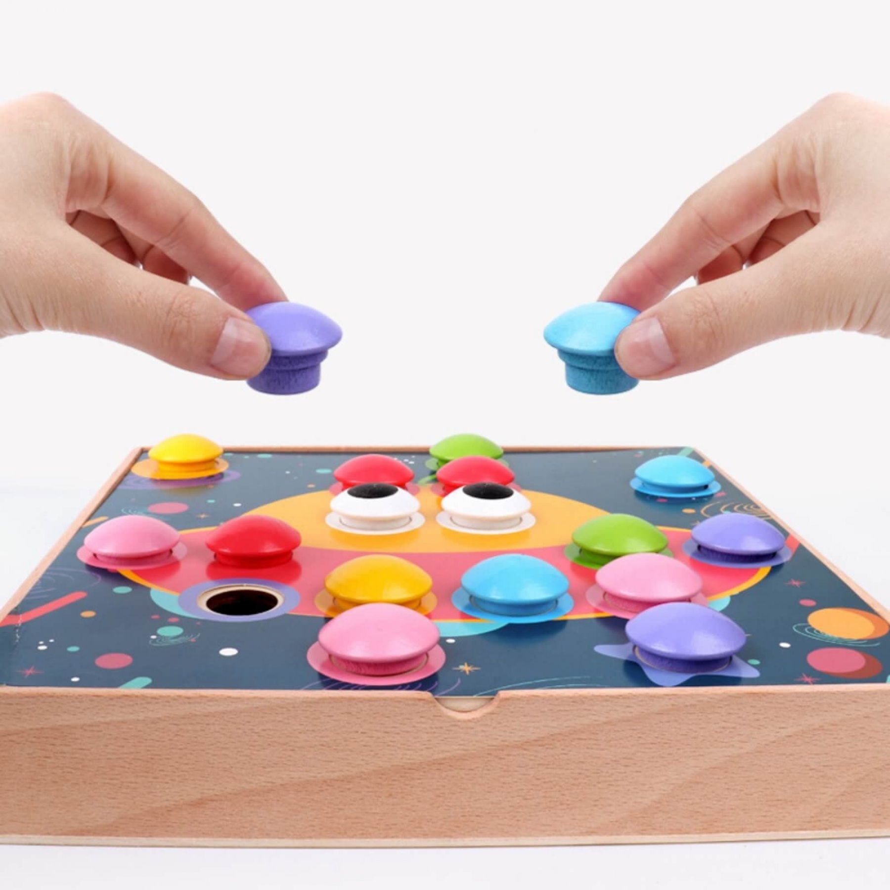 Joc mozaic creativ genius cu butoni mari, din lemn, pentru copii. Joc mozaic pentru copii, cu pioneze butoni din lemn, usor de manevrat, potrivite pentru incepatori, stimuleaza creativitatea si concentrarea copiilor si incurajeaza gandirea creativa. Cu ajutorul acestui joc copiii pot crea mozaicuri minunate iar dupa ce termina un mozaic pur si simplu copilul trebuie doar sa intoarca tabla si sa impinga piesele, iar dupa o poate lua de la capat. Mozaicul colorat din lemn garanteaza nu doar distractia celui mic, ci si dezvoltarea partii artistice. Simplu de folosit ! Piesa cu piesa, culoare cu culoare, copilul dumneavoastra va recrea lumea inconjuratoare cu ajutorul celor 8 planse incluse. Jocul mozaic Creativ din lemn include : - 8 planse de joc , suport model pentru creatia de imagini; - 1 tava din lemn pentru depozitarea pieselor; - suport cu gaurele din lemn; - 36 de piese rotunde si colorate din lemn. Material : Lemn, piesele sunt vopsite cu vopsele nontoxice, in culori vii. Dimensiune cutie depozitare mozaic : 25 x 25 x 4cm. Dimensiune piesa buton : 3 cm diametru x 2.5 cm inaltime. Dimensiune plansa : 24 x 24 cm. Varsta recomandata : 3 ani + ( se poate utiliza si incepand cu varsta de 2 ani sub atenta supraveghere a unui adult ).