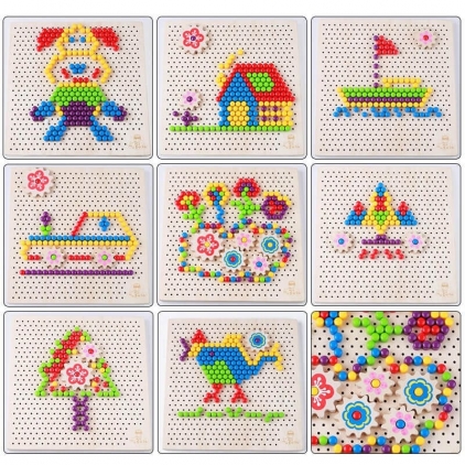 Joc mozaic creativ din lemn de tip Pixel Jocul mozaic cu pioneze. Este un joc de creatie si de imaginative intrucat ii ofera celui mic nelimitate moduri de constructie, nelimitate modele dar si nelimitate ore de distractie. Joc mozaic pentru copii, un concept nou si modern bazat pe desenul tip Pixel, inspirat din diversele jocuri indragite de copii. Cu ajutorul acestui joc copii pot crea mozaicuri minunate. Jocul stimuleaza dezvoltarea coordonarii ochi-mana, iar copii se vor amuza inventand propriile modele de mozaic Dupa ce ati terminat cu un model, pentru a elibera tabla de joc pur si simplu intoarceti tablita pe dos si impingeti piesele direct in cutie. Stimuleaza creativitatea si gandirea logica Jocul include: - cutie din lemn ca baza si pentru depozitarea pinilor peg; - 257 piese PEG din plastic de diferite culori; - 5 piese roti zimtate de diferite culori pentru creatii cat mai interesanta; - plansa din lemn cu gaurele in care se insereaza pinii PEG , plansa se pune pe suportul cutie. Material: Lemn, piesele sunt vopsite cu vopsele nontoxice, in culori vii. Dimensiuni aproximative tabla de joc: 29 x 29 x 4 cm Varsta recomandata: 4 ani +.