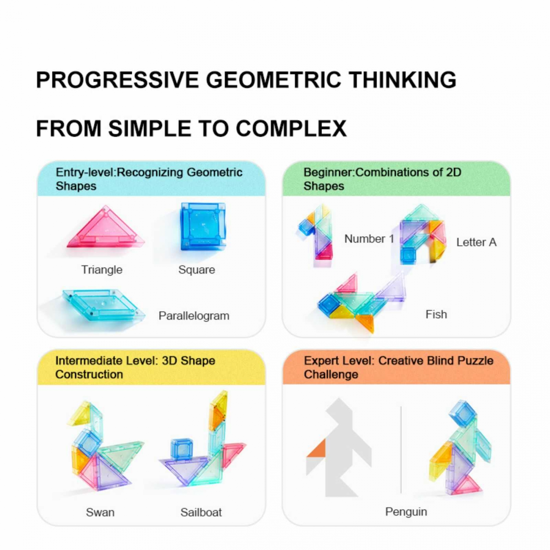 Tangram Magnetic - Joc educativ de logica si inteligenta pentru copii, cu 7 piese cu magneti, clepsidra si brosura cu peste 100 de modele de realizat. Jocul este util pentru copiii care intampina dificultati la matematica, deoarece prin aranjarea pieselor de tangram se obtine dezvoltarea gandirii logice, intelegerea conceptului de forma, modelarea matematica (construieste modele), recunoasterea modelelor si a formelor geometrice, clasificarea lor, identificarea corecta a relatiilor spatiale dintre formele geometrice, etc. Jocul Tangram Magnetic este conceput special pentru copii si contine 7 de piese magnetice cu forme geometrice variate. Cu aceste piese, cei mici pot explora tehnica tangram, construind si reconstituind diverse figuri. Fie ca sunt animale adorabile, obiecte uimitoare sau chiar personaje din povesti, posibilitatile sunt nelimitate, incurajand imaginatia si creativitatea. Piesele magnetice fac ca experienta de joc sa fie mai interactiva si mai distractiva. Copiii pot simti bucuria reusitei in timp ce piesele se aliniaza magnetic pentru a crea forme surprinzatoare. Aceasta interactiune tactila nu doar imbunatateste coordonarea ochi-mana, ci si stimuleaza simturile, oferindu-le copiilor o experienta educationala completa. Pe langa faptul ca este o o modalitate minunata de petrecere a timpului liber, Jocul Tangram Magnetic este si un instrument educativ eficient. Prin rezolvarea provocarilor din brosura, copiii dezvolta gandirea logica si spatiala, isi imbunatatesc abilitatile matematice si invata sa gaseasca solutii ingenioase pentru problemele complexe. Datorita dimensiunii compacte, este un joc portabil, poate fi pus cu usurinta in ghiozdan si se poate juca oriunde, in masina, in timpul calatoriilor. Setul contine : - 7 piese magnetice de diferite culori si forme geometrice; - brosura cu peste 100 de modele de realizat; - o clepsidra pentru a cronometra timpul de realizare a unei forme. Siguranta este esentiala pentru copii, de aceea piesele cu magnet de la Mideer sunt testate EN71 si sunt realizate din magneti compacti care sunt incapsulati in interiorul pieselor, procedeu realizat prin prin sudare cu ultrasunete, astfel sunt sigure pentru copii. Piesele magnetice sunt sigure pentru copii, nu contin BPA, ftalati sau materiale toxice, respectand standardele internationale de calitate si siguranta CE, EN71 si ASTM. Varsta recomandata : 3 ani+ Dimensiuni cutie : 14.3 x 11.5 x 3 cm Dimensiuni piese magnetice : intre 3.7 x 3.7 cm si 7.5 x 7.5 cm Jocul Tangram Magnetic reprezinta alegerea perfecta pentru parintii dornici sa ofere copiilor lor o experienta de invatare plina de bucurie si entuziasm.