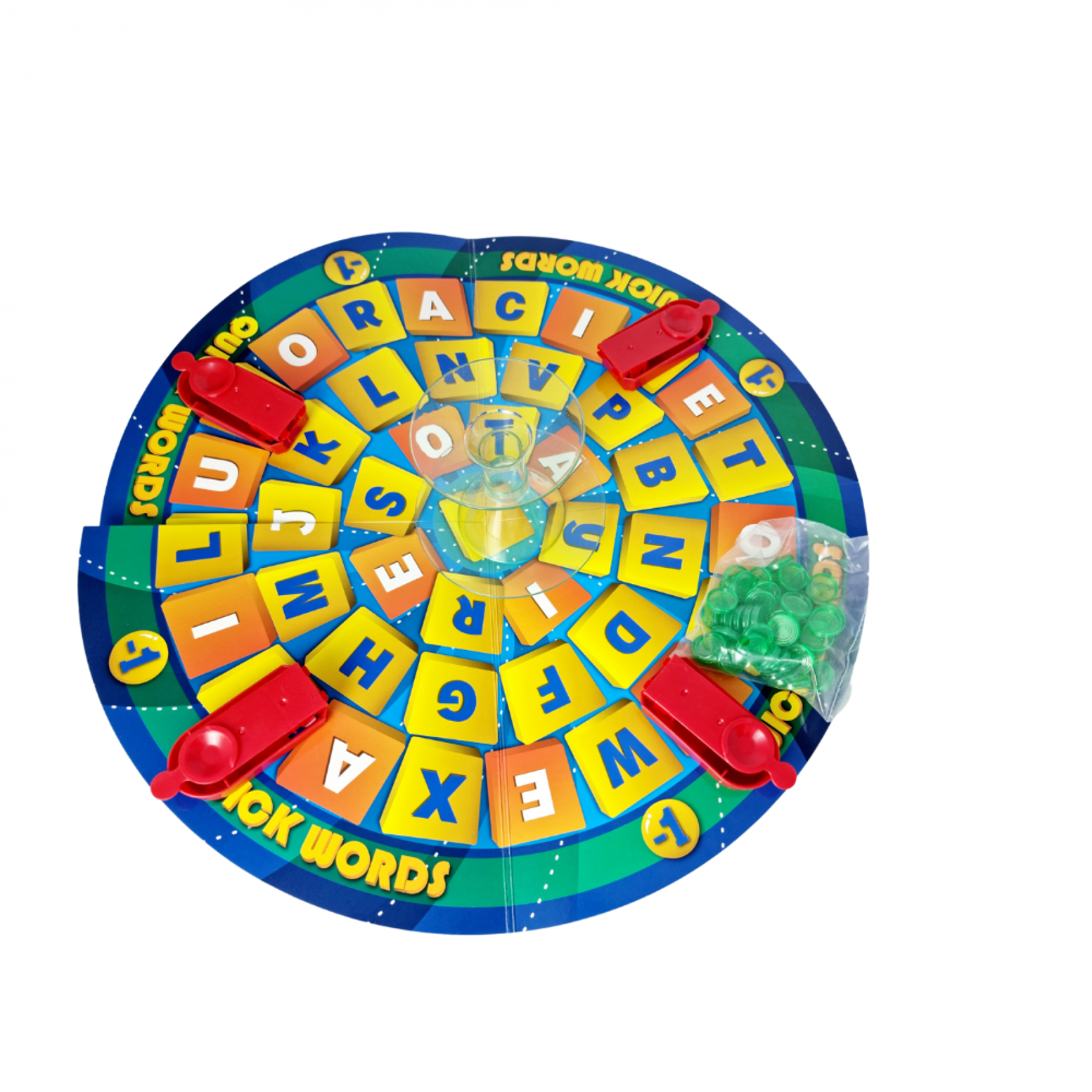 Esti pregatit pentru o cursa...cu cuvinte? Caracteristici: puneti jetoanele pe catapulta si aruncati-le in aer pentru a descoperi litera cand va vine randul, plasati un jeton in spatiul special destinat de pe parghie. Impingeti partea superioara a parghiei in jos si rasturnati un jeton pe placa. daca jetonul ajunge pe o litera, aceasta litera este acum disponibila pentru joc. cand sunt acoperite cel putin 3 litere, puteti striga orice cuvant permis pe care il puteti face cu ele. Daca sunteti primul care striga un cuvant, luati jetoanele pe care le-ati pus deasupra literelor si puneti-le in propria gramada de jetoane ideal pentru dezvoltarea limbajului, a creativitatii si a indemanarii joc pentru 2 -4 jucatori jocul poate fi jucat in limba romana sau in limba engleza, fiind alegerea jucatorilor Setul contine: plansa de joc turn central 50 de jetoane din plastic 4 catapulte Dimensiune ambalaj: 26.5 x 26.5 x 6.5 cm Varsta recomandata : 5 ani + Atentie! Contraindicat copiilor mai mici de 3 ani. Jucaria produsul poate contine piese mici care se pot inghiti sau inhala existand pericolul de sufocare sau nu este potrivita copiilor mai mici de 3 ani. Nu lasati ambalajele jucariilor produselor la indemana copiilor. Indepartati orice ambalaj al jucariei produsului inainte de a da jucaria produsul copilului. Va rugam sa supravegheati copilul in timp ce se joaca foloseste acest produs. Pastrati instructiunile si etichetele pentru referinte viitoare. Pastrati jucaria produsul departe de foc, feriti jucaria produsul de temperaturi ridicate si umiditate.