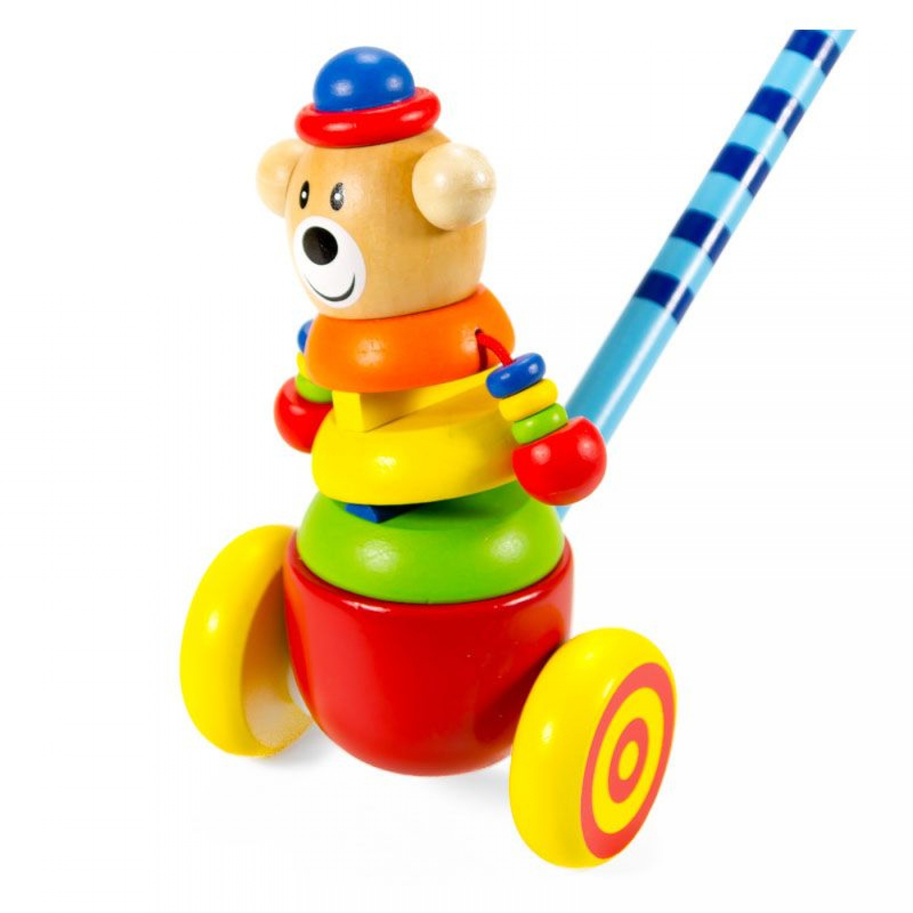 Jucaria in forma de ursulet simpatic este confectionata din lemn, vopsita in culori vesele non-toxice si prevazuta cu roti rezistente. Ursuletul se misca in momentul in care jucaria este impinsa inainte sau inapoi. Jucaria a fost conceputa pentru a imbunatati echilibrul si capacitatile motorii ale copilului. Dupa ce copiii invata sa mearga, impingerea unei jucarii este o adevarata placere pentru ei. Ajuta la cunoasterea formelor si a culorilor. Poate deveni jucaria preferata a micutului tau, care il va insoti in drumurile sale, distragandu-i atentia de la oboseala si monotonia mersului pe jos. Dimensiuni: 10 x 50 x 15 cm Varsta recomandata: 1 an+