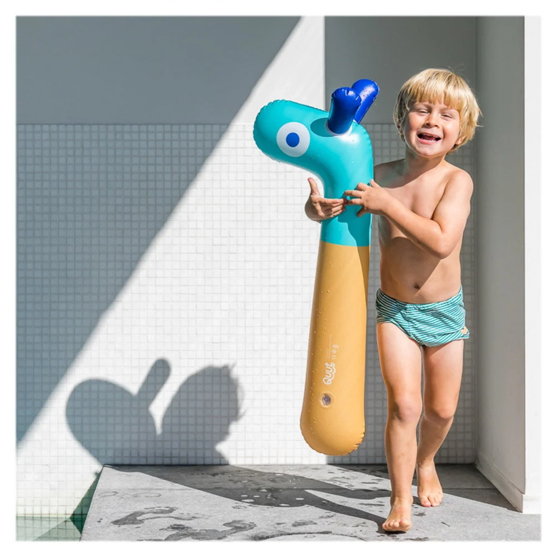 Fa cunostiinta cu noii tai prieteni gonflabili Dinozaurul Dino Noodle, Girafa Giraffe Noodle si Calutul Horse Noodle. Jucarii gonflabile perfecte atat pe uscat, ca o jucarie-bat de calarit, cat si pentru apa! Lasa-ti imaginatia sa zboare! Un calut, un dinozaur,o girafa de calarit sau o bagheta gonflabila pentru inot: totul este posibil cu noul tau prieten gonflabil! Aceste jucarii gonflabile sunt perfecte atat pentru uscat, cat si pentru apa , arunca-le in piscina si distreaza-te impreuna cu prietenii tai sau incaleca-i si galopeaza pentru o plimbare pe uscat! Jucaria gonflabila de piscina poate fi folosita atat in apa, cat si pe uscat ca un calut pentru calarit gonflabil. Este fabricata din vinil rezistent cu o grosime de 0.25 mm (cu aproximativ 30% mai gros decat majoritatea produselor de acelasi fel disponibile pe piata), reciclabil, non-toxic, fara ftalati si alti compusi daunatori. Este usor de umflat si construita pentru a rezista vara dupa vara, cu conditia sa fie ingrijita corespunzator. Vine livrata cu un plasture de reparare. Produsele Quut nu contin BPA, ftalati si latex, sunt reciclabile si respecta normele europene si internationale de siguranta a jucariilor si a folosirii substantelor chimice. Lungime: 85 cm Dimensiune cutie: 19 x 14 x 2 cm Varsta recomandata: 3 ani+ Jucaria gonflabila este disponibila in 3 variante de culoare si modele: Dino, Giraffe si Horse. Alege-ti preferata din lista de mai sus! Pretul afisat este pentru 1 jucarie gonflabila (o bucata). A se folosi numai in apa cu adancimea corespunzatoare copilului si sub supravegherea unui adult! Acesta nu este un dispozitiv de salvare! Nu lasati copilul nesupravegheat in timp ce se joaca in piscina cu aceasta jucarie. Jucariile Quut sunt produse cu scopul de a adauga distractie si frumusete in viata copiilor si a parintilor. Concepute cu materiale durabile si de cea mai inalta calitate, produsele Quut sunt construite pentru a rezista an de an. Castigatoare a multor premii de design, produsele Quut sunt total unice prin aspectul lor.