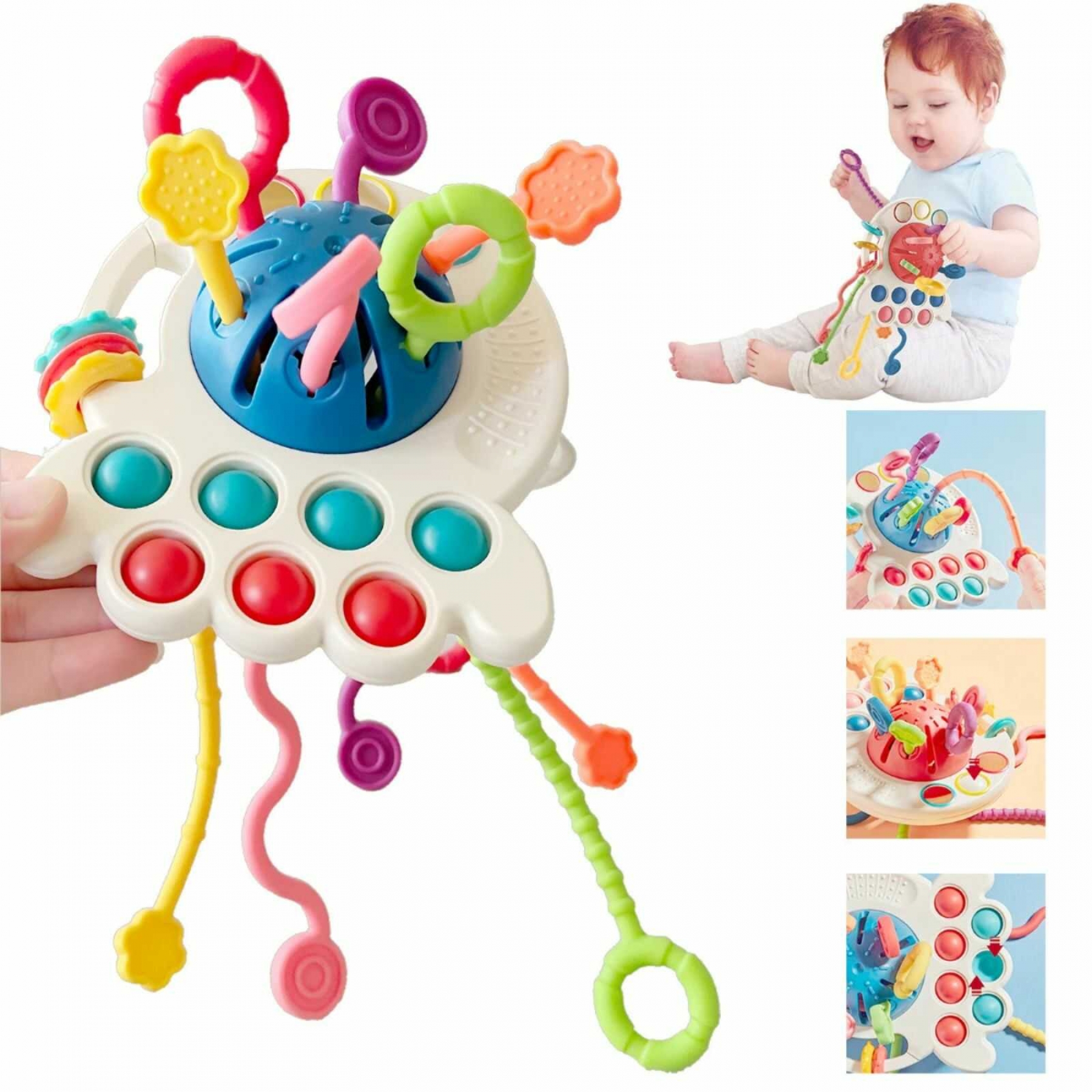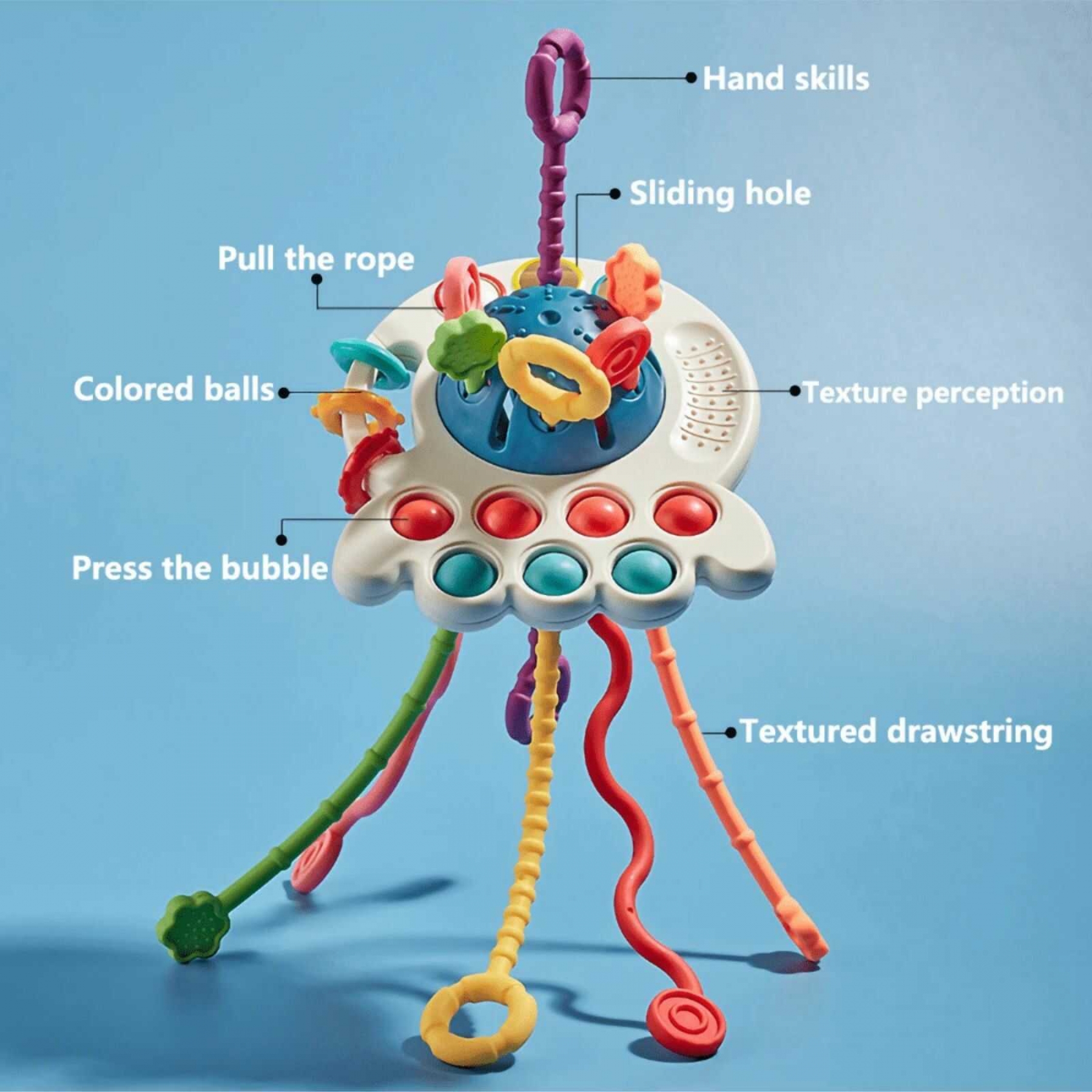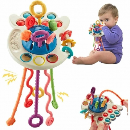 Descopera bucuria jocului si a explorarii cu Jucaria Senzoriala Montessori Caracatita Vesela , ideala pentru dezvoltarea abilitatilor motrice si pentru dentitia celor mici. Aceasta jucarie multisenzoriala este conceputa special pentru copii incepand cu varsta de 18 luni, oferind o varietate de activitati care stimuleaza simturile, promoveaza motricitatea fina si calmeaza gingiile sensibile in perioada dentitiei. Beneficiile Jucariei Senzoriale Caracatita Vesela : Dezvoltarea Motricitatii Fine : Cu trei moduri de joc , tragerea snururilor in sus si in jos, apasarea butoanelor si explorarea texturilor , aceasta jucarie ajuta la intarirea abilitatilor motorii si la dezvoltarea coordonarii mana-ochi. Stimularea simturilor : Texturile variate, culorile vibrante si sunetele emise de snururile trase in sus si in jos capteaza atentia copilului si ii stimuleaza simturile tactile si auditive. Jucarie pentru Dentitie : Fabricata din silicon alimentar sigur si non-toxic, jucaria este perfecta pentru a calma gingiile in perioada dentitiei, oferind o solutie naturala si sigura pentru mestecat. Portabila si usor de folosit : Dimensiunea compacta si designul usor fac din aceasta jucarie partenerul ideal pentru plimbari, calatorii sau momentele de relaxare in carucior, scaun auto sau pat. Caracteristici si Specificatii : Material : Plastic durabil si silicon alimentar, fara BPA Dimensiuni Jucarie : 27 x 13 cm Dimensiuni Cutie : 12.5 x 14 x 8 cm Varsta Recomandata : 18 luni+ Functionalitati : Tragerea snururilor, apasarea butoanelor, jocuri de textura si dentitie Culori si Texturi Vesele : Atractiva si educativa, ideala pentru stimularea simturilor copilului Siguranta : Muchii rotunjite si piese mari, potrivite pentru mainile mici ale copiilor De ce sa alegi Jucaria Senzoriala Montessori Caracatita Vesela? Aceasta jucarie Montessori nu doar ca ofera ore intregi de distractie, dar contribuie activ la dezvoltarea abilitatilor motorii fine si la stimularea simturilor. Perfecta pentru perioada dentitiei si pentru explorarea timpurie a lumii, Caracatita Vesela este usor de transportat, fiind alegerea ideala pentru calatorii si plimbari. De asemenea, culorile vibrante si texturile diverse il vor tine pe cel mic ocupat, promovand in acelasi timp invatarea prin joc. Alege Jucaria Senzoriala Montessori Caracatita Vesela pentru a oferi copilului tau un mod sigur, distractiv si educativ de a-si dezvolta abilitatile motorii si de a calma disconfortul dentitiei.