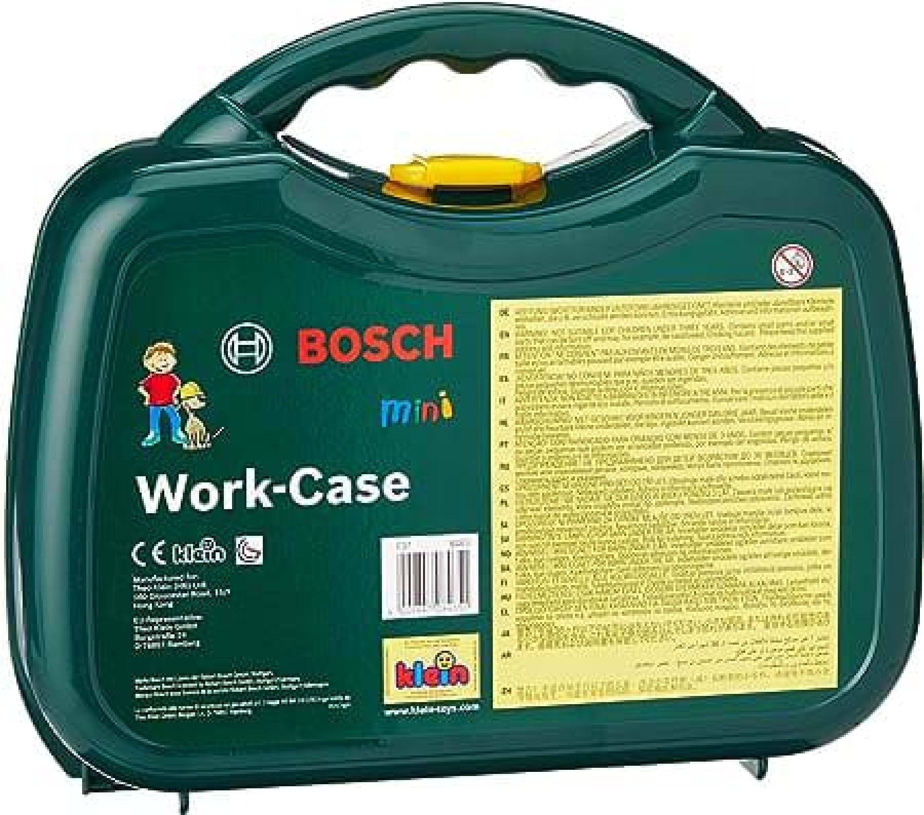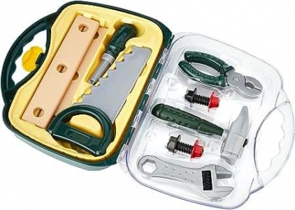 Jucarie - Trusa de scule Bosch mijlocie, cu maner practic si capac transparent pentru copii. Accesorii incluse: Fierastrau Ciocan Cleste Cheie franceza Sipci, suruburi si surubelnita Dimensiuni: 27,5 x 9,5 x 23 cm. Greutate : 606 gr Varsta recomandata: 3 ani+ Avertisment: Produsul contine piese mici si necesita supravegherea unei persoane adulte. Va rugam sa indepartati ambalajul produsului inainte de a da jucaria copilului. A se folosi sub directa supraveghere a unei persoane adulte.