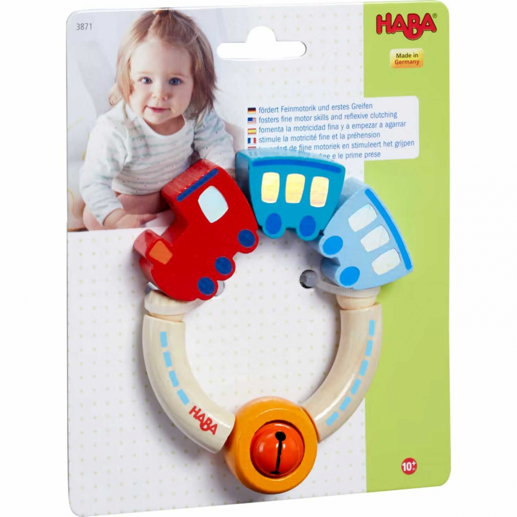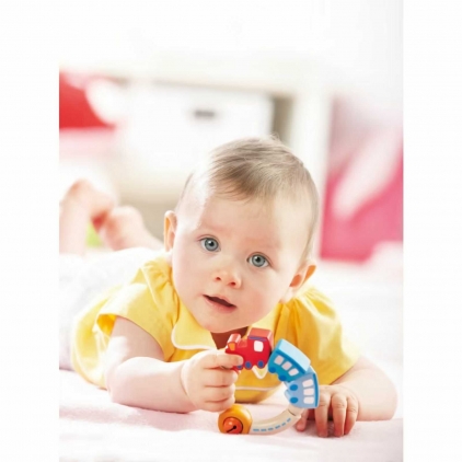 Cu jucaria de prins Bimmelbahn de la HABA, copiii pornesc intr-o calatorie de descoperire in tara culorilor, a formelor si a sunetelor. Jucaria de prins este formata din diferite elemente din lemn care sunt conectate cu o banda elastica durabila si pot fi miscate. Clopotelul amuzant, precum si locomotiva si cele doua vagoane, proiectate cu drag, invita la apucat, jucat si descoperit. Poate ca parintii vor canta cantecul caii ferate impreuna cu el. Atunci cand clopotelul suna in ritmul locomotivei, nu mai exista nicio oprire pentru cei mici. Toata lumea la bord, va rog! Trenul distractiei este pe drum! Caracteristici: Model: Trenulet Functie: inele zornaie Varsta recomandata: 10 luni Greutate produs: 81 g Diametru: 10 cm Latime: 10 cm Material: poliester, artar, metal, fag Avertismente! Nu lasati ambalajele jucariilor produselor la indemana copiilor. Indepartati orice ambalaj al jucariei produsului inainte de a da jucaria produsul copilului. Va rugam sa supravegheati copilul in timp ce se joaca foloseste acest produs. Pastrati instructiunile si etichetele pentru referinte viitoare. Pastrati jucaria produsul departe de foc, feriti jucaria produsul de temperaturi ridicate si umiditate. Imaginile au caracter informativ. Nuanta, tonul si intensitatea culorii pot varia in functie de monitor.