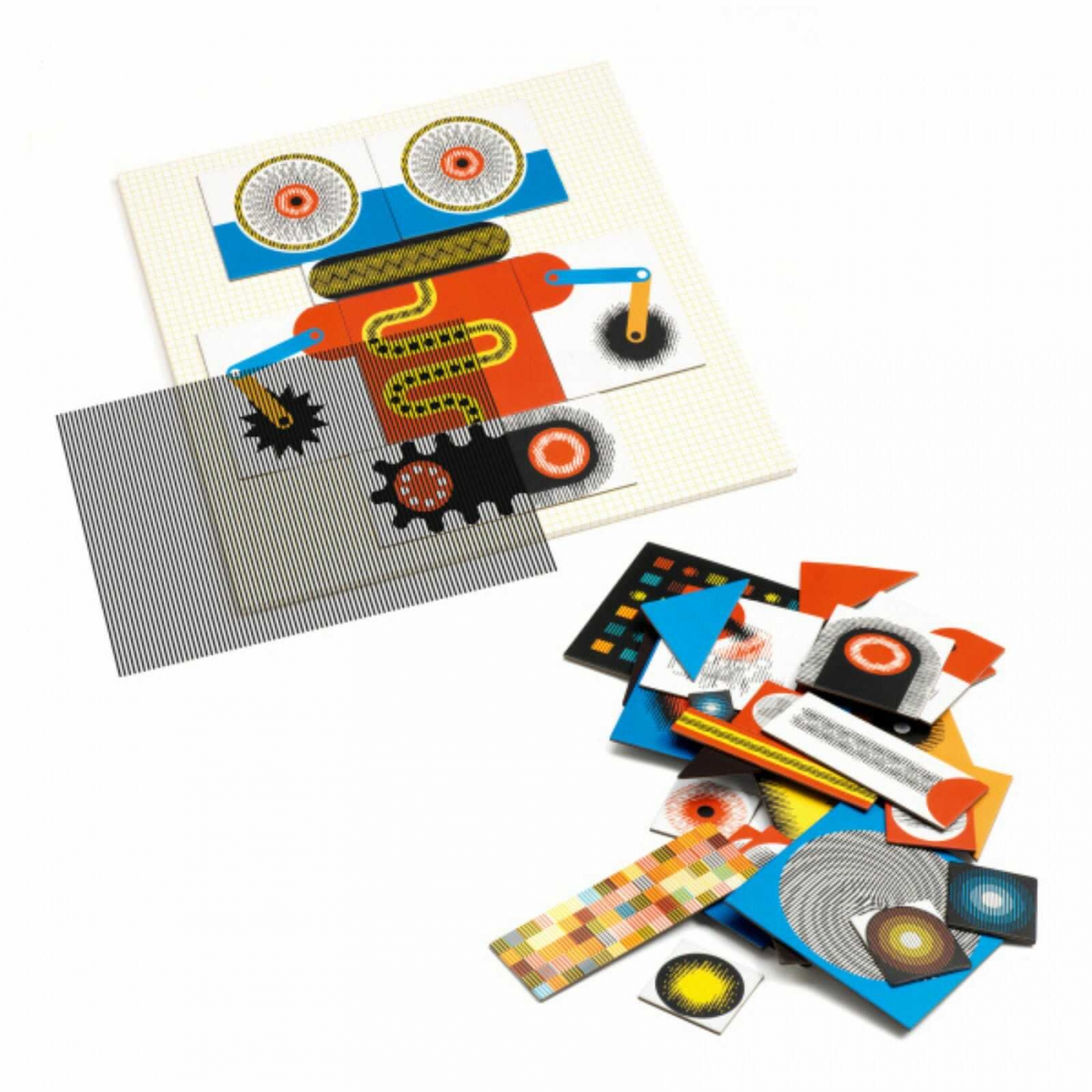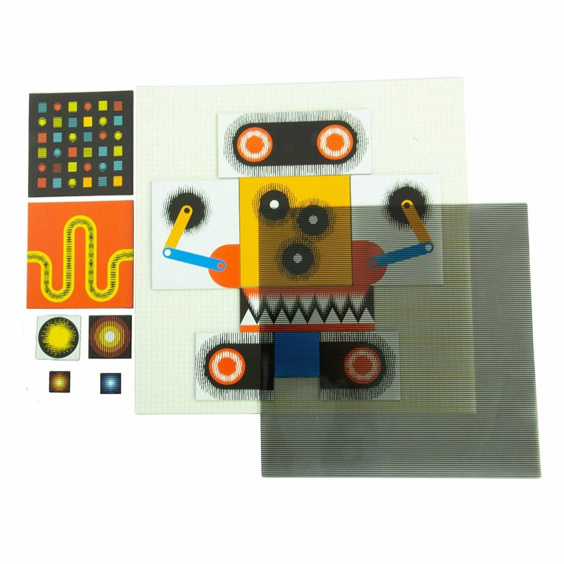 Un joc distractiv de imaginatie, constructie si animatie! Copiii proiecteaza si creeaza roboti aiuriti combinand partile magnetice de pe tabla - exista mii de combinatii din care sa aleaga! Prin miscarea filtrului optic, ei pot face robotii sa prinda viata si sa se miste in moduri magice si neasteptate. Brosura de instructiuni inclusa pentru indrumare. Joc care stimuleaza imaginatia : copilul construieste forme noi si le adapteaza dupa functionalitate. Joc de indemanare : copilul asambleaza pe plansa de lucru formele dupa model sau liber. Joc de animatie : cu ajutorul filtrelor se creeaza efecte optice dinamice. Un exercitiu de creativitate si logica. O multime de piese pentru ore de joaca! Continut : tabla magnetica (30 x 30 cm), 2 filtre optice (24 x 24 cm si 19 x 19 cm), 60 piese de magnetice, brosura cu instructiuni. Varsta recomandata : 6-10 ani. Confectionat din materiale non-toxice, conform reglementarilor EN71ASTM. AVERTISMENT: Contine magneti! Contraindicat copiilor sub 3 ani, contine piese mici, pericol de sufocare. A se utiliza sub directa supraveghere a unui adult. Producator: Djeco, Franta