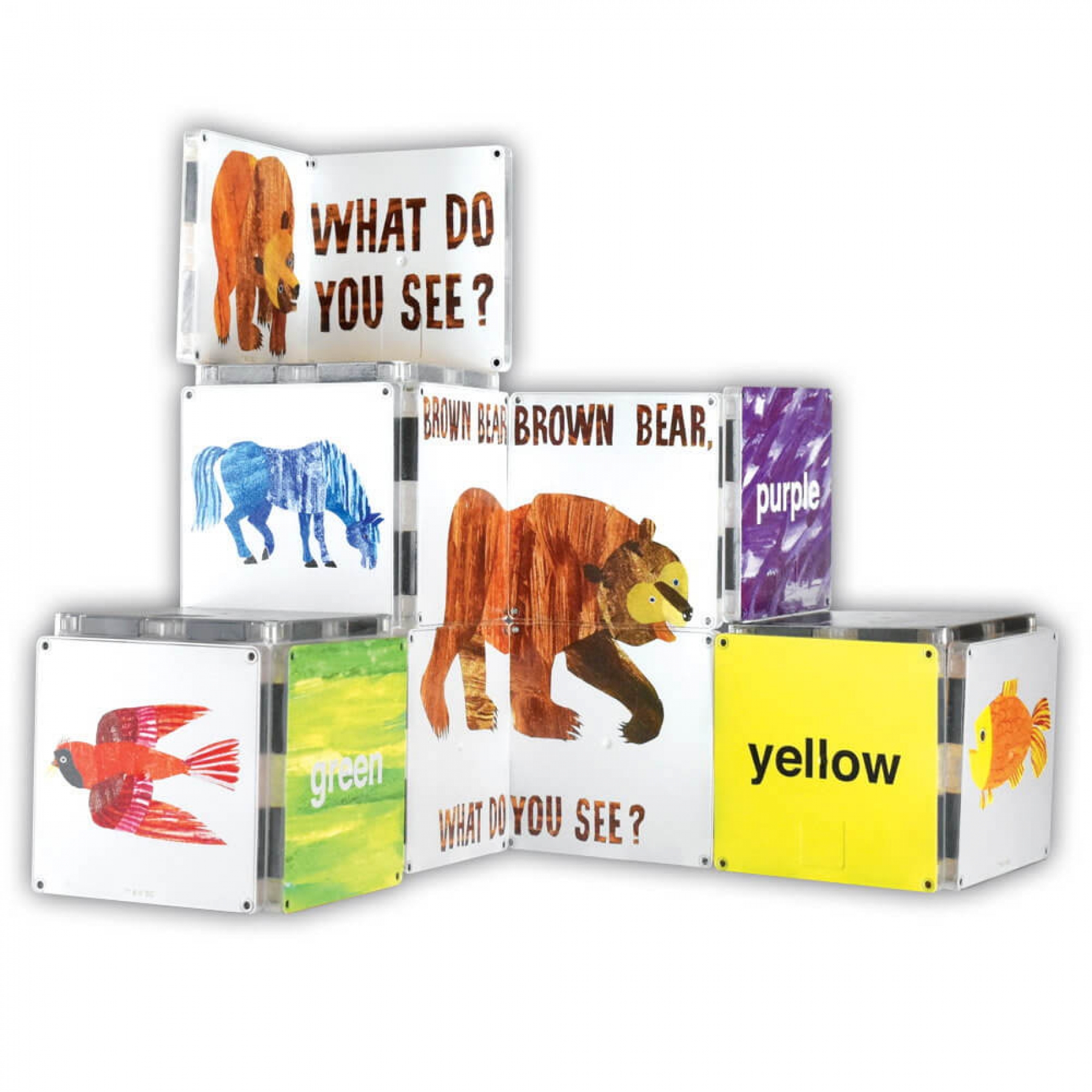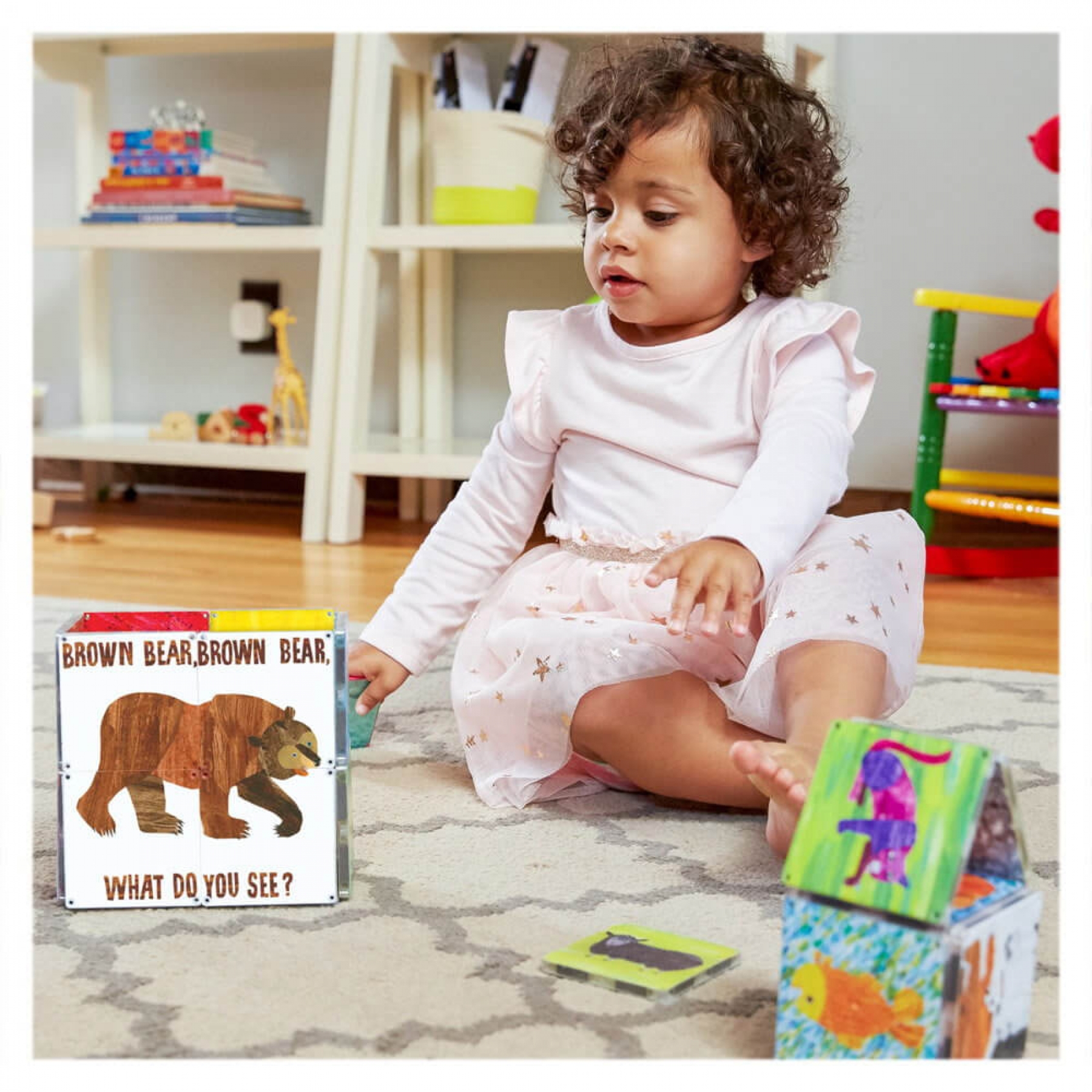 Pregateste-te sa inveti numele si culorile animalelor, sa reconstitui povestea sau sa creezi propria ta versiune cu aceste minunate placi magnetice, cu ilustratii bogate si intens colorate! Ursule brun, tu ce vezi?, de la CreateOn este un set de placi magnetice de constructie originale Magna-Tiles, imprimate cu desenele exuberante reprezentand animale, culori si personaje din indragita carte clasica a lui Eric Carle. Setul poate fi folosit independent sau ca o activitate care completeaza cartea clasica, ajutand la invatarea si explorarea povestii Pe baza setului, micutii vor invata numele animalelor, culorile si cum sa aranjeze animalele in aceeasi ordine in care sunt introduse in carte. In plus, setul dezvolta abilitatile de repovestire si secventiere a povestii, incurajeaza creativitatea si imaginatia, promoveaza lectura, incurajeaza abilitatile lingvistice, prin adevarate opere de arta inspirate de povestea clasica. Toate piesele sunt imprimate pe ambele parti folosind tehnologia SuperColor. Prima parte include un puzzle din patru piese, animale si personaje din carte, in timp ce partea a doua prezinta culorile si denumirile acestora. Contine 16 placi magnetice patrate , inclusiv o piesa minunata de tip oglinda care completeaza setul. Setul este compatibil cu toate seturile Magna-Tiles Structures si cu toate seturile originale Magna-Tiles, fiind un supliment extraordinar pentru orice colectie de seturi magnetice. Setul dezvolta abilitatile STEM, matematice si stiintifice, rationamentul spatial, abilitatile motorii fine, tactile, coordonarea ochi-mana, imaginatia, creativitatea, abilitatile de rezolvare a problemelor. Seturile magnetice de constructie Magna-Tiles sunt sigure pentru copii, nu contin BPA, ftalati, PVC, latex sau materiale toxice, respectand standardele internationale de calitate si siguranta CE, EN71, ASTM si CPSIA. Placile Magna-Tiles au un design complet sigur pentru a proteja copiii. Fiecare bloc este sudat sonic pentru a mentine magnetii in interior. Seturile CreateOn au fost concepute avand in vedere distractia, calitatea si siguranta, din materiale de cea mai inalta calitate pentru a incuraja jocul fara ecran si pentru a oferi copiilor o experienta de invatare practica cat mai reusita. Piesele sunt create cu desene atractive si culori indraznete si vii, care capteaza atentia copiilor si au fost special concepute pentru a fi usor de manevrat fara frustrare, de catre mainile micute ale copiilor. Varsta recomandata: 3 + ani Avertismente de siguranta: Atentie! Nerecomandat copiilor mai mici de 3 ani. Produsul poate contine piese mici care se pot inghiti sau inhala, existand pericolul de sufocare. Nu lasati ambalajele produselor la indemana copiilor, indepartati toate ambalajele inainte de a oferi jucaria copilului. Jucaria contine magneti sau componente magnetice. Magnetii care se lipesc unul de celalalt sau se ataseaza de un obiect metalic in interiorul corpului uman pot provoca accidente grave sau mortale. Cereti imediat asistenta medicala in cazul in care magnetii sunt inghititi sau inhalati.